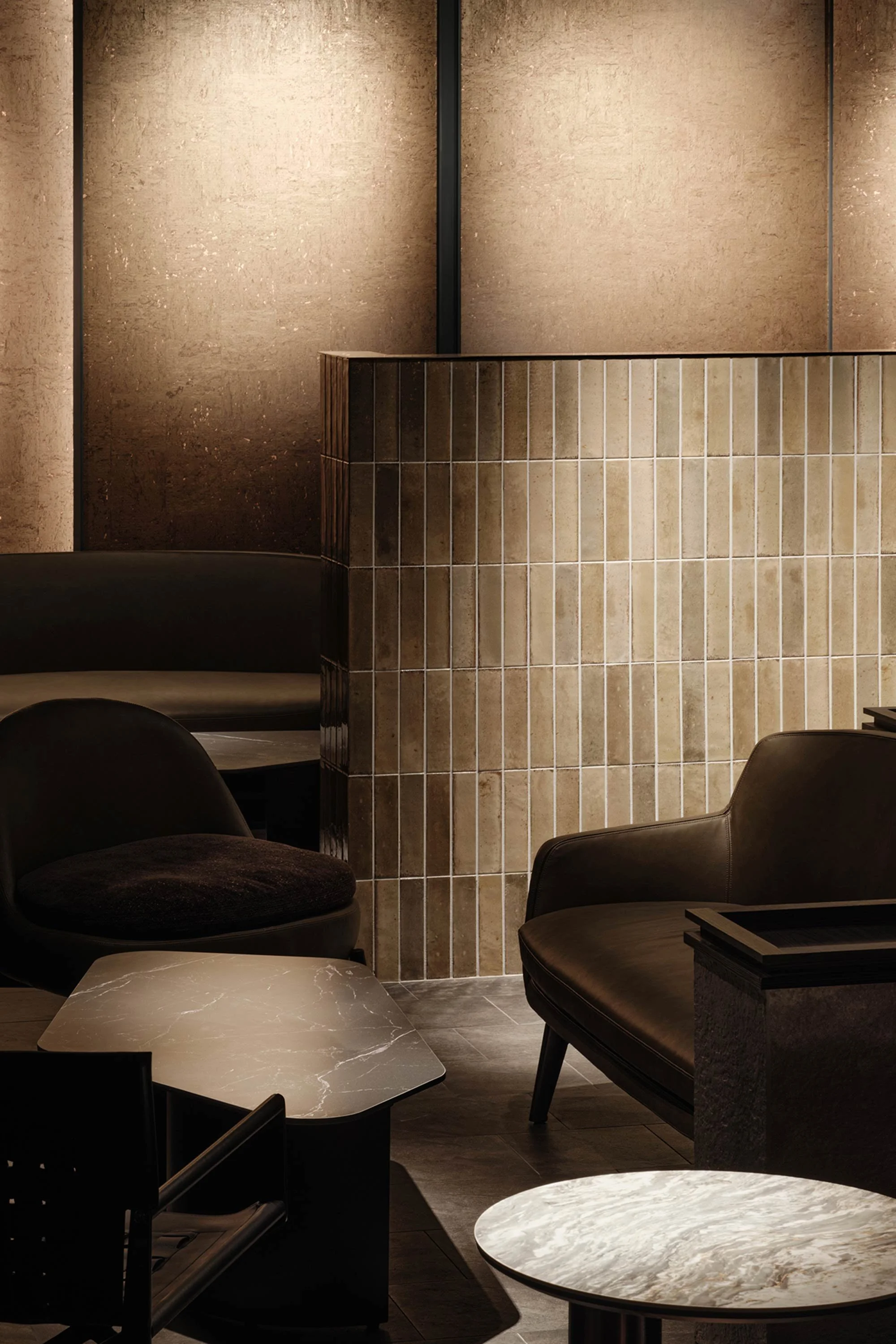 Materiality was, clearly, key to the scheme: the coated wall and marble countertop were designed to echo the warmth and richness of well-aged whiskey and barrels, in turn reinforcing the concept of time-honoured craft. ‘We also paid close attention to the relationship between privacy and visibility. The use of metal-mesh window screens allows light and shadow to interact dynamically, creating a balance between openness and seclusion,’ she adds. For the designer, the arched doorways are a standout, as is the way the lighting and texture work together. ‘I love how the soft lighting reflects off the patina-rich archways and textured walls — it highlights the natural imperfections and makes the space feel full of history and depth.’