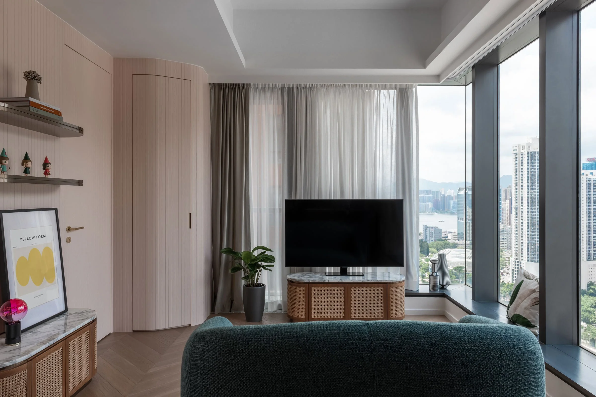 Curves feature throughout the space, and I especially love the curvy feature wall with concealed storage cabinets in the living and dining room — it makes the space flow naturally.