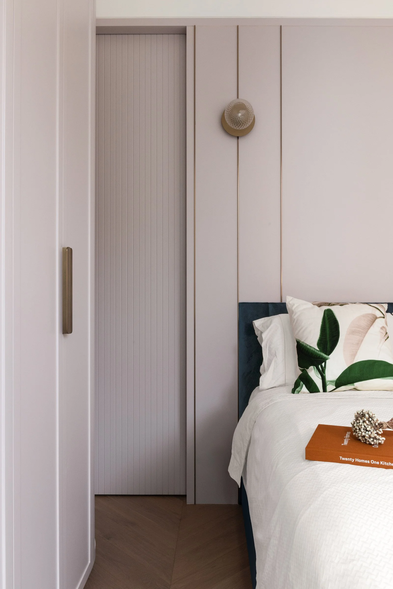 First, we combined the two small bedrooms to make one bigger main bedroom. We also replaced the kitchen wall with transparent glass to make the space feel bigger and more connected to the dining room. Finally, we opened up the bathroom on both sides to draw in more natural light and also allow guests to access it from the living room.
