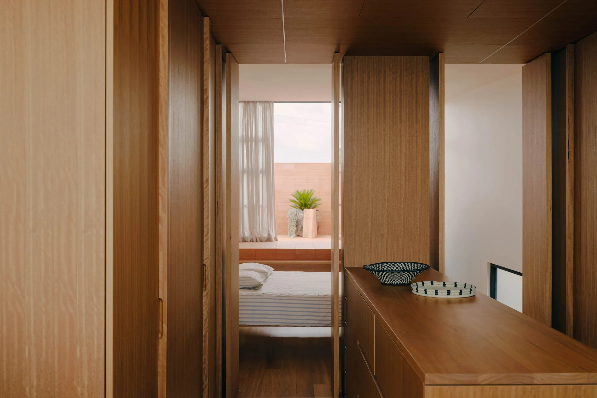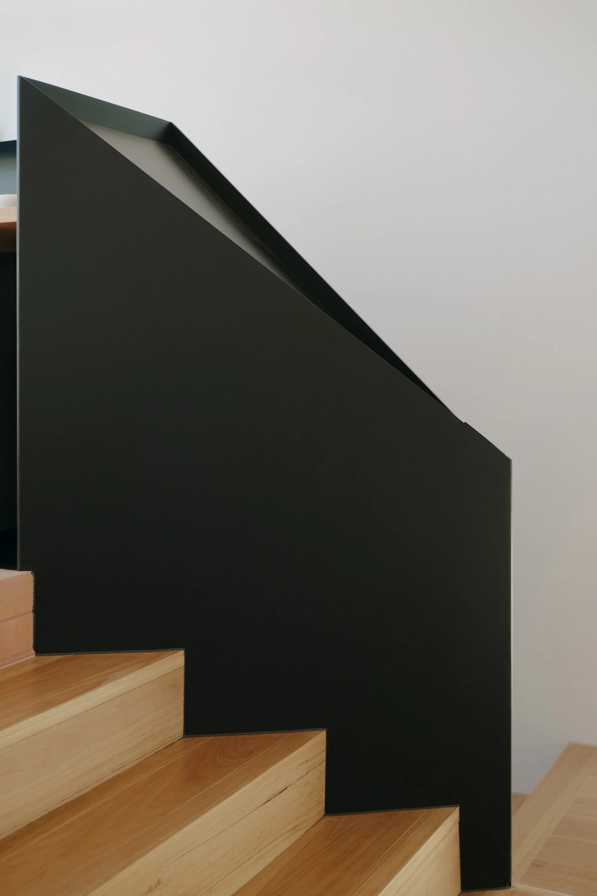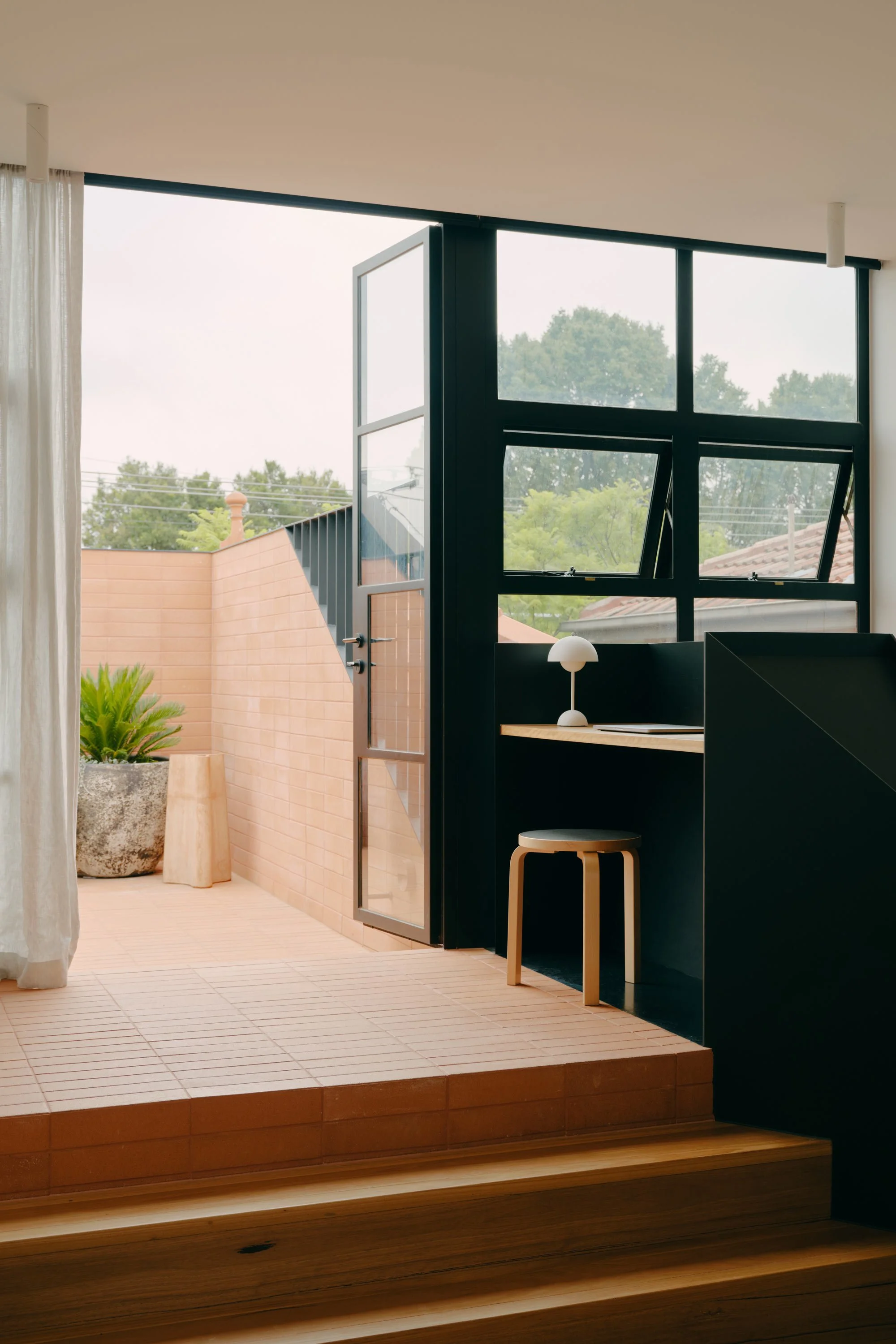 In the adjoining main living area, the designer points out, the feature ‘material’ is natural light. ‘The clerestory windows mean there’s no need to turn on any lights during the day,’ Olaver says. Here, the balustrade is a feature. ‘It’s a folding piece of origami fabricated by steel artist Gonz. It elevates the mundane function of the stair, and as it folds up to form a study desk adjoining the roof deck it ties function and beauty.’ On the rooftop deck itself, terracotta tiles echo the interior and continue through to the main bedroom’s en-suite bathroom, with honey-toned blacktop joinery complementing the terracotta materiality to create warmth through the sleeping space. It’s a compelling way to come home.