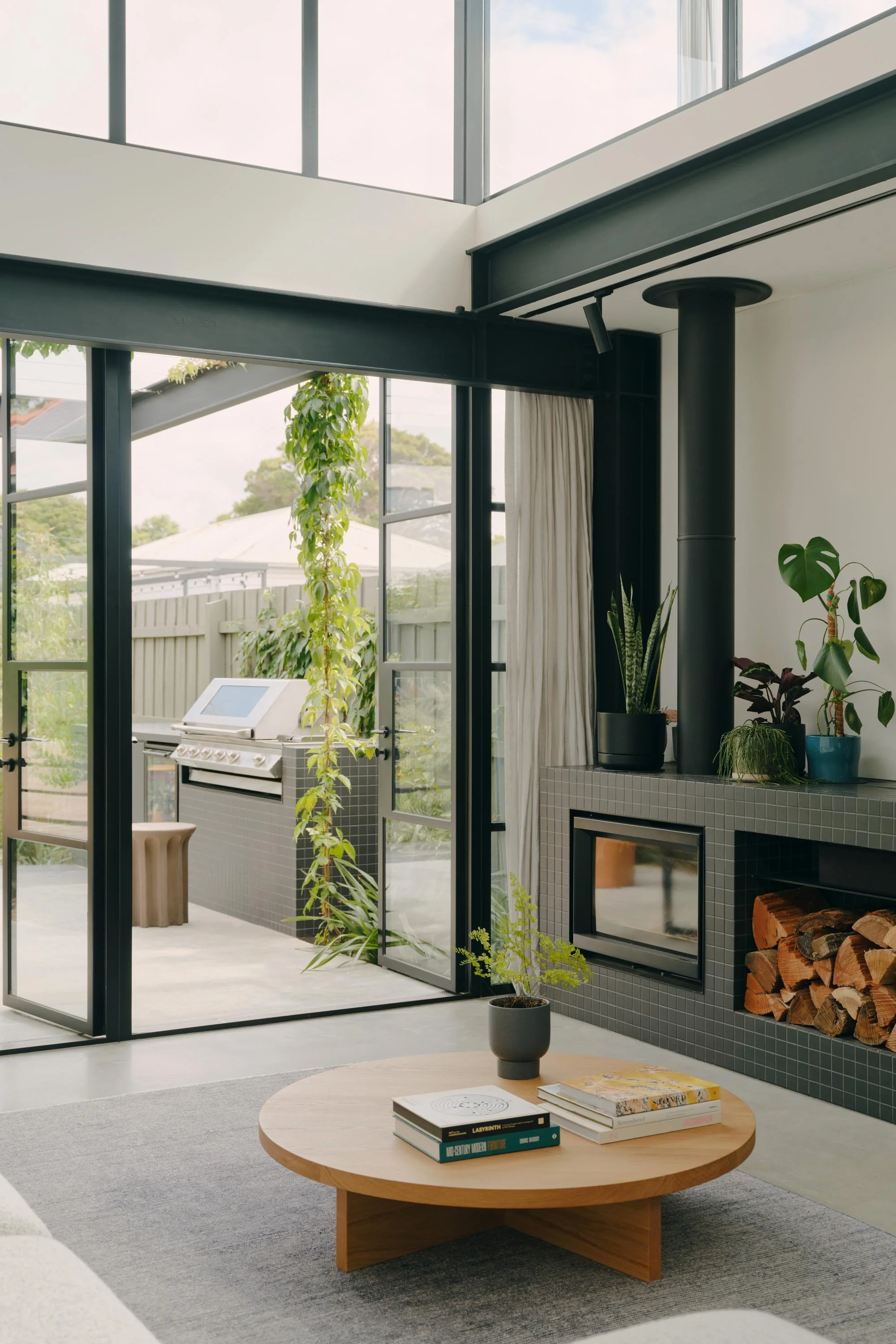 Spatial planning was paramount. ‘Architecturally, we sought to bring light in and create a cohesive flow between private and public spaces,’ Olaver says. To this end, the rear of the home was demolished in favour of a new open structure, with steel framing beginning in the new living space and continuing to the rear deck. ‘The black steel windows and expressed steel structure were the framework from which the rest of the project bounced off, providing a sense of both the industrial and heritage,’ he adds.