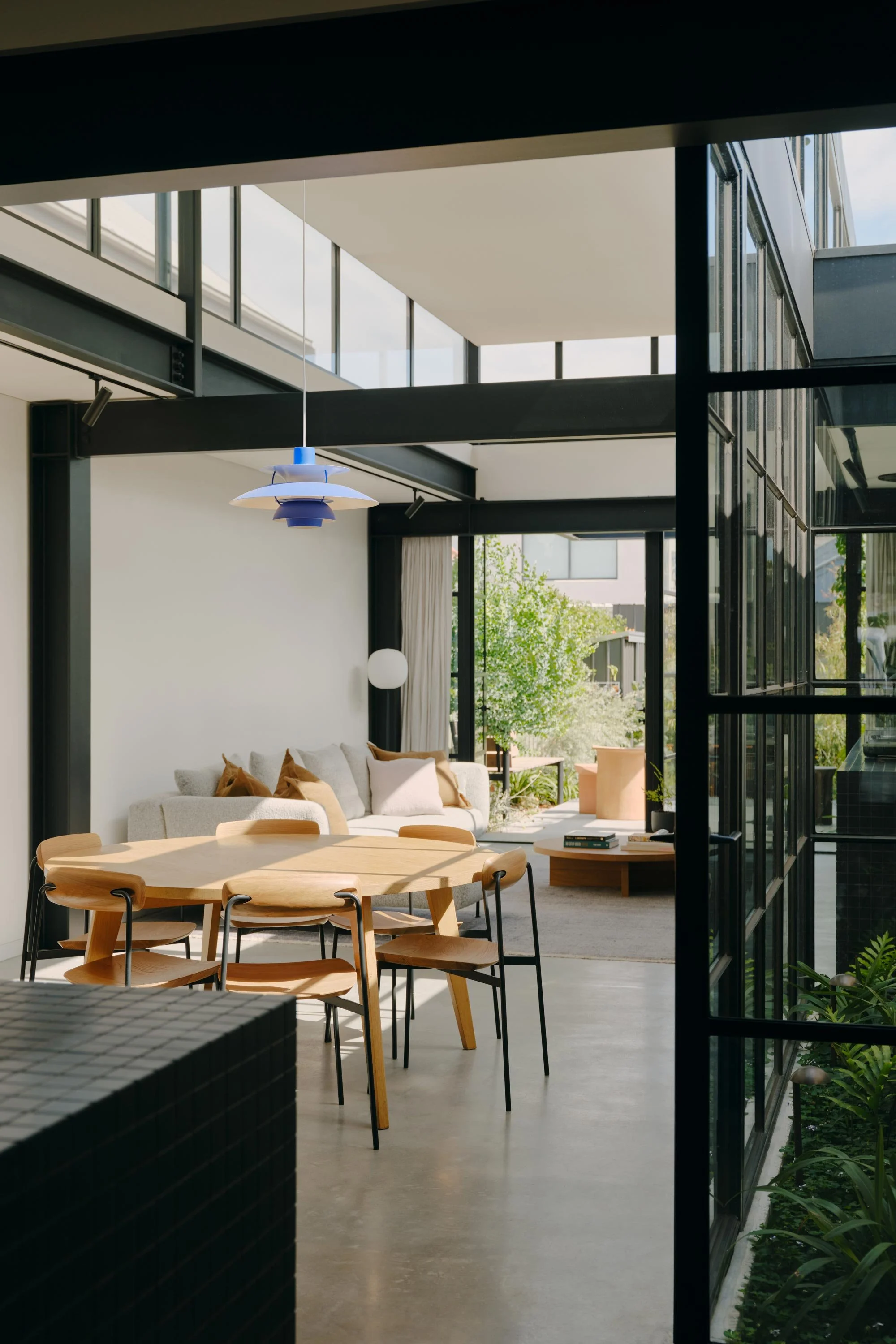 Inside, black Japanese tiles from Artedomus for the kitchen island, credenza unit and outdoor kitchen reflect the gridded steel windows at a finer scale ‘and with texture you can touch throughout the day’, says Olaver. The theme continues with the fine lines of black steel Agape tapware. Accents provide visual touchpoints, with a classic PH 5 pendant in Yves Klein blue for the dining area.