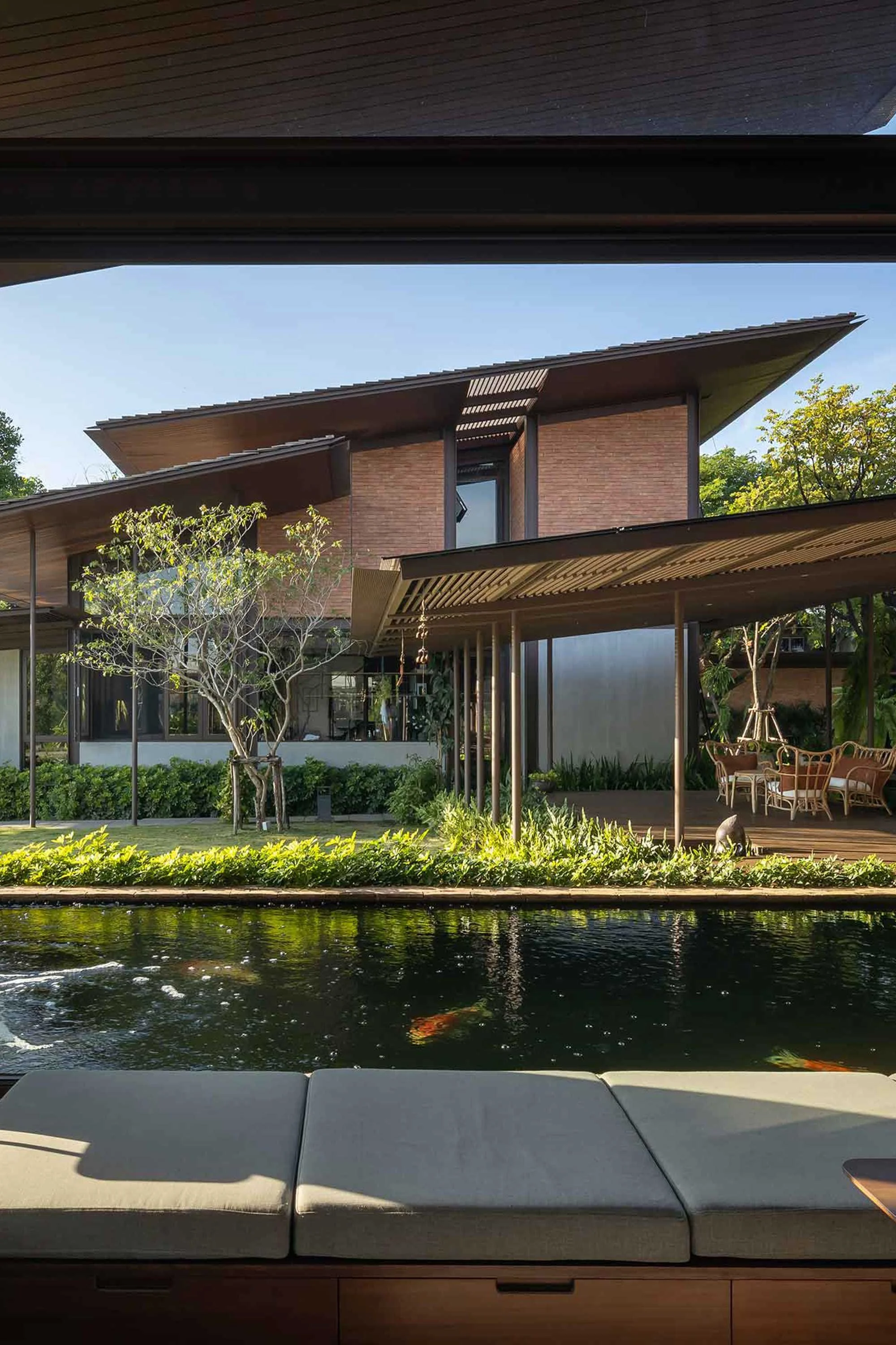 The pond was also one of the architects’ additions. ‘Initially, the property had no water features, but we suggested creating a large natural lake at the front of the house,’ says Duangkaew. ‘This would offer an open water view reminiscent of the client's childhood seaside home.’ The earth excavated in the process was used to create a hill that provides privacy and a visual landmark on approach. On the remaining land, the team created vegetable gardens and a chicken coop, allowing the family to grow their own food. Around the edges of the water, aquatic plants retain water and prevent soil erosion, while below the surface, fish and other water creatures attract birds and insects from the nearby public garden, enhancing the ecosystem and providing a genuine natural escape in the heart of a metropolis.