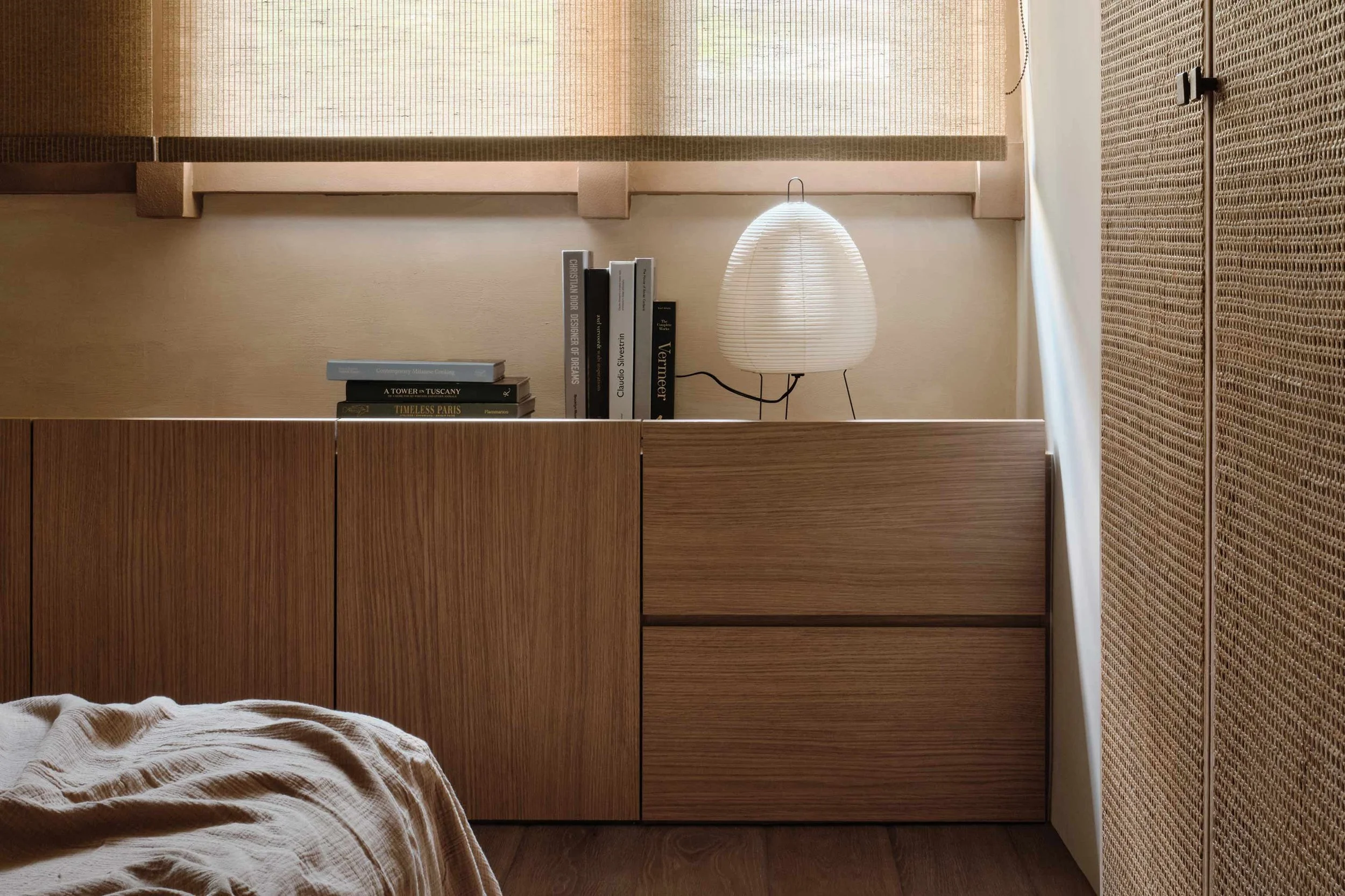 In the bedroom, custom rattan screens create visual interest in the minimal space, with the paper lanterns echoing the curves of the windows. ‘I enjoy how the home seamlessly blends comfort and tranquillity,’ Chien notes. ‘The preservation of the old architectural elements not only adds historical depth but also creates a serene ambience.’