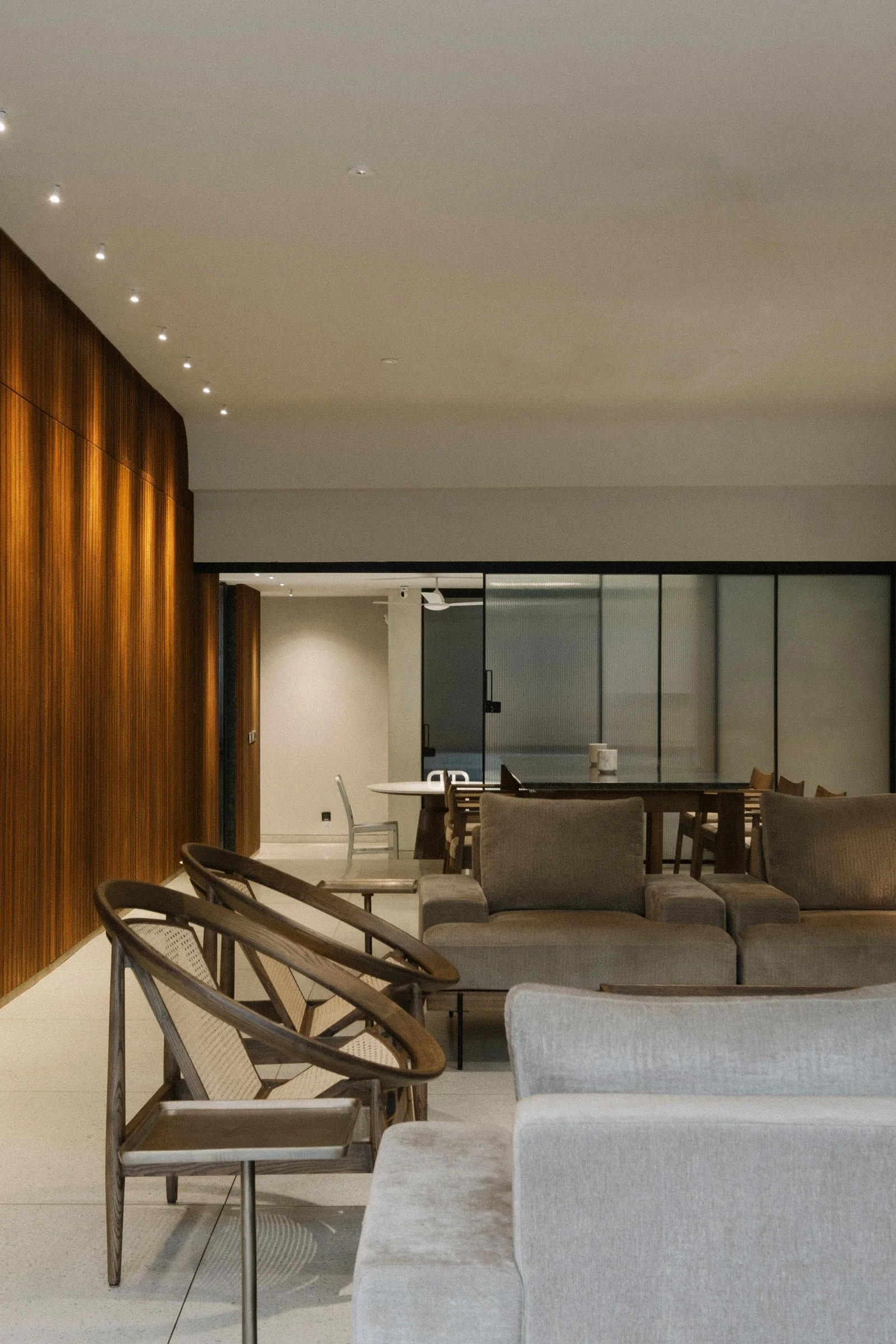 We like how the house has opened up spatially and visually, maximising the light and creating a continuous ribbon of living spaces. The fluted wooden wall, the handmade texture on the walls and the monochrome terrazzo are some of our favourite details. We feel that the simplicity and functionality of the spaces together with the clean construction details reflect our firm's work and style.