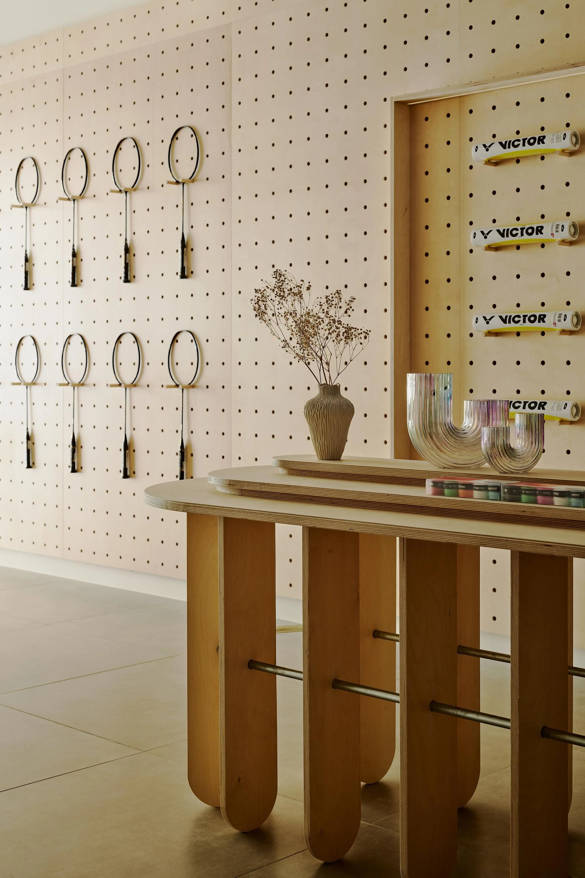 The design scheme was based on a few elements, most prominently the material pairing of natural wood grains and matt metallic finishes. ‘The warm textures of wood symbolise heritage and craft, while the sleek, brushed metal conveys modern precision and speed — both essential attributes of badminton as a sport,’ explains Chen. ‘The interplay of these contrasting materials creates a kind of harmony between legacy and innovation.’