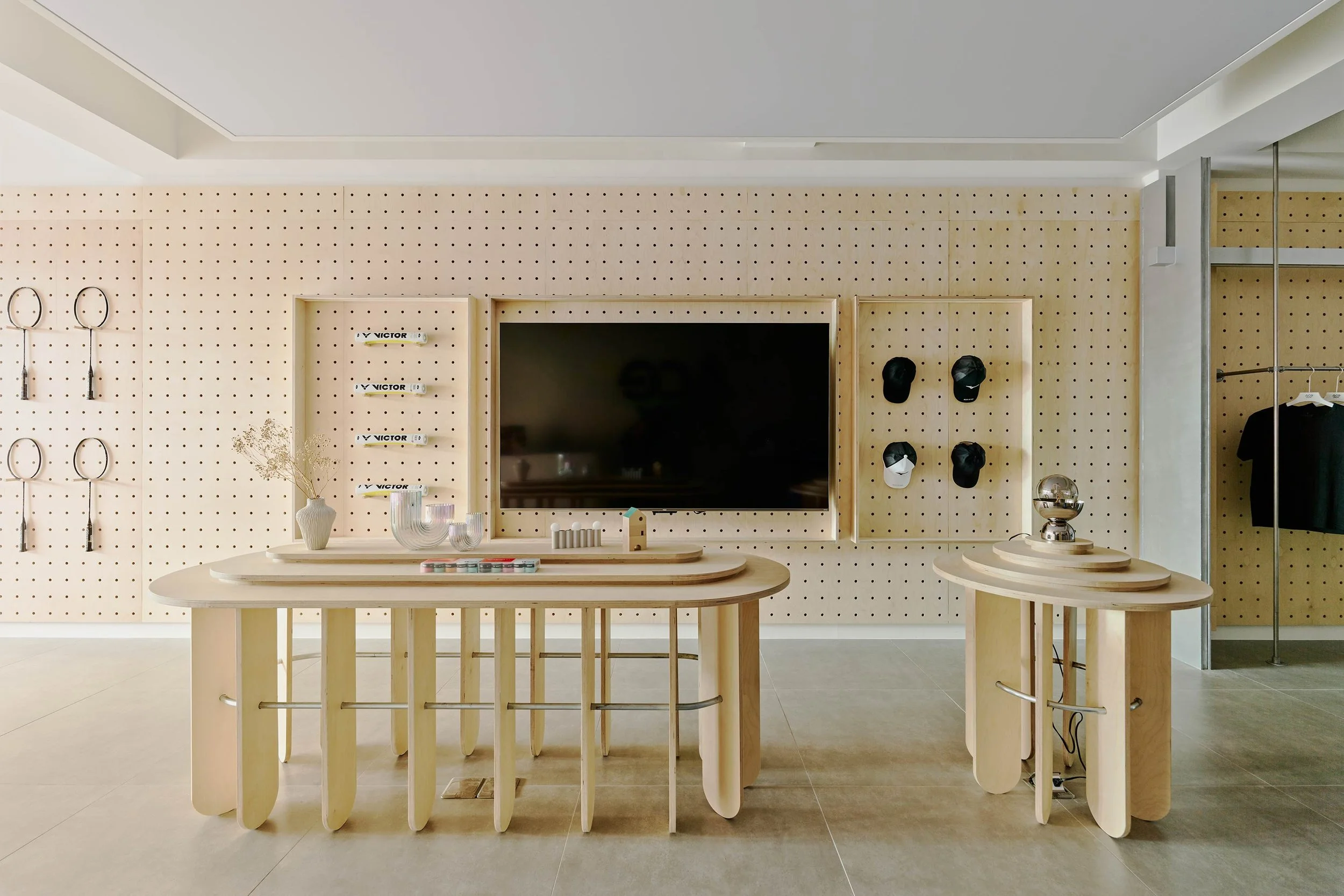At the centre of the store, a striking display island draws inspiration from the layered structure of a shuttlecock, its geometric arrangement evoking the dynamic energy of the sport. The interplay of stacked forms and staggered levels creates a sculptural yet functional retail fixture.