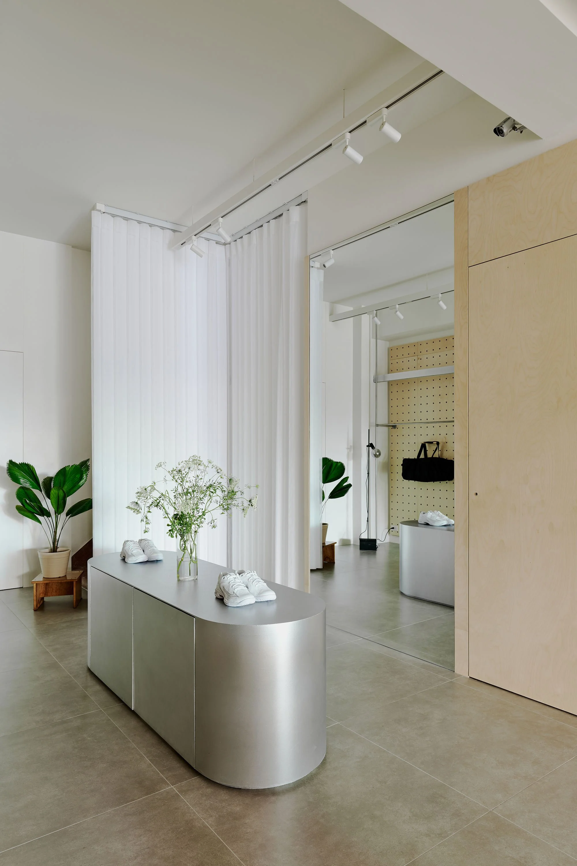 On the walls, perforated modular display panels offer both adaptability and an aesthetic reference to the meticulous stringing patterns of badminton racquets. Above, the ceiling integrates a translucent light membrane, which conceals the mechanical services while preserving the lofty openness of the original structure. ‘The uniform illumination that this membrane provides softens shadows and highlights product details, establishing an ethereal ambience that further enhances the material palette,’ Chen says.