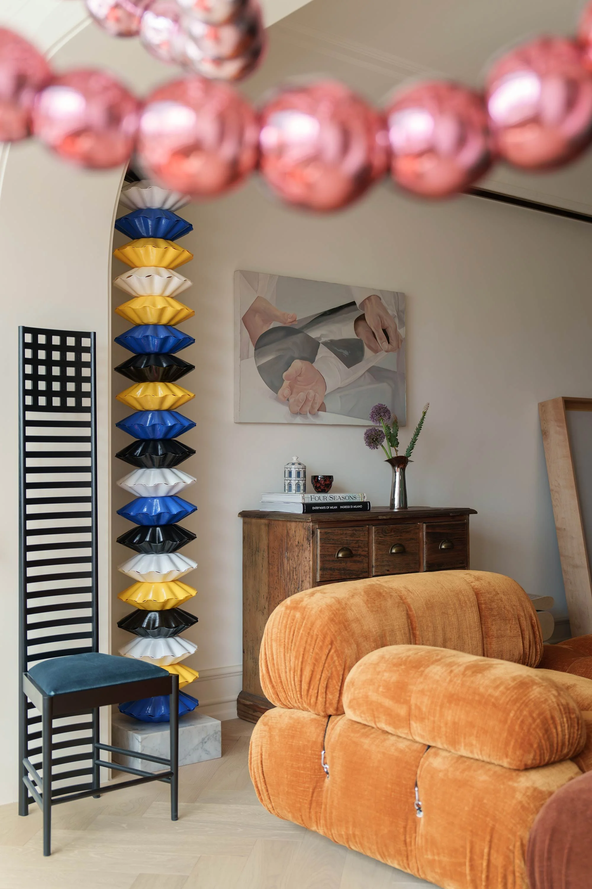 What resulted is a space replete with organic and whimsical touches, from rounded forms in the structure and furniture to unexpected materials and patterns. ‘We used consistent floor and ceiling profiles throughout all spaces,’ says Wang. ‘But each space is unique in its colour palette and material selection.’ The living room is earth-toned, with cream wall paint as the base, complemented by B&B Italia Camaleonda sofas in vintage textures and American artist Leslie Hewitt’s Untitled (delicate) on one side. ‘Its scenes and tones resonate interestingly with the surrounding space,’ says Wang.