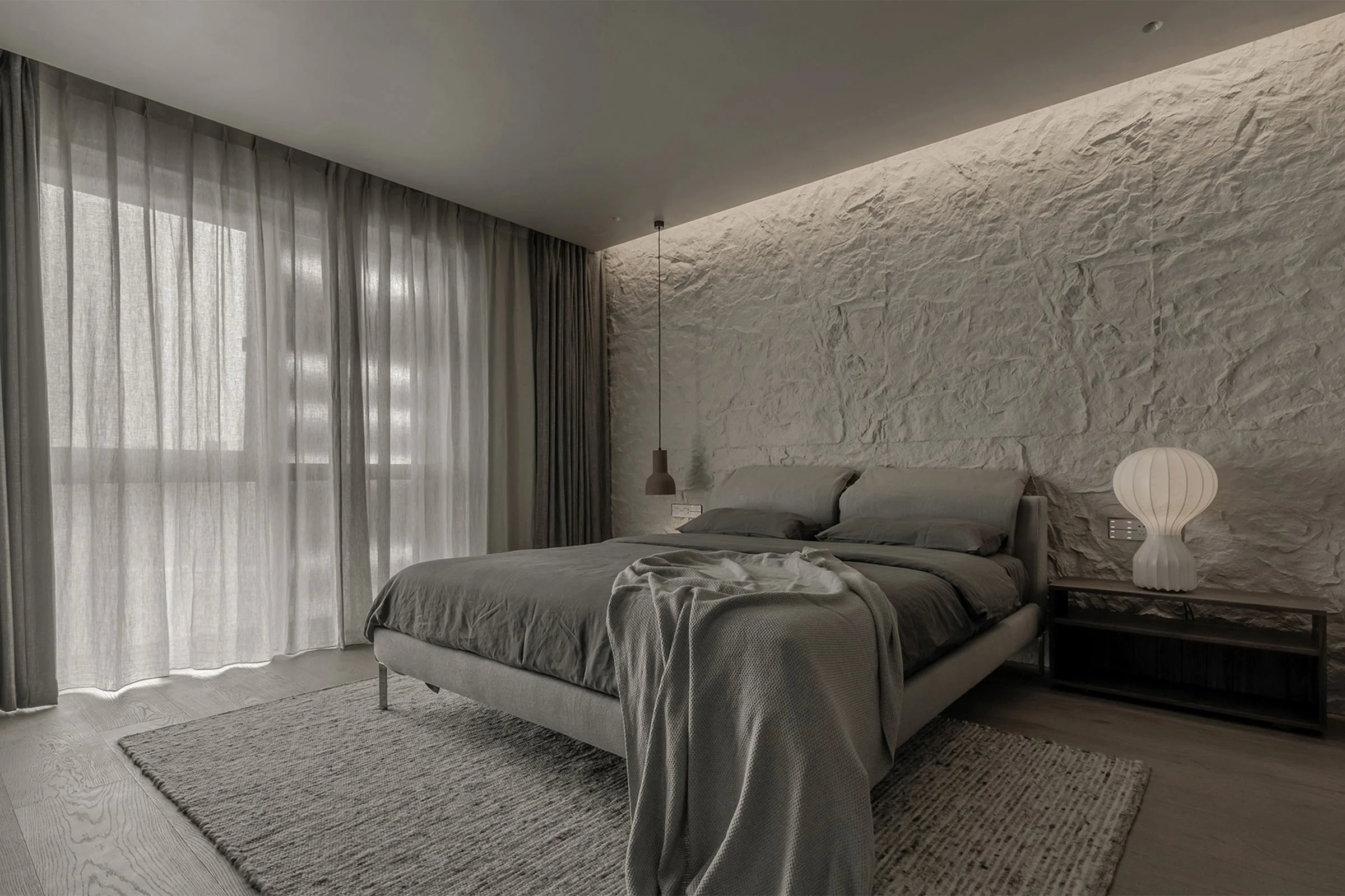 We also love the background wall in the master bedroom. It’s made of an artificial material that imitates the texture of stone, which we painted with a latex paint from the French brand Ressource. The final result is quite tranquil and in the style of wabi-sabi.