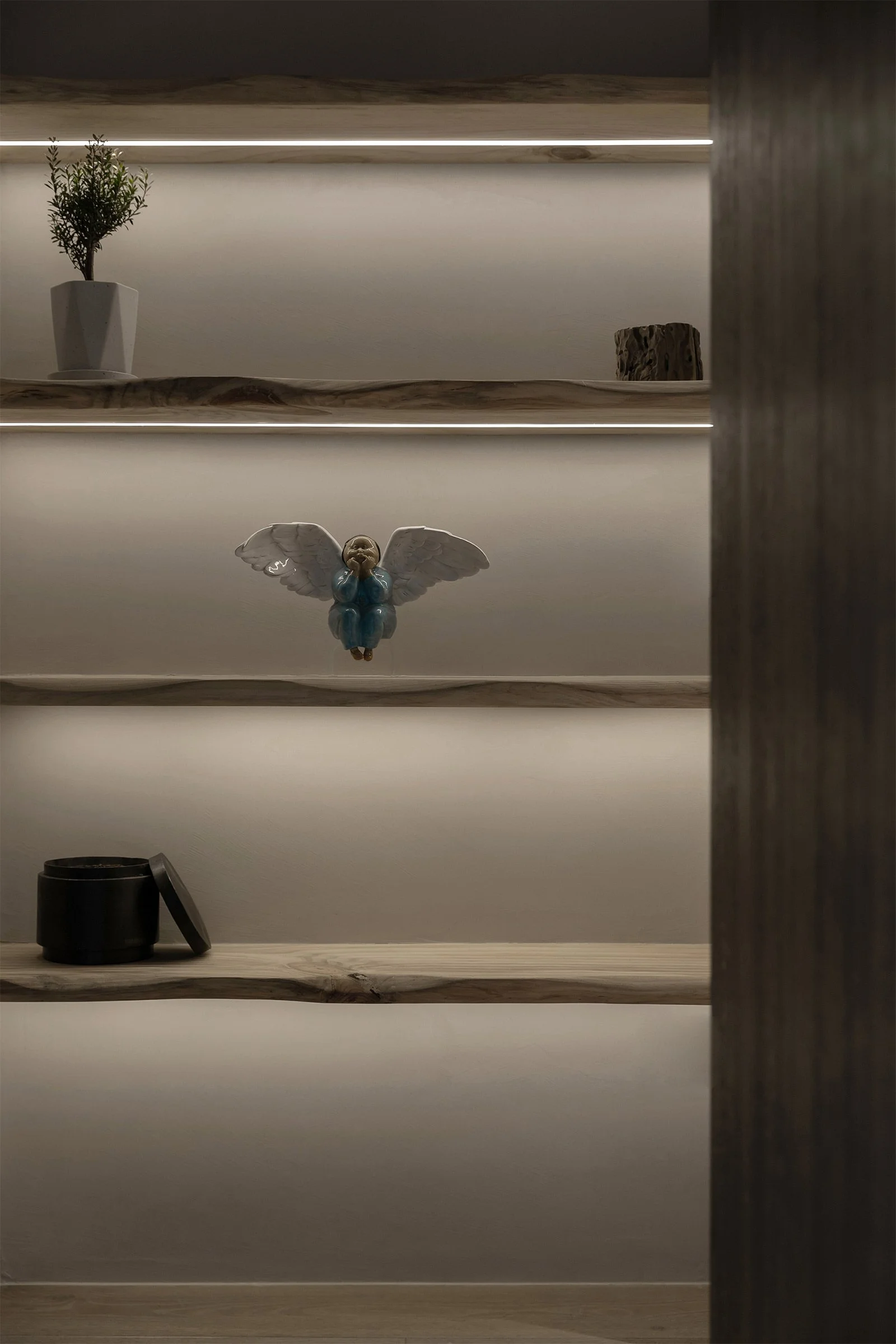 There are many customised pieces in the space, including the two circular Changhong glass windows we specially designed for the Buddhist shrine and the TV cabinet in the living room.