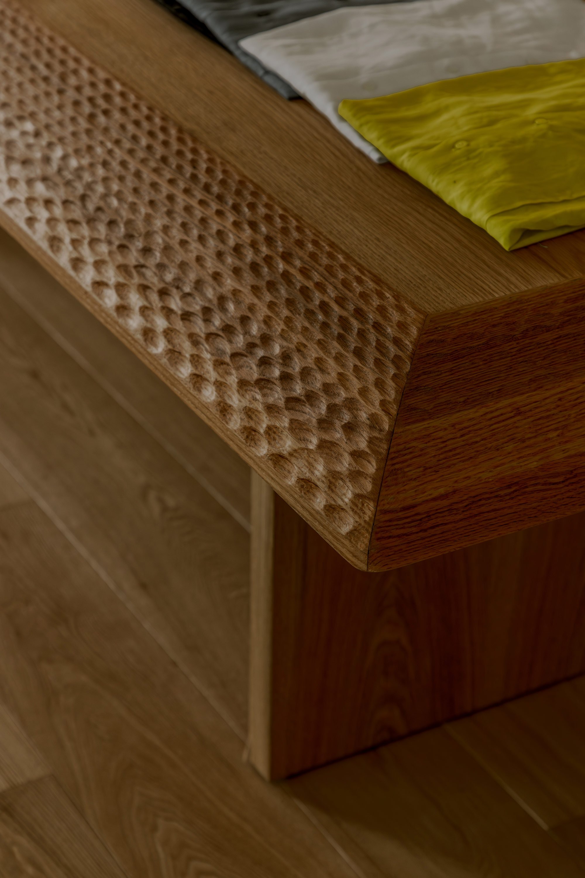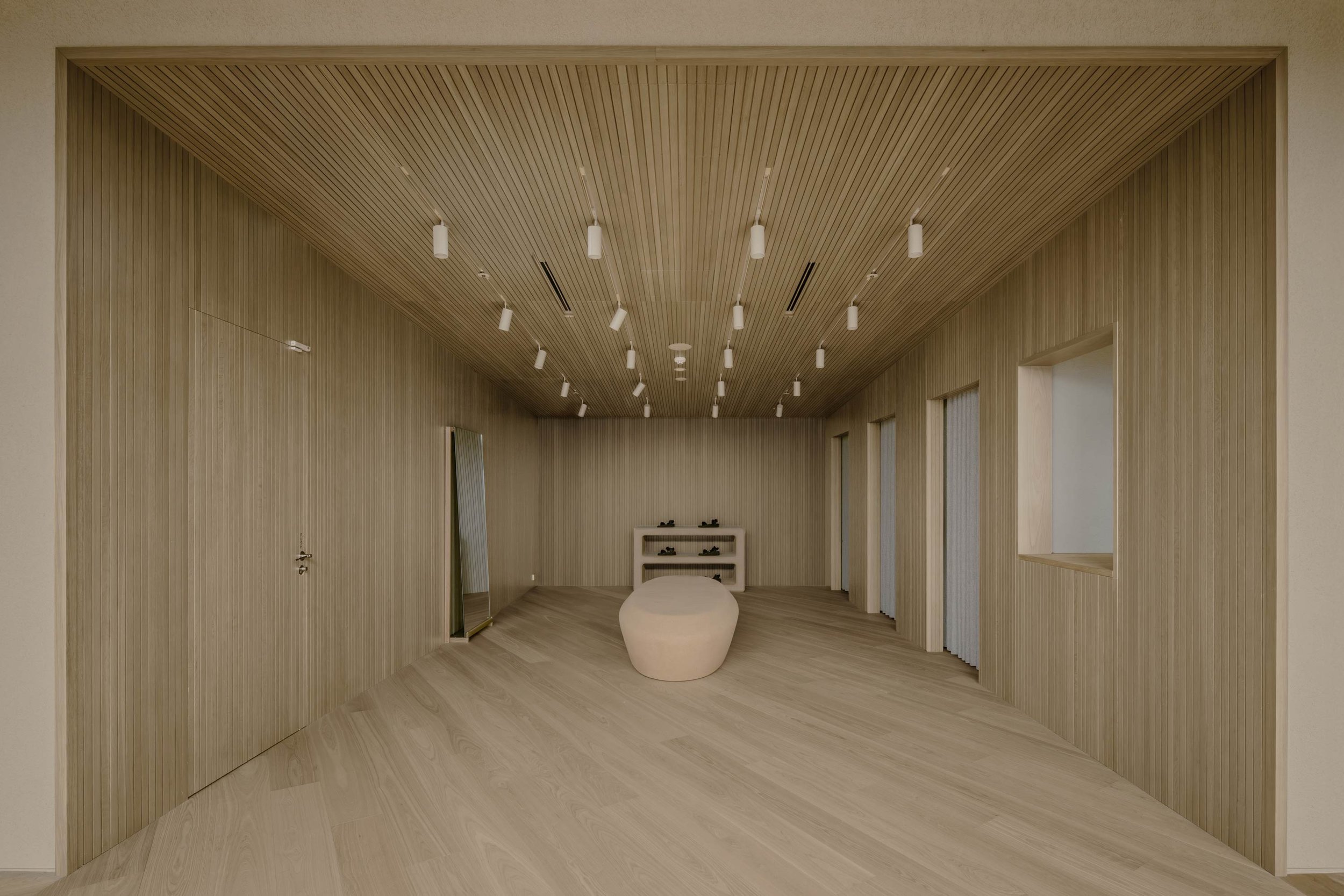 On ascending the stairs, the design continues with a distinctly subdued palette. The floor is segmented into functional zones, subtly differentiated by three distinct types of wood flooring, each with a unique texture and grain. As visitors move through the space, the architects’ intention is that they perceive the subtle shifts in atmosphere between the different areas. Each section features a central display island made from various types of wood with different textures and finishes, unifying and yet distinguishing each space.