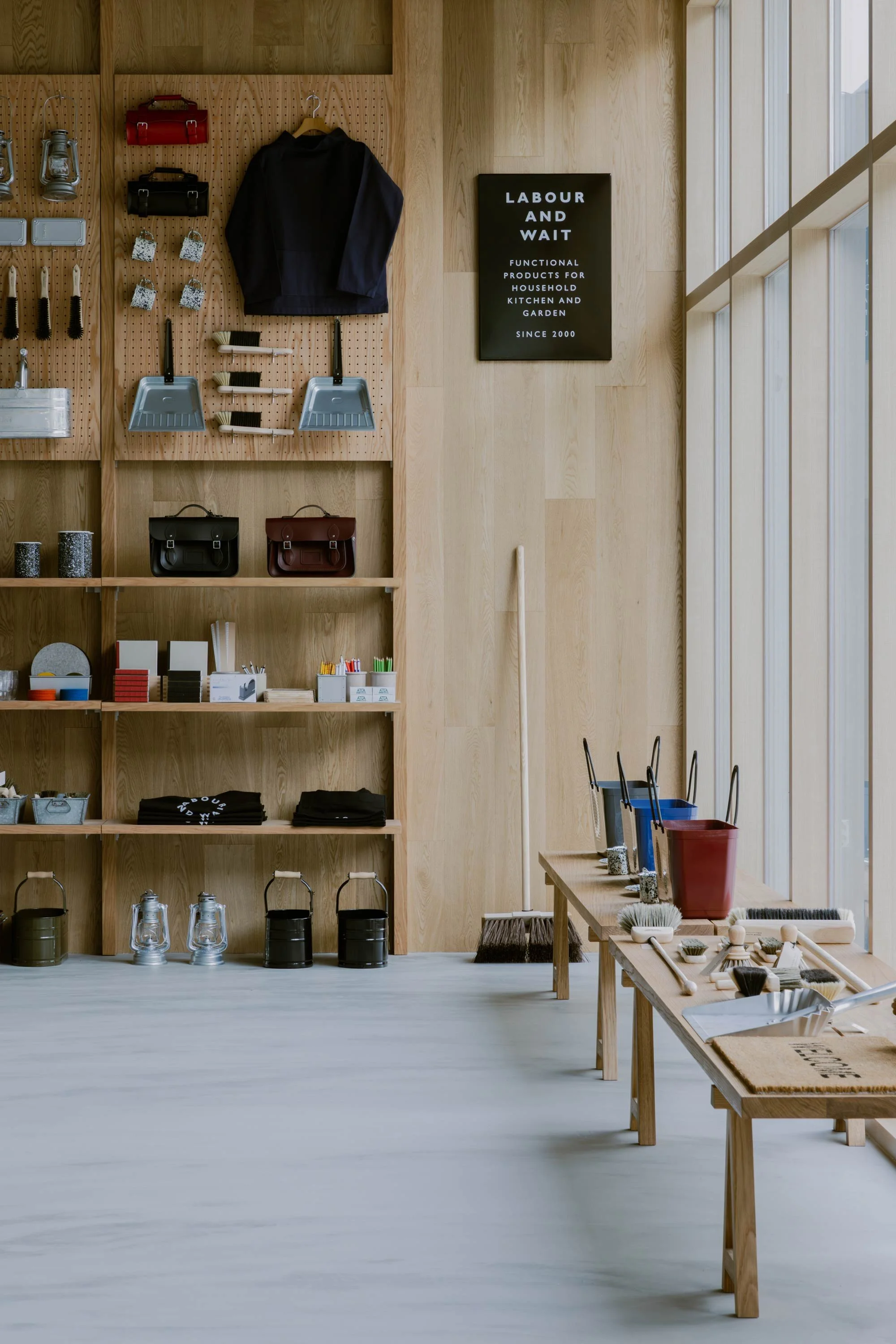 The spatial anchor of the ground level is a prominent, integrated wooden staircase. Crafted from reclaimed wood, its surfaces bear the visible traces of past use, instilling the space with a quiet warmth and a sense of enduring material integrity. This structure not only facilitates vertical movement but also incorporates fitting rooms, storage and product display.