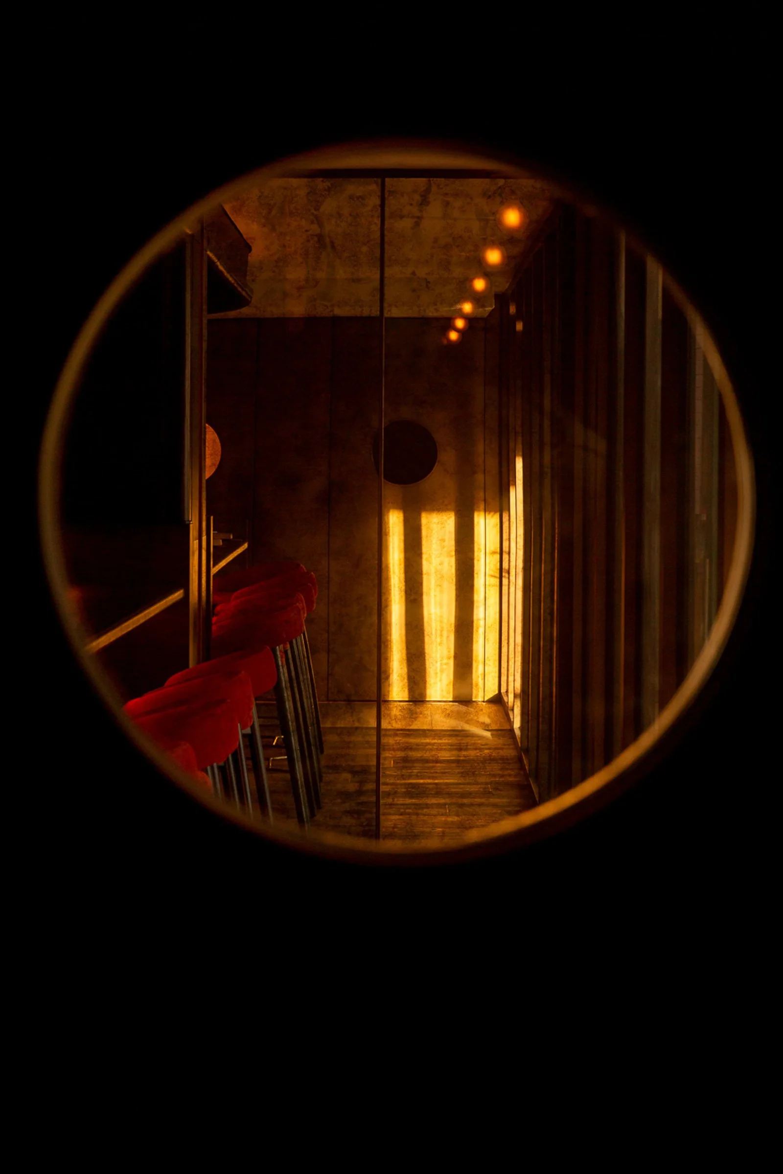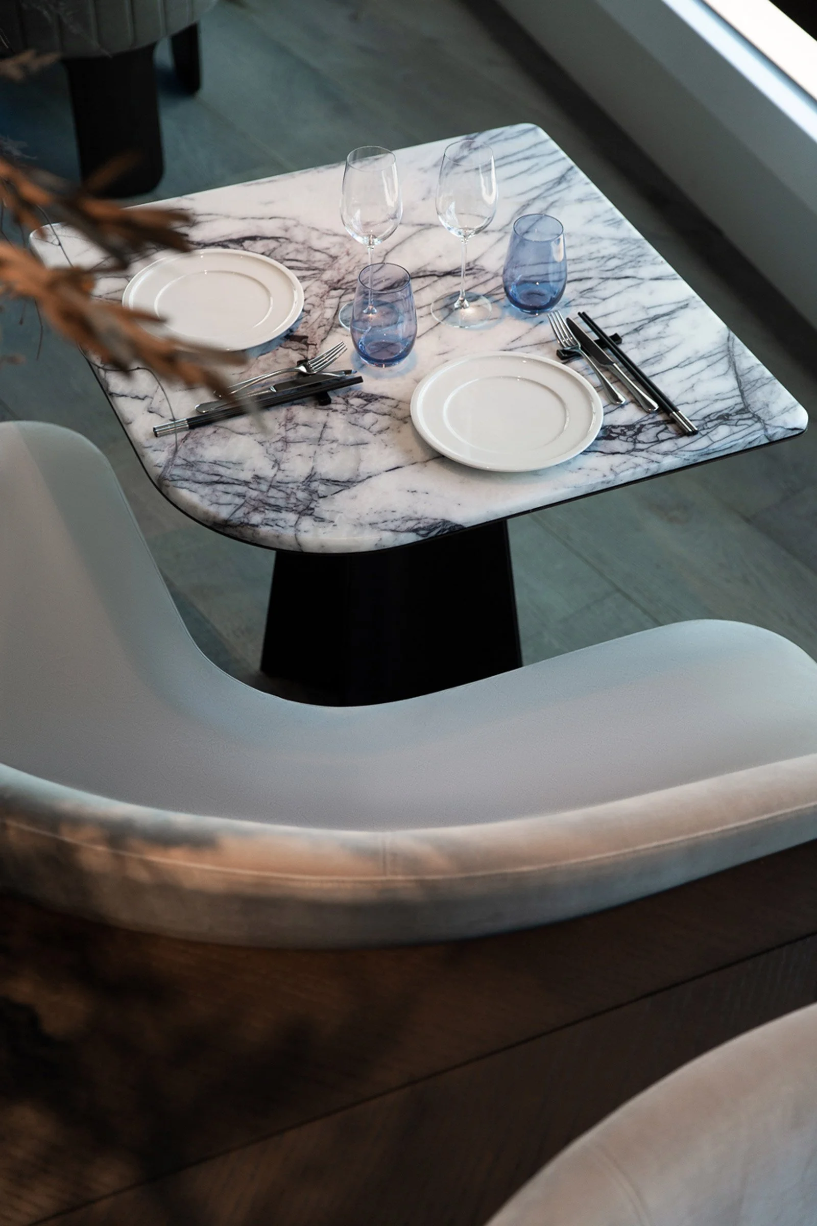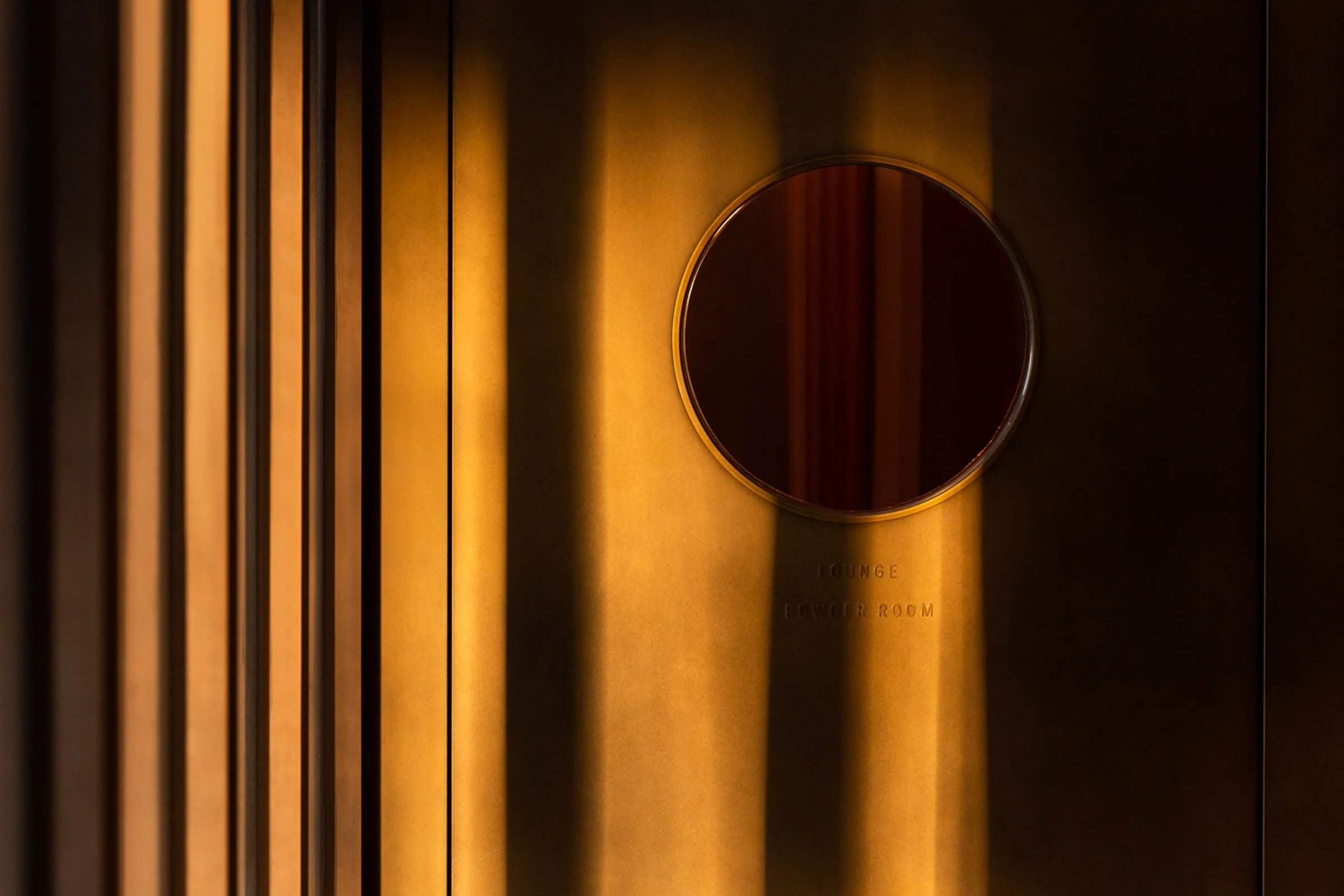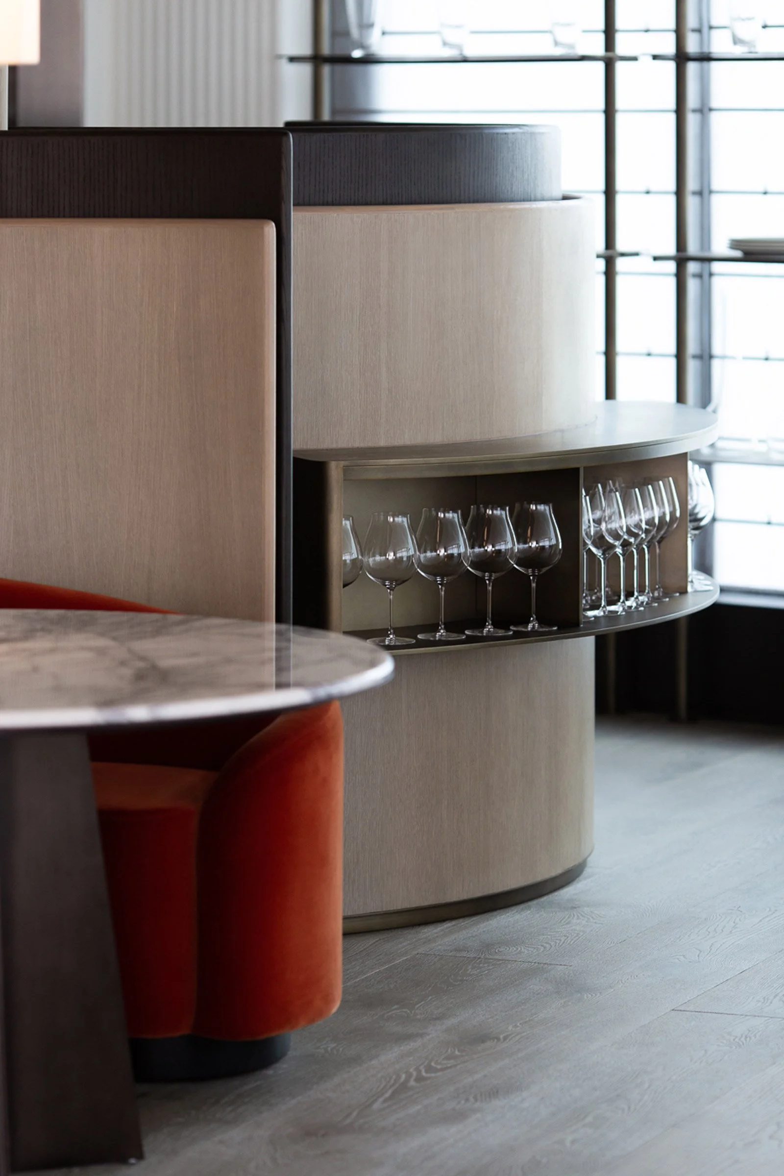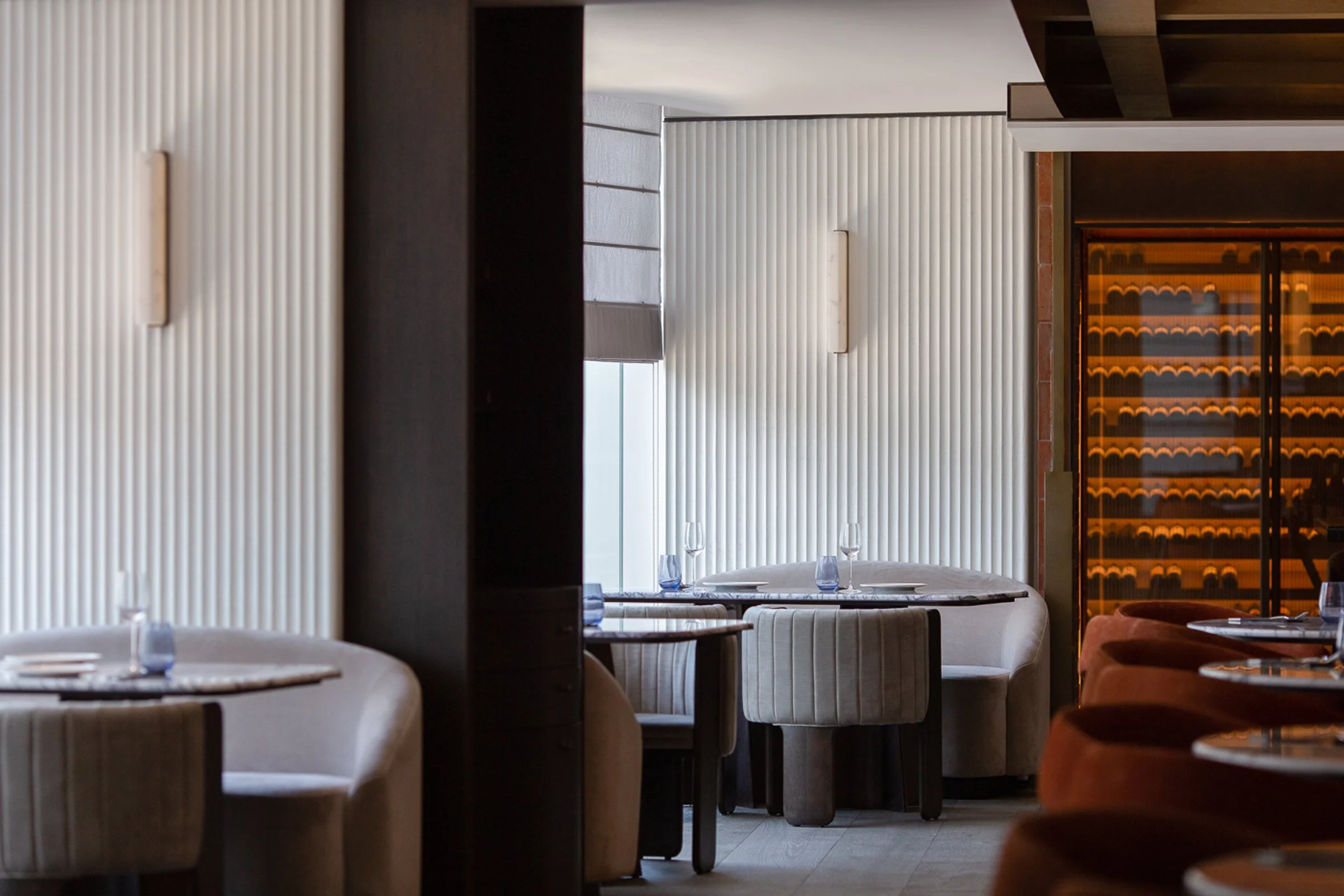 Wooden columns along the lift core greet diners at the entrance, this feature immediately asserting the verticality of the space. In the main dining room, plush semicircular banquettes sit against wavy back walls that provide a subtle divider from the entrance. Floors are rendered in aged smoked oak, made from three-metre-long planks from Belgium, while the white fluted plaster panels contrast against the dark wood versions.