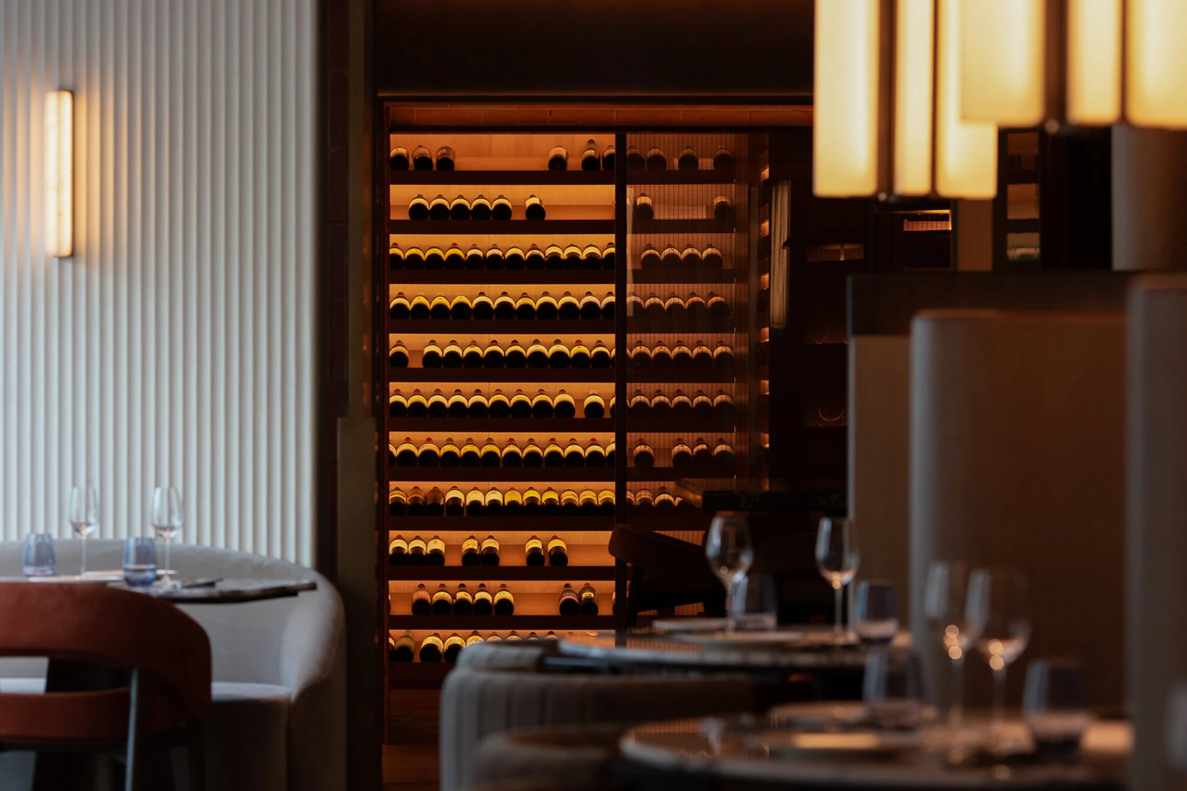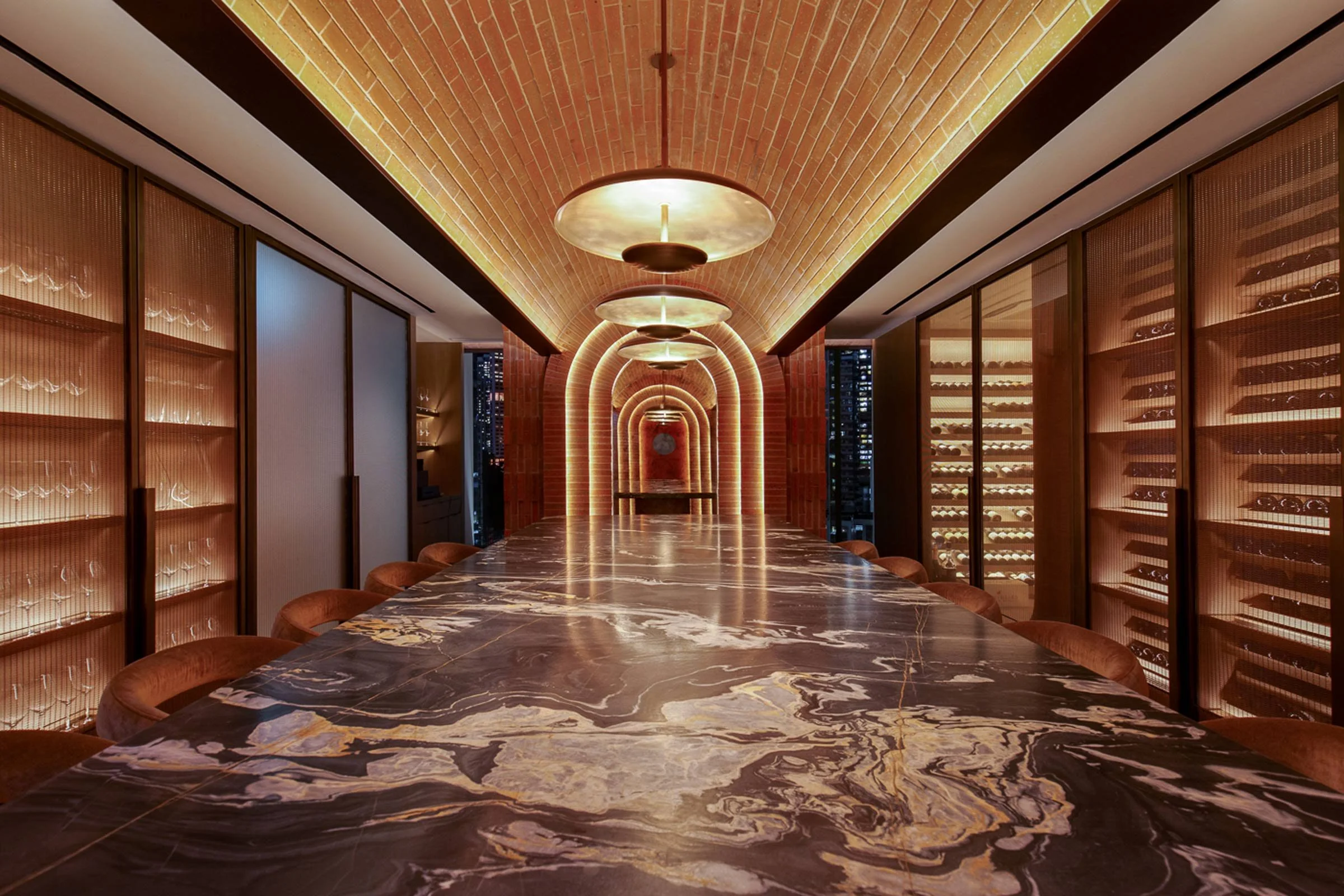 In the sommelier room is the restaurant’s collection of fine wines — 4,000 bottles and counting — stored a cellar realised in partnership with wine storage company Sensis. Designed to evoke a traditional vaulted wine cellar, the additional walk-in space is defined by its stepped brick walls and low ceiling, beautifully centred to envelope the gold-veined marble table where wine tastings take place.