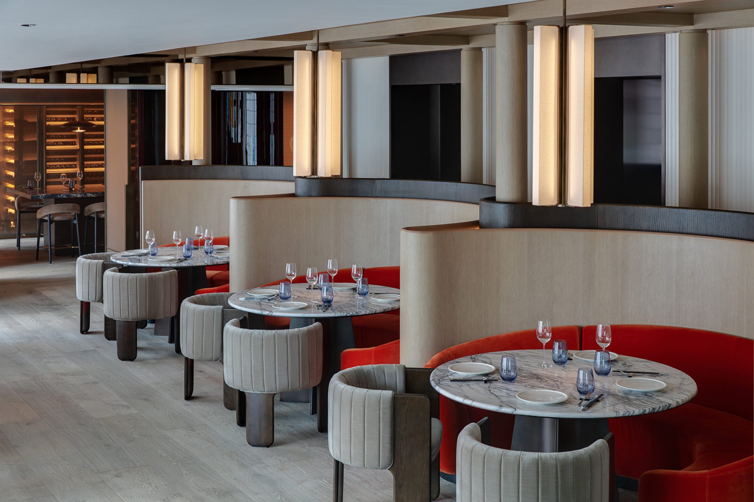The restaurant, which opened in March 2022, is located in Central’s H Code, and from its 25th-floor position overlooks the former police station and reinvented arts hub of Tai Kwun. Drawing on the concept of ‘terroir’, Bensalem used a refined nature-inspired colour palette of white plaster with grey, burgundy and red hues. ‘The intent was to describe the origins and environment of most of the produce used by Olivier in his cuisine,’ the architect says.