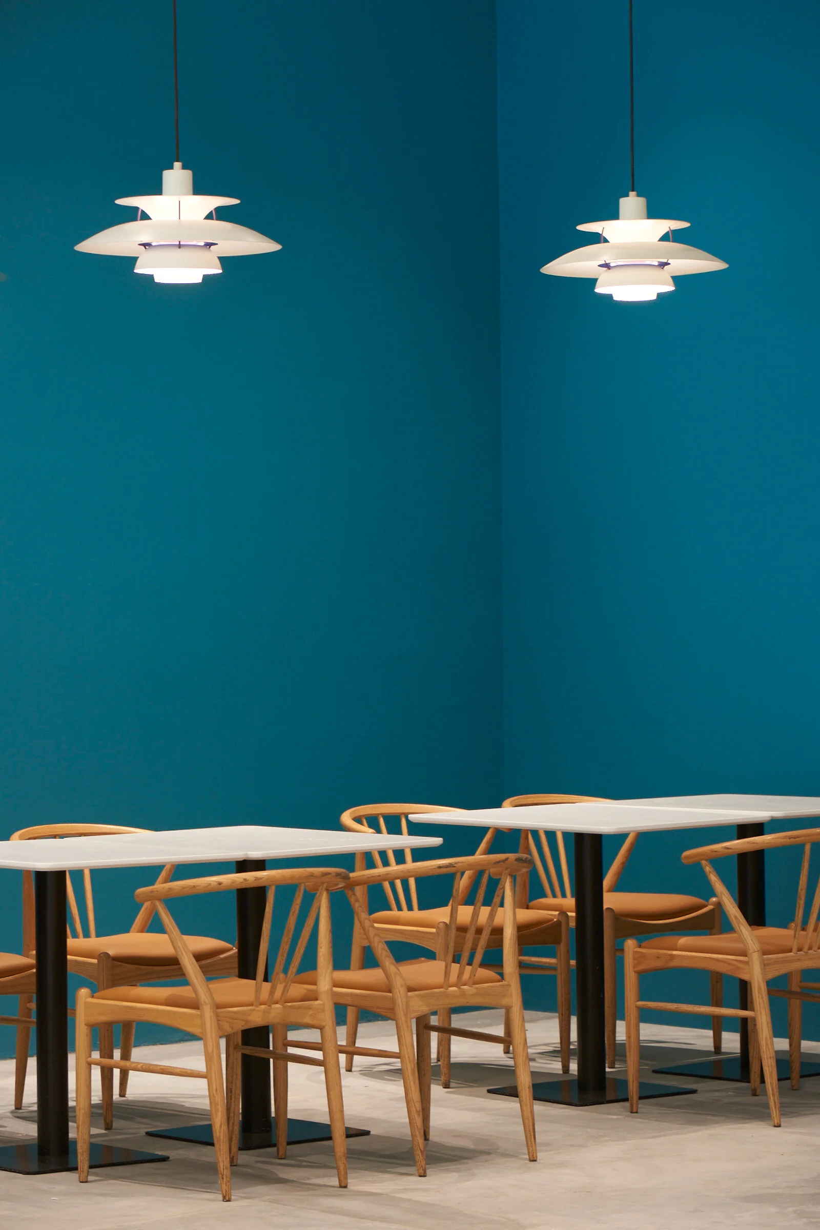 The design also reflects an understanding of the cafe’s inherent character. A full-height shelf behind the bar counter and the suspended cafe signage highlights its loftiness. Ample seating options keep visits interesting for regular customers — there’s a ledge upfront for grab-and-go coffee, a communal table and bar seats, as well as low-slung furniture for lounging in the central area. Toward the rear, more intimate catch-ups can be had under the snug glow of a pair of Louis Poulsen PH5 pendants.