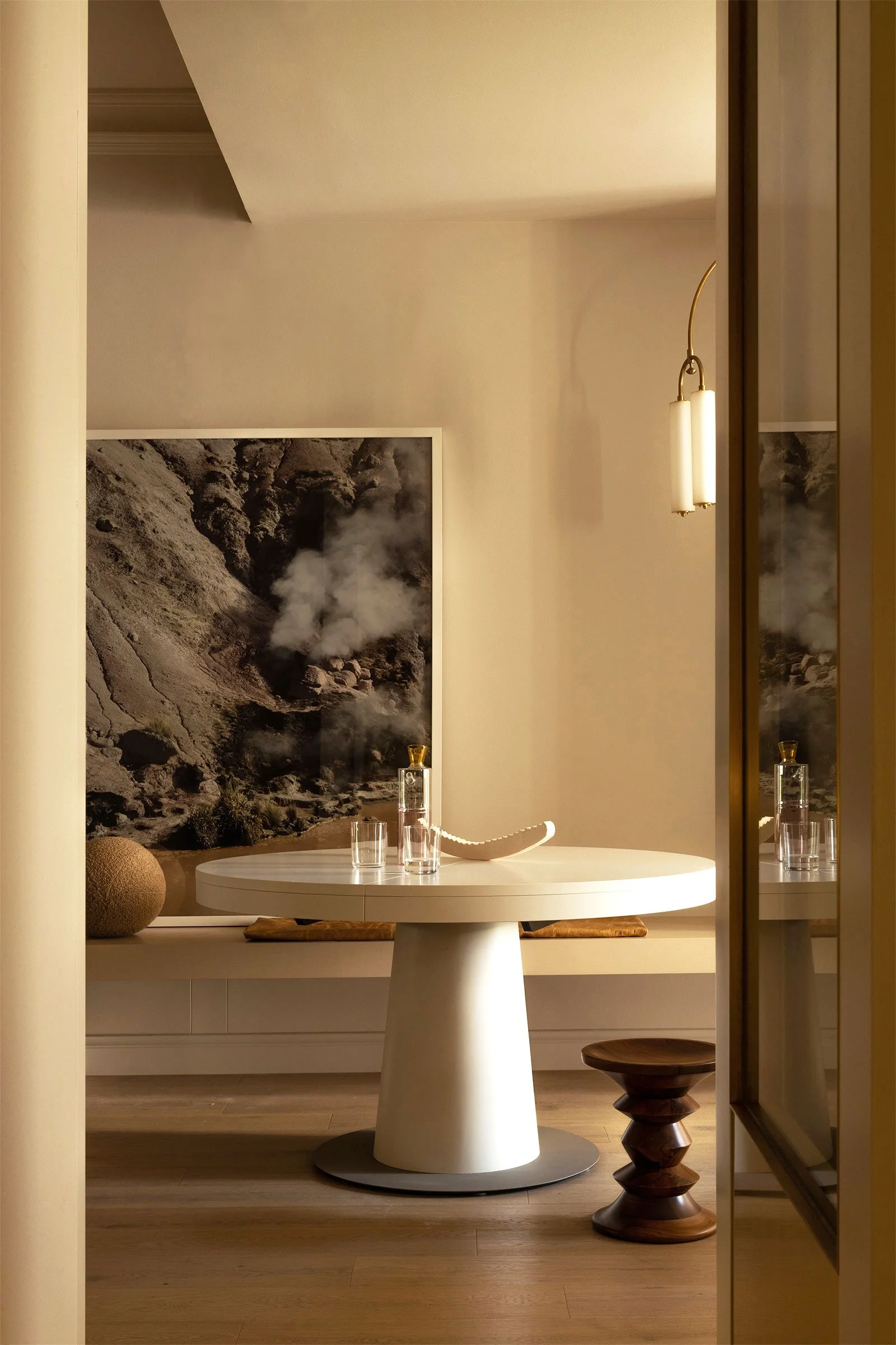 The bedroom, study and bathroom spaces sit tucked away on the uppermost level, treated with the same delicate tonal palette that’s used throughout the home. Although subtle, the consistent muted blush tones add to the warmth of the home, while timber adds texture and the judicious use of stone connects back to a European influence. Through focusing on the experience and quality of the spaces, East End Residence elevates the everyday.