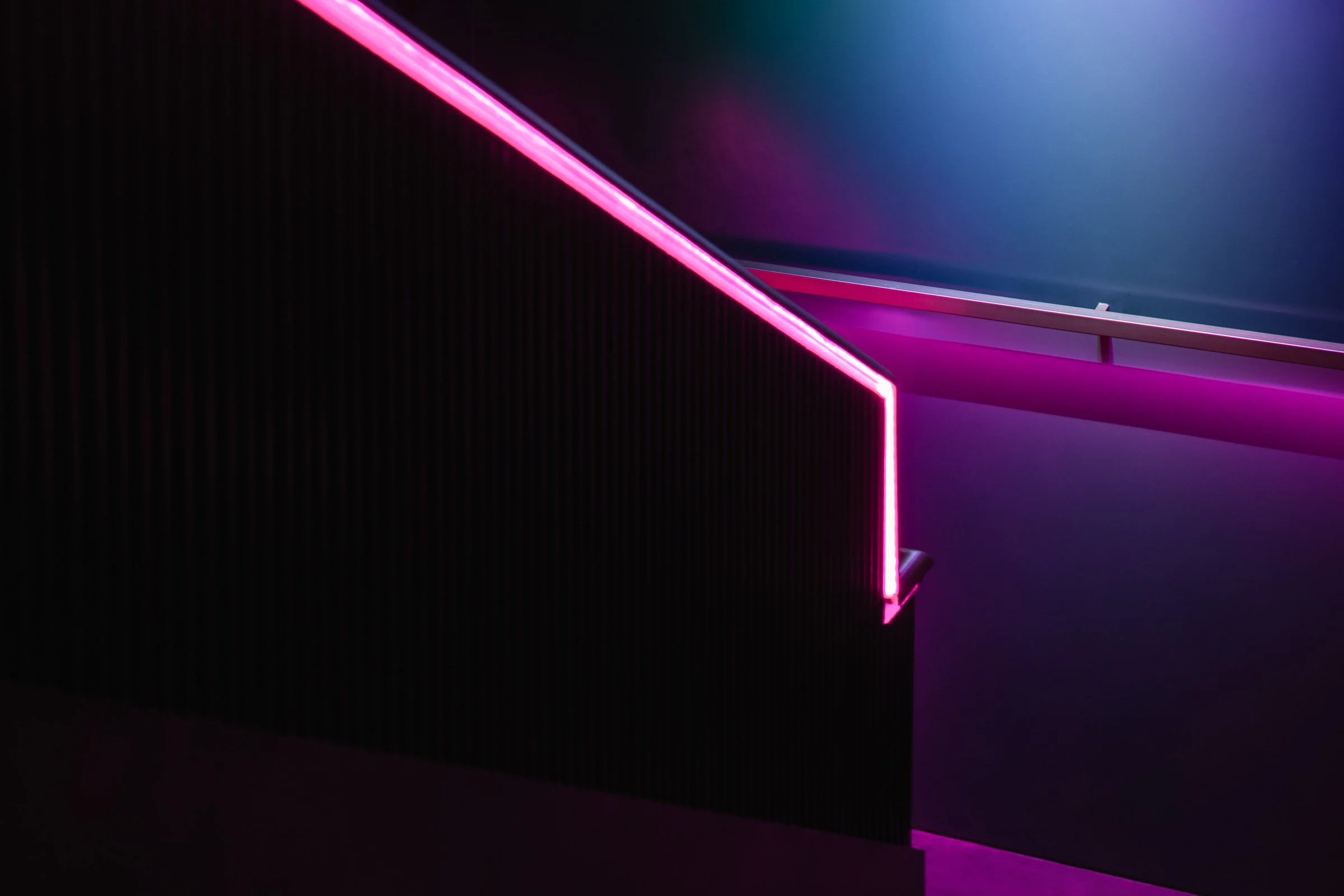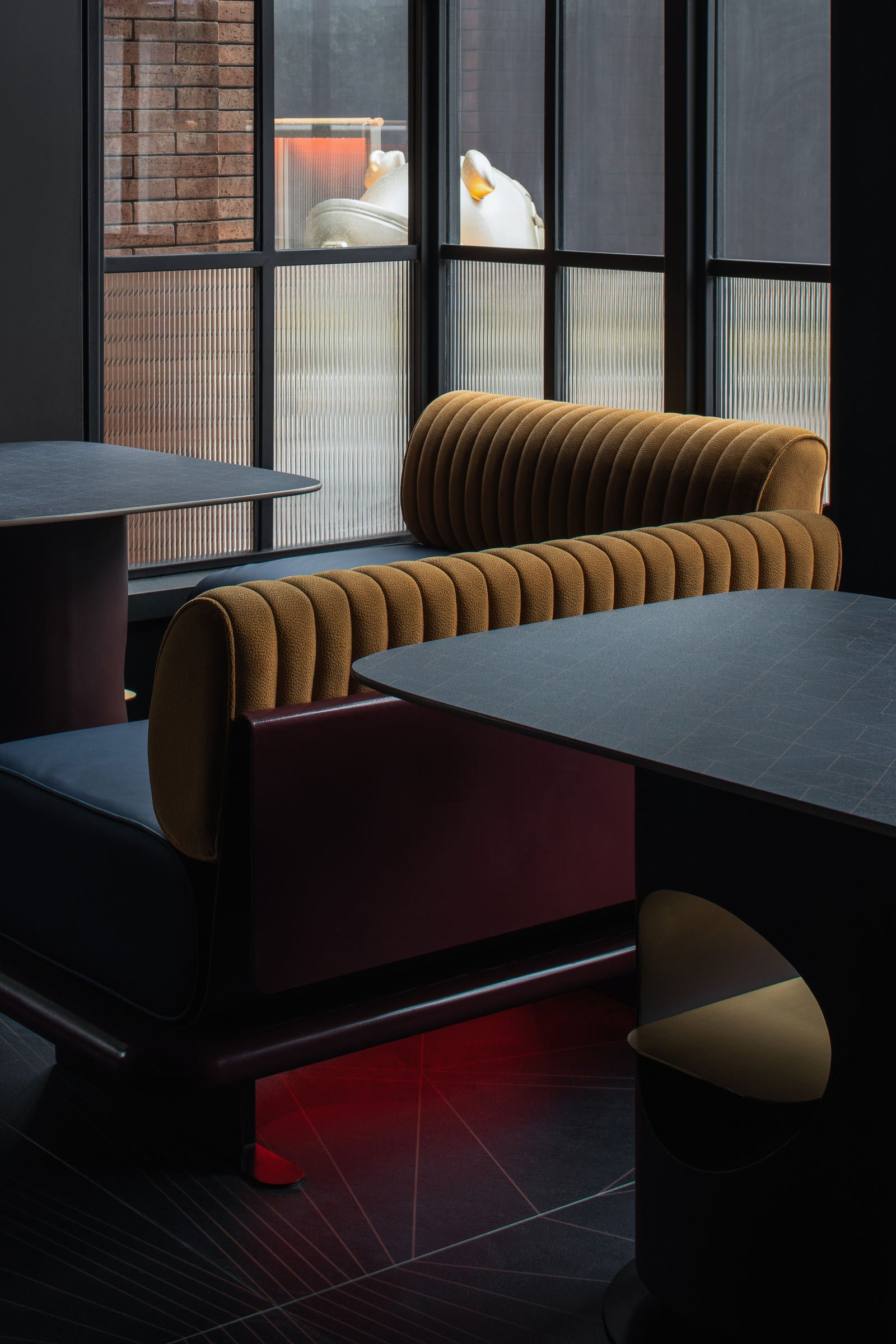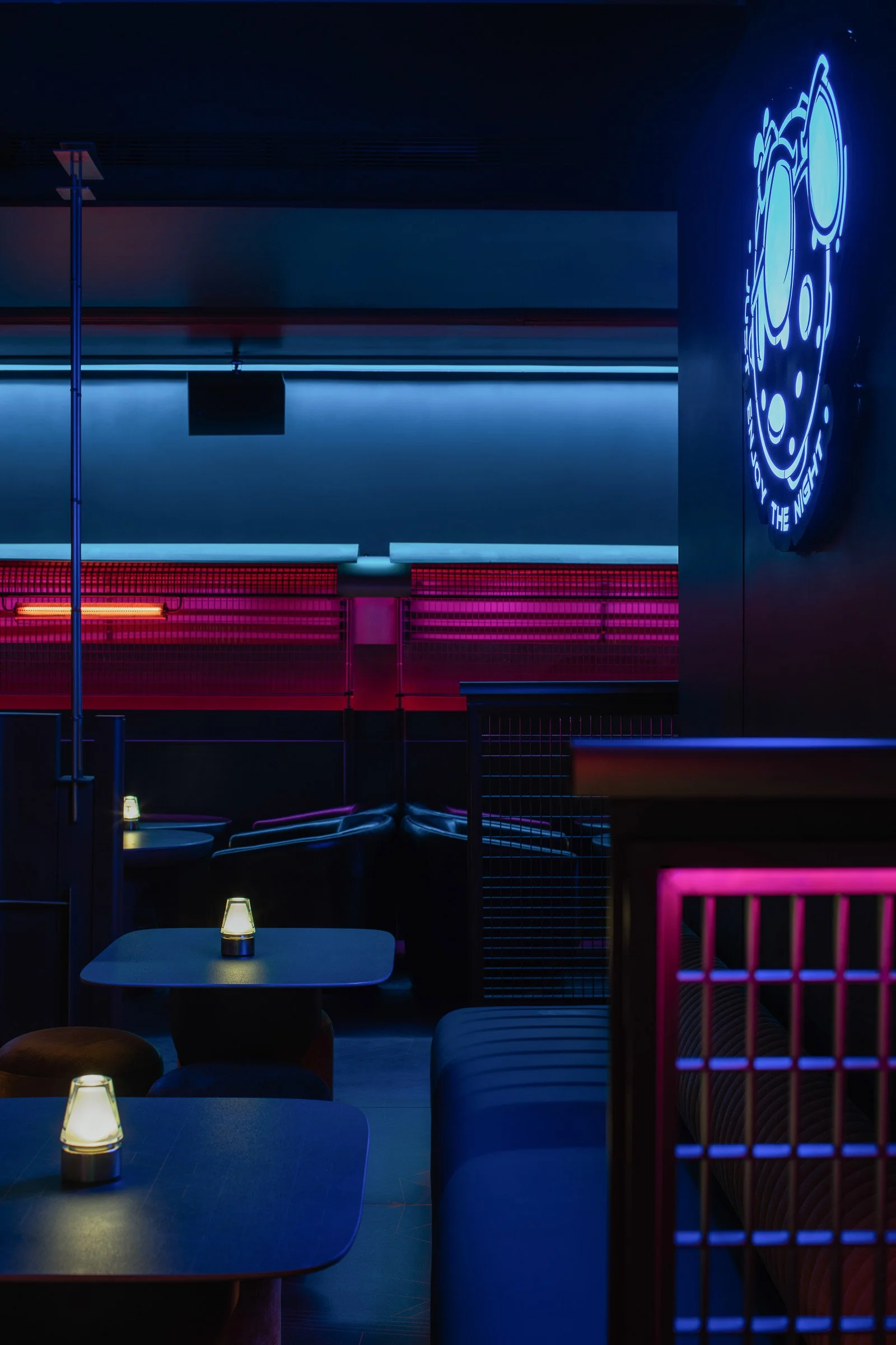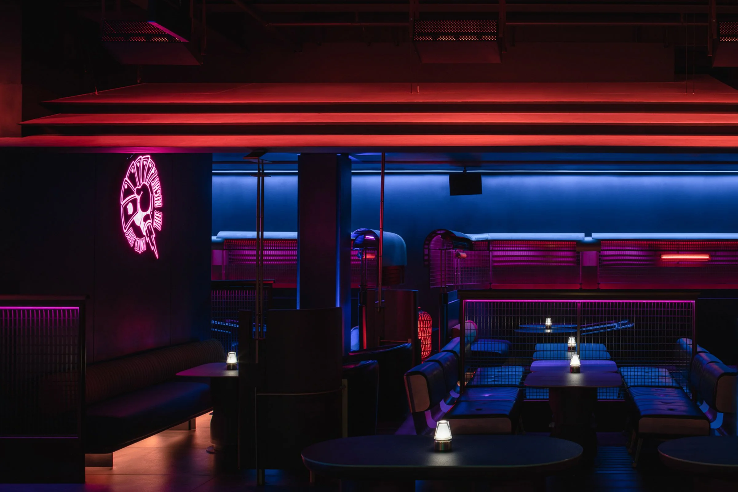 The main custom feature is the lighting: a combination of peach-pink and aquamarine neon lights that creates a captivating ambience and truly embodies the concept of Erma Pub. We also designed a series of bespoke sofas and seats that makes the space look polished and neat.