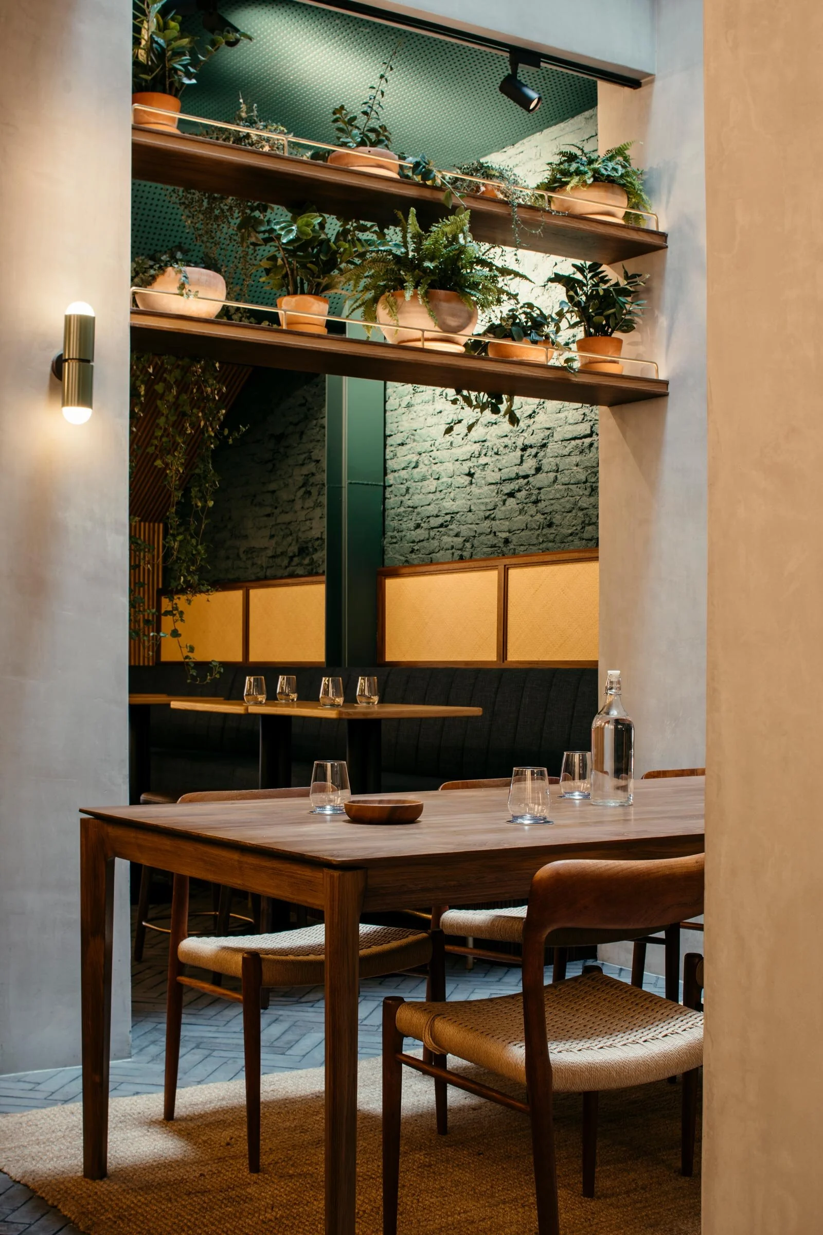 ‘One of the key requirements from the client was to create different seating types within the space, to have an eclectic mix of experiences for guests,’ Webb says. The narrow space (measuring only five metres in width) now houses a good mix, ranging from low lounge seating and loose tables to slim banquettes — all overlooked by a sizeable bar.