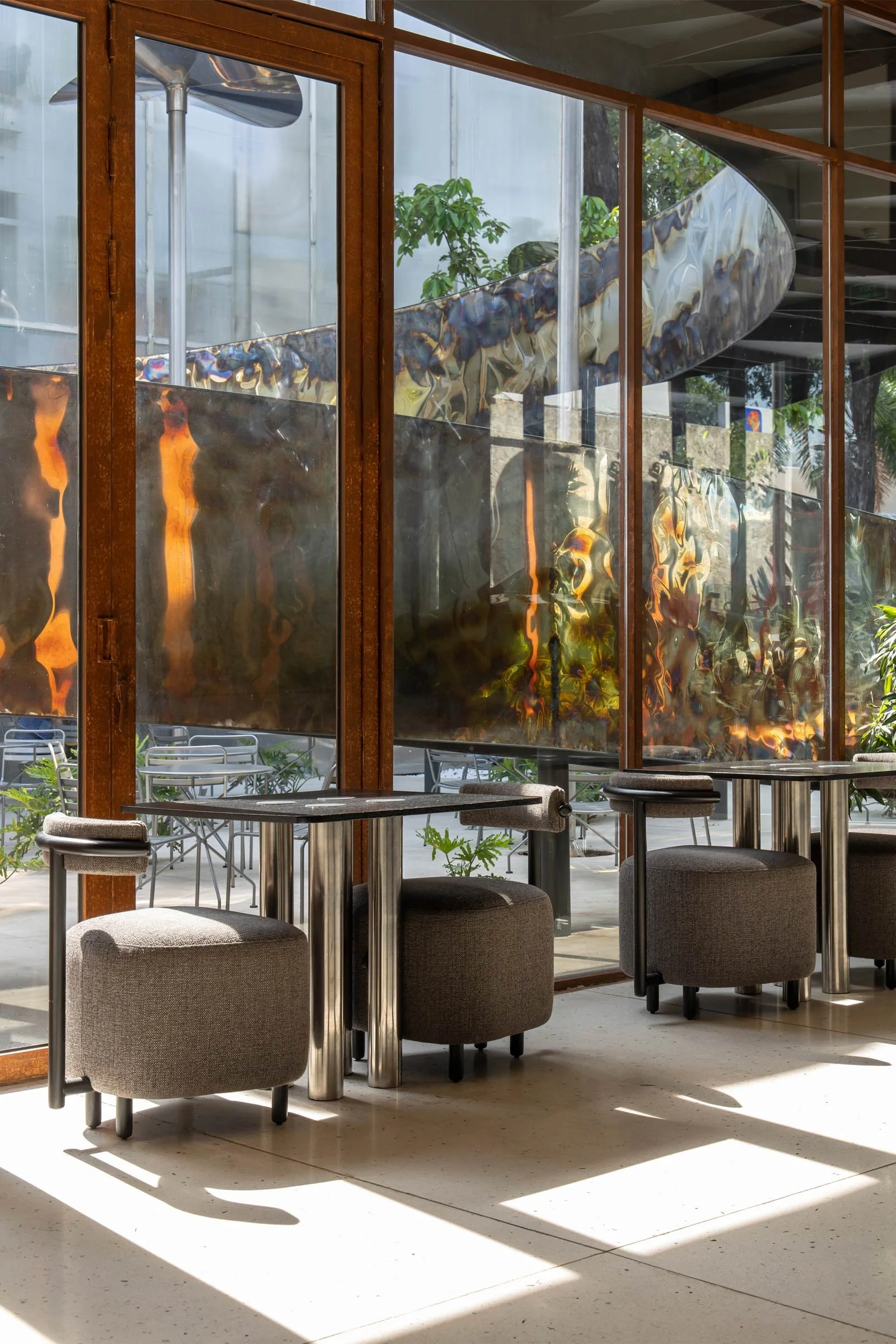 We also designed the bistro tables. The round stainless steel legs stick up through the table top and double as coasters.