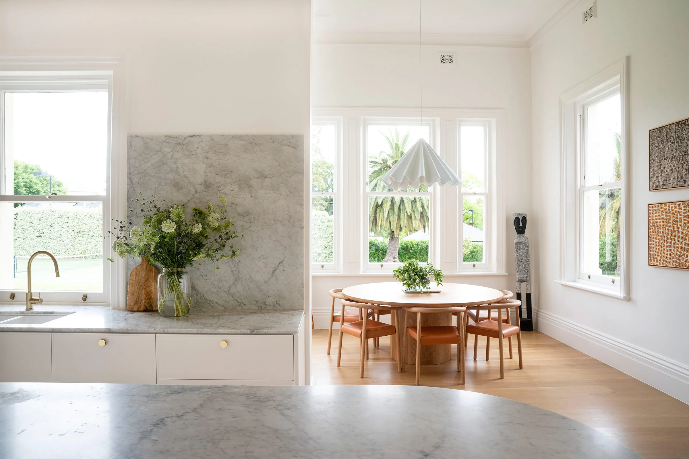 A wall separating the kitchen and living area was demolished to create an open-plan footprint, a modification that Enoki director Susanna Bilardo calls a ‘game changer’. She says the move resulted in a smoother flow that ‘makes the whole area feel more engaging and inviting while also increasing the light levels’. The flooring, a mess of tessellated tiles dividing each room, was replaced with oak for consistency, helping create a unified zone rather than a series of divisions. The sit-down dining nook off the kitchen remained unchanged, albeit decorated with a sculptural pendant by MENU. ‘Because the ceilings are so high, the drop-down lighting creates a more intimate focal point,’ Bilardo explains.