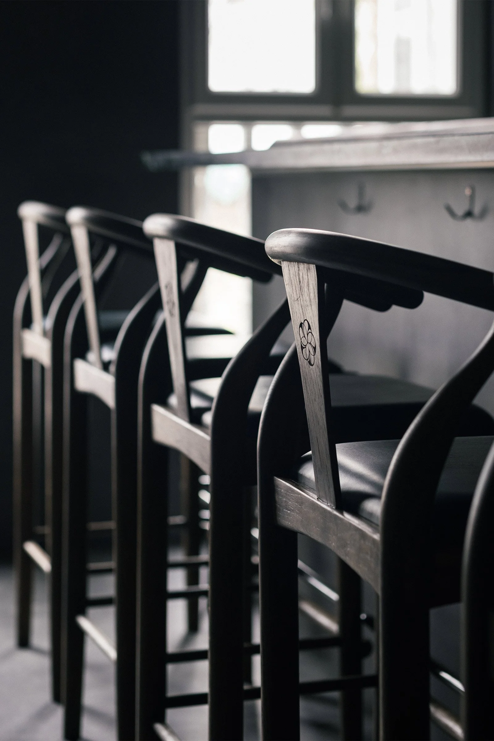 A charred piece of salvaged chengal (a Malaysian hardwood), which has been sealed using the Japanese shou sugi ban technique, sits atop the counter. Muted walnut carpentry rises up the walls, emphasising the capacious space, while grey painted walls accentuate the raw textures. Also designed by OWIU, the logo — five petals created by the intersections of five circles representing the different methods of cooking — can be found throughout the restaurant. It’s on the custom-made tableware, chairs made by local workshop Baremetalco, and the lighting installation on the ceiling. ‘Our team studied Japanese family crests, which usually incorporate plants, nature and animals. We turned something two-dimensional into something three-dimensional and immersive,’ Gunawan explains.