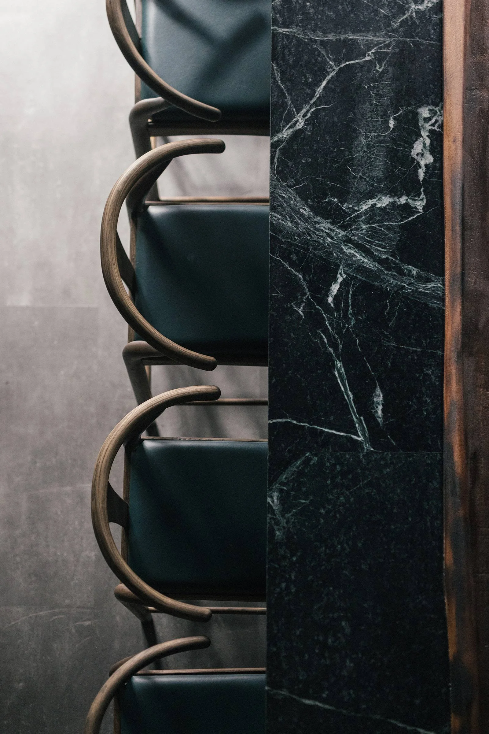 The team at OWIU (an an abbreviation for ‘The Only Way Is Up’) is more used to designing contemplative spaces, to slow users down rather than the opposite, but still present in GOHO is the studio’s constant attention to thoughtful design and craft. The restaurant, located on the second storey of a shophouse, features an 11-metre-long Verdi Alpi marble bar counter that spans the building’s length and takes advantage of the space’s unique characteristics. ‘A bar was the best solution that also furthered our concept of having diners engage in an immersive experience with the chefs behind the counter,’ Wong says.