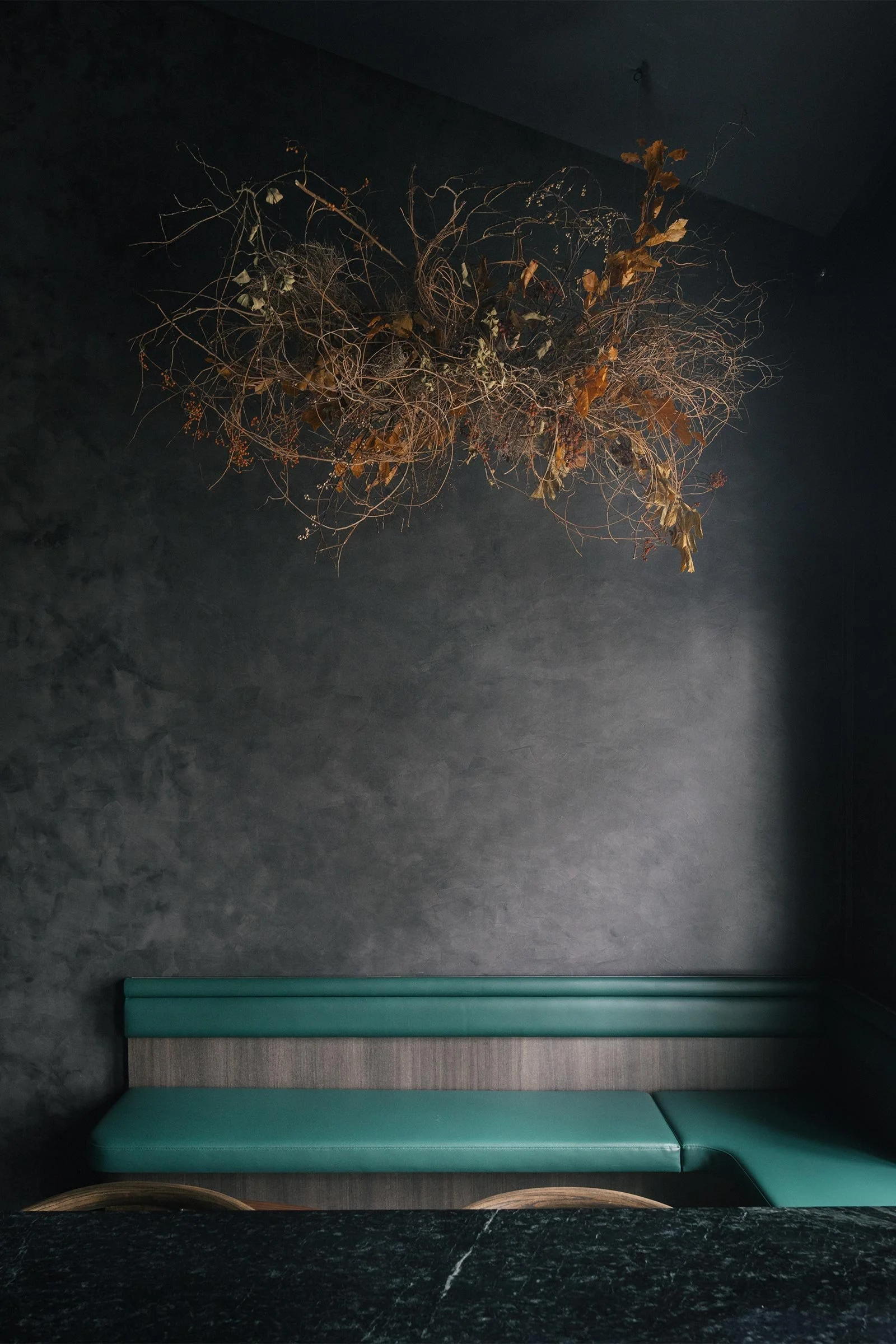 An awkward interstitial space in front of the staircase leading to the mezzanine lounge has been shaped into an intimate L-shaped booth, adorned with a hanging dried flower display by florist Charlotte Puxley. ‘We wanted this large feature to help fill the double-volume void tastefully. It allows us to use it as a framework to change the colours of the flowers as the seasons change, like to the rotation of GOHO’s seasonal menus,’ Gunawan says.