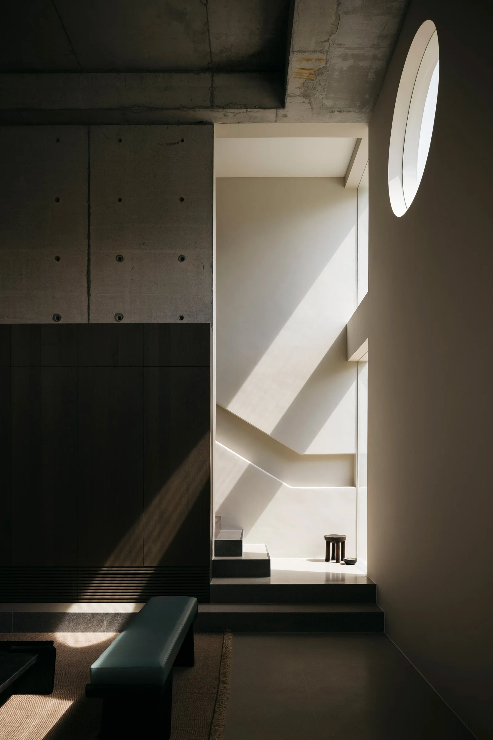 Behind an off-form concrete wall in the living room, the staircase climbs along the party wall. Carefully orchestrated apertures animate this trajectory. ‘The staircase is always an important feature for us. Here, it was also intended as a feature from the exterior,’ Teh says. A glass panel at the stair’s base extends the relationship to the garden and streetscape below, while a picture window and skylights provide views of clouds and sky above.