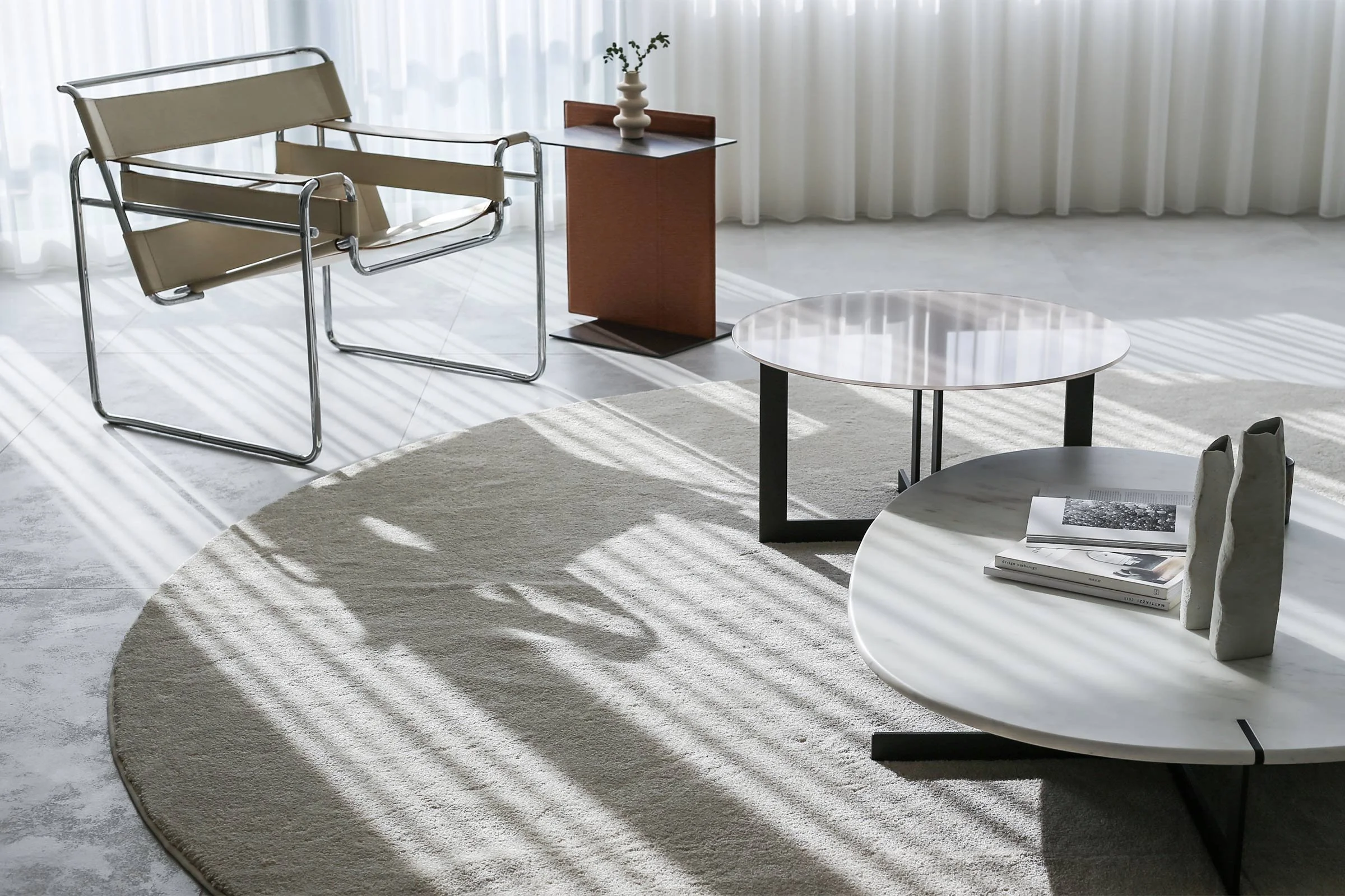 Anchoring the centre of space is a bespoke dining counter crafted from marble and plastic and inlaid with a curved mirror leg that reflects natural light and shadows. With these tactile materials, we tried to give the spaces a clean and bright quality.