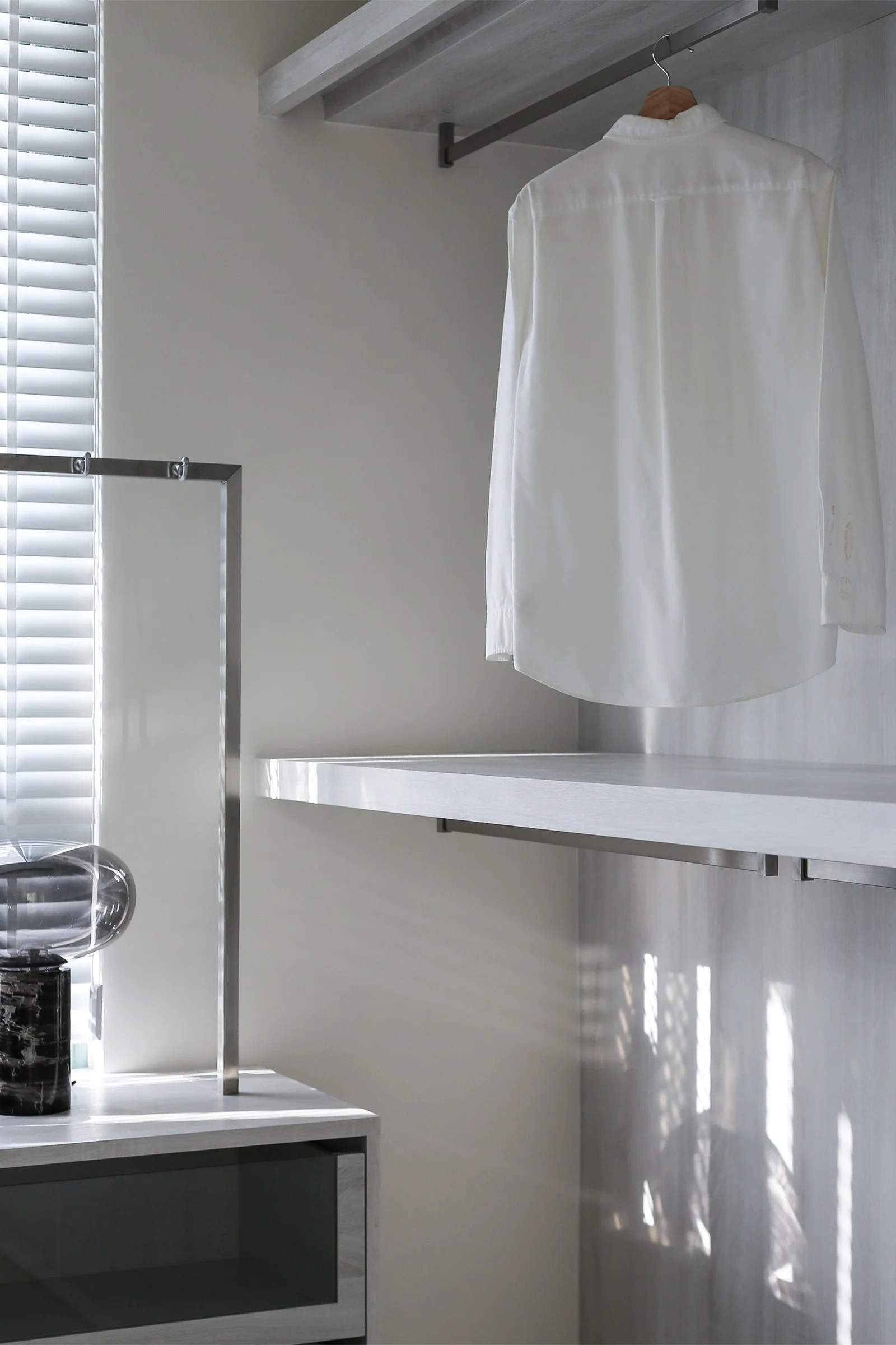 Upon entering the apartment, it’s the living room’s refined textures that first impress. The ceiling in the entrance was remodelled to create a sleek curved line. On the living room’s partition walls, we designed shallow flat-bottomed holes whose patterns resemble tree shadows, a subtle nod to the landscape of the river. We also love the timber private space which, when the light comes in, evokes the boundary between the river and its caves.