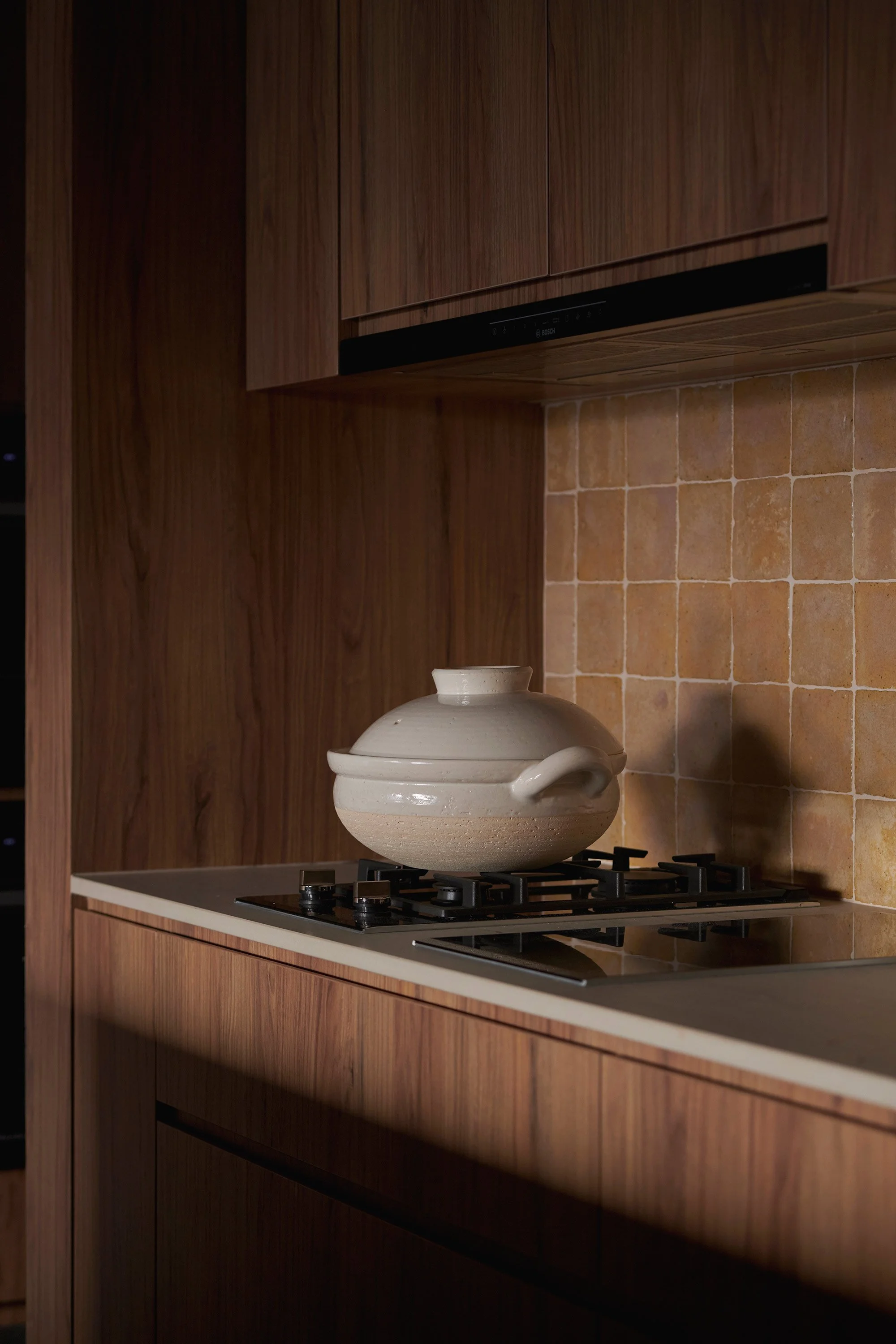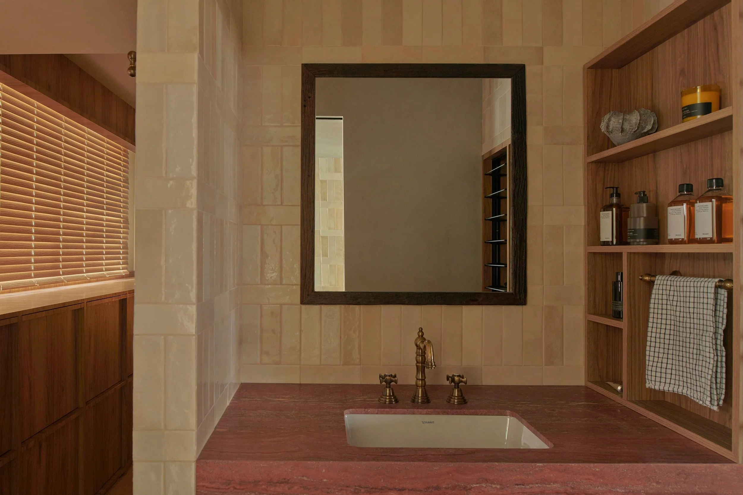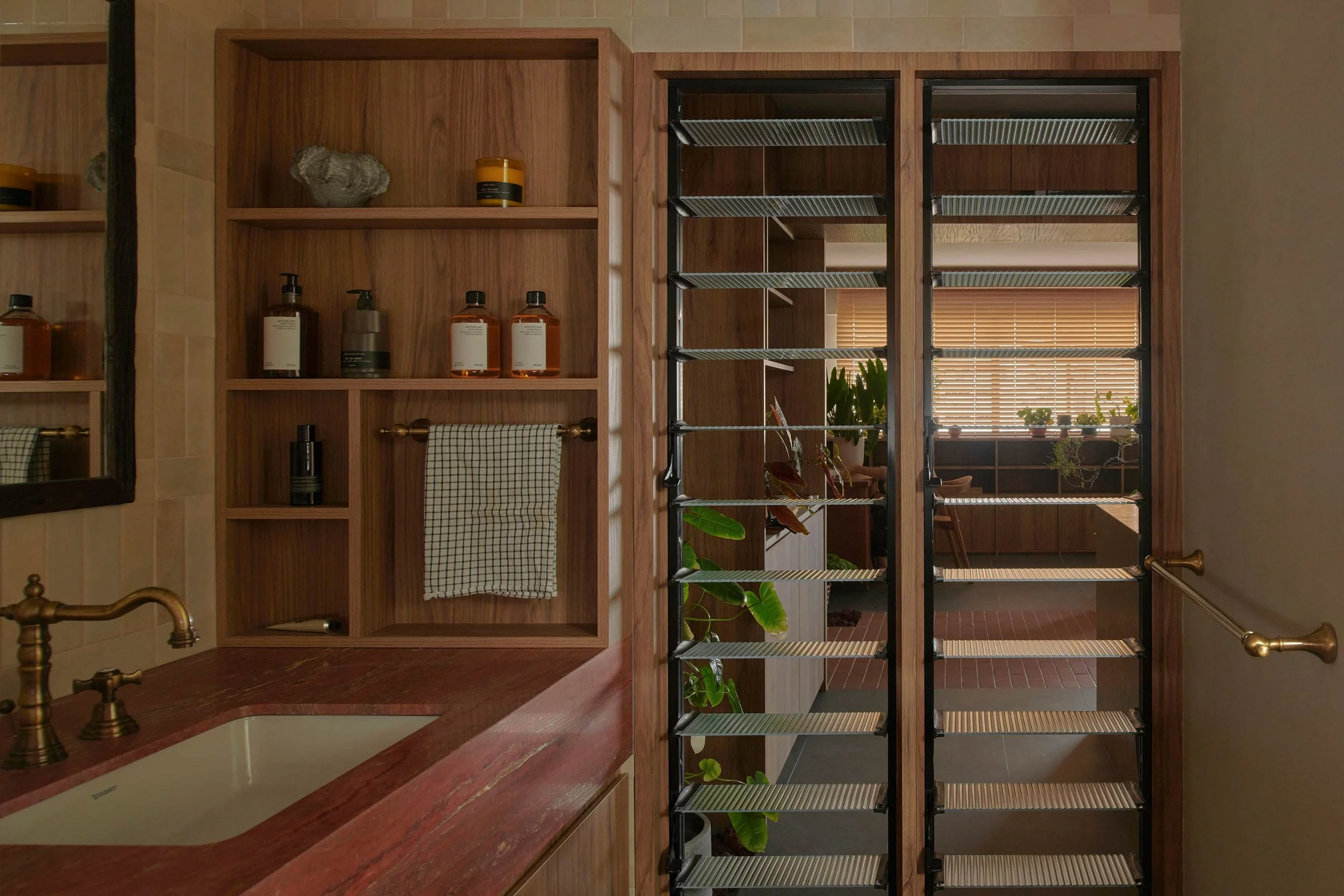 Other materials were chosen based on the bricks’ distinct burnt red colour, such as the terracotta-red travertine for the bathroom vanity’s top. ‘We used handcrafted and wood-fired tiles for the kitchen backsplash,’ Lim adds. ‘They have natural textures, making every individual piece different. When the tiles interact with the morning light, it creates a mesmerising visual tapestry for the kitchen setup.’ The overall effect is rustic yet refined.