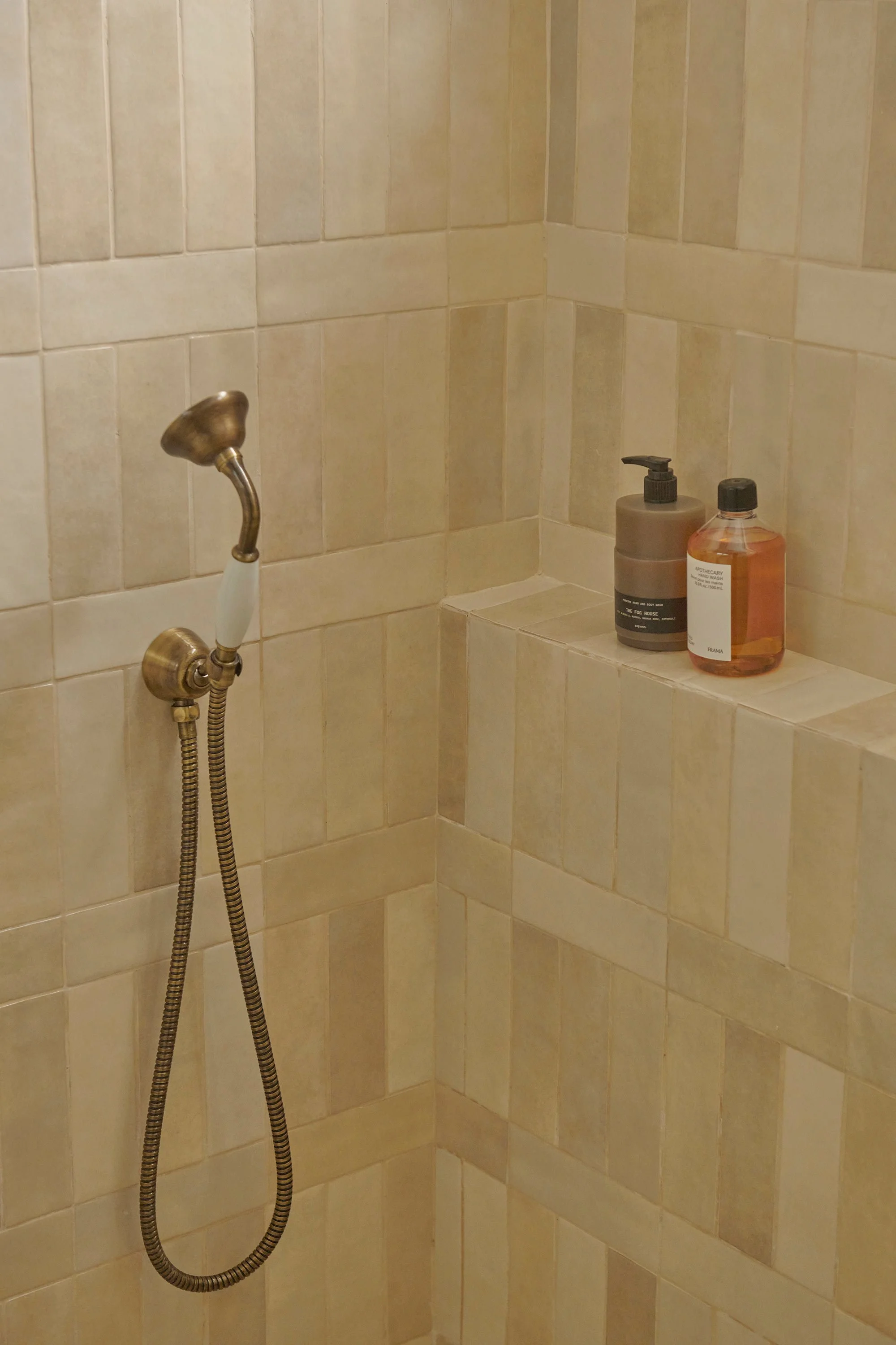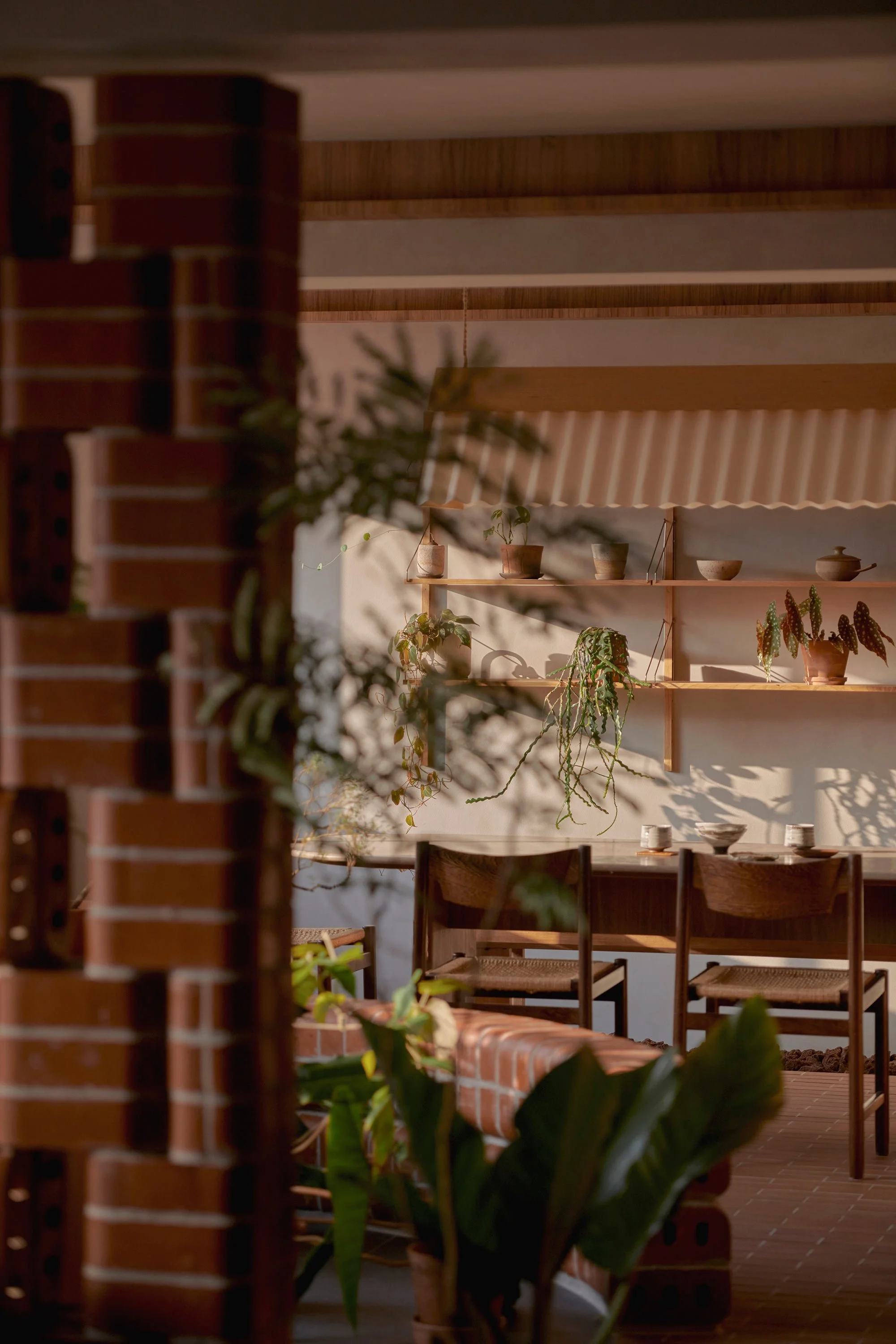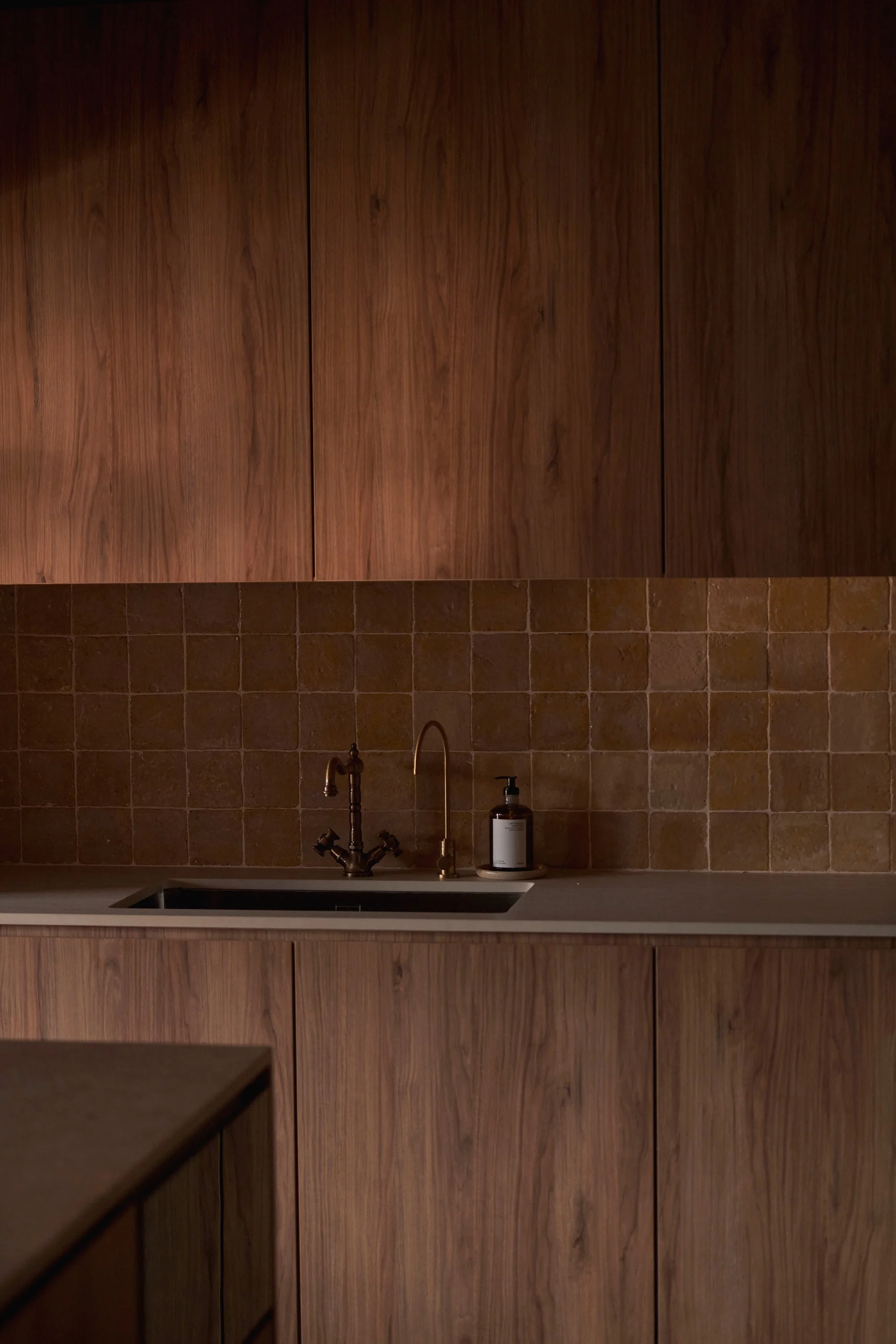 Other materials were chosen based on the bricks’ distinct burnt red colour, such as the terracotta-red travertine for the bathroom vanity’s top. ‘We used handcrafted and wood-fired tiles for the kitchen backsplash,’ Lim adds. ‘They have natural textures, making every individual piece different. When the tiles interact with the morning light, it creates a mesmerising visual tapestry for the kitchen setup.’ The overall effect is rustic yet refined.