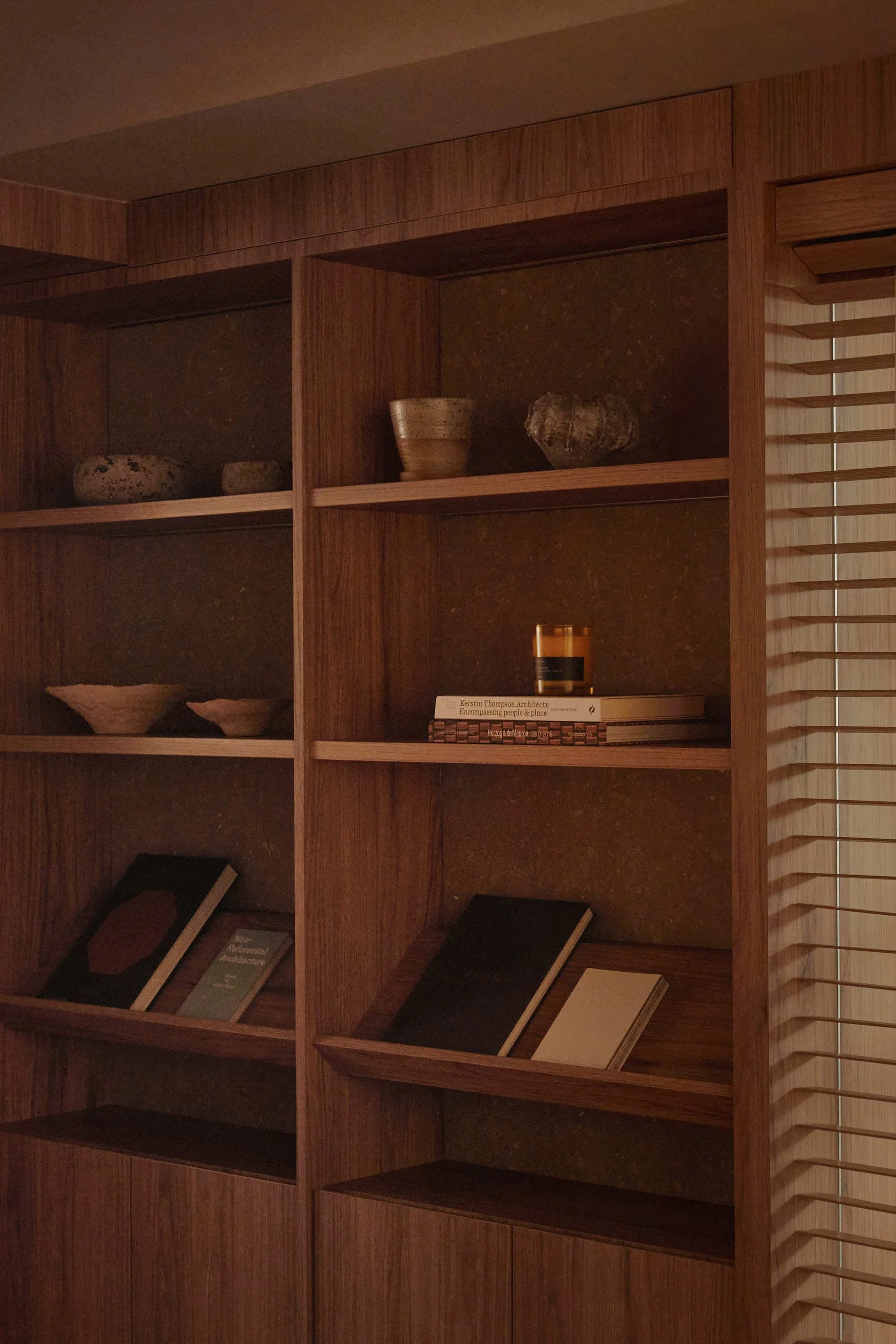 These elements now connect and divide the spaces, adding to the sense of fluidity that came with adjusting the floorplan. Lim removed the walls of two bedrooms and inserted jalousie windows that enhance physical fluidity, natural ventilation and daylight, and make good use of the bands of windows at either end of the apartment.