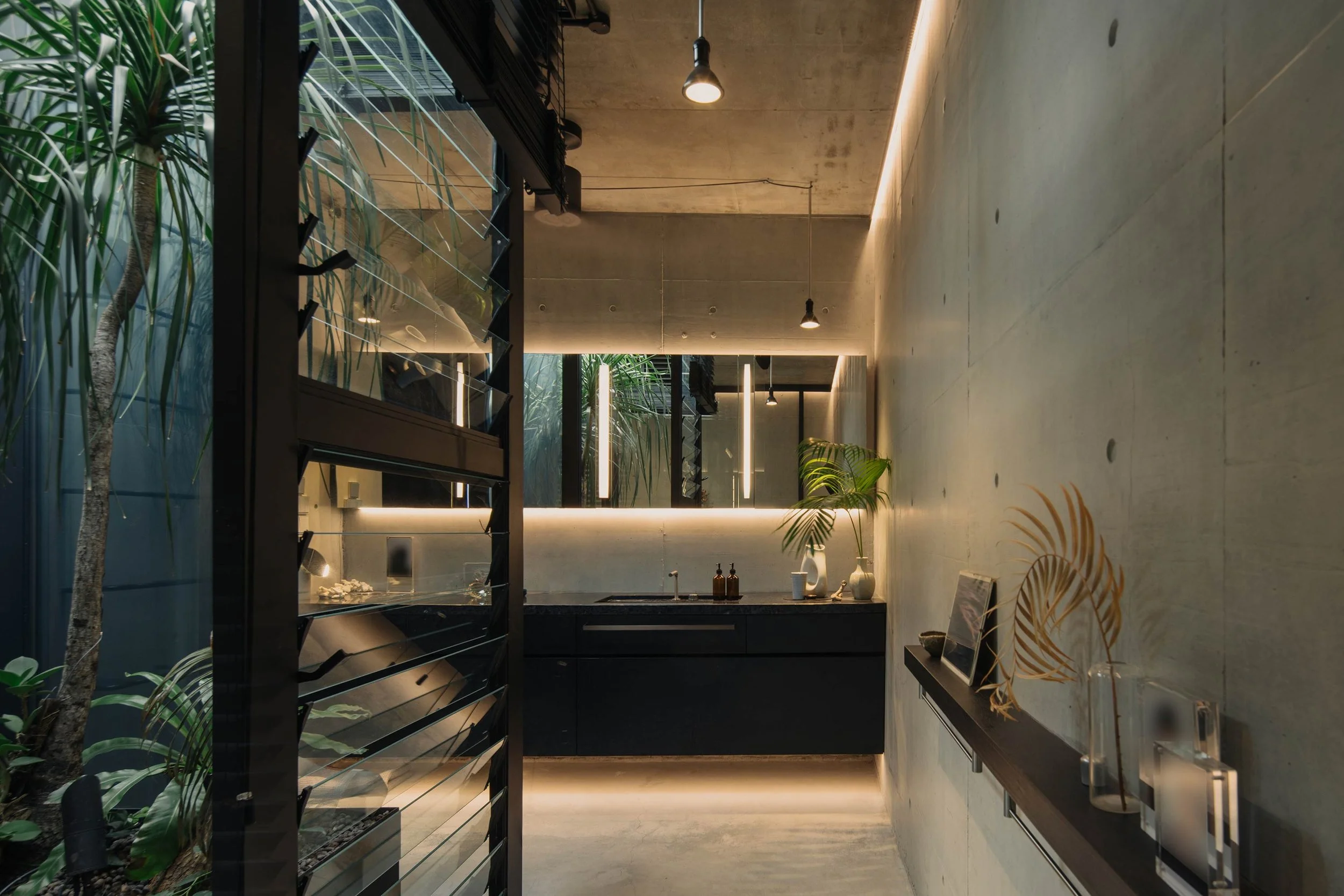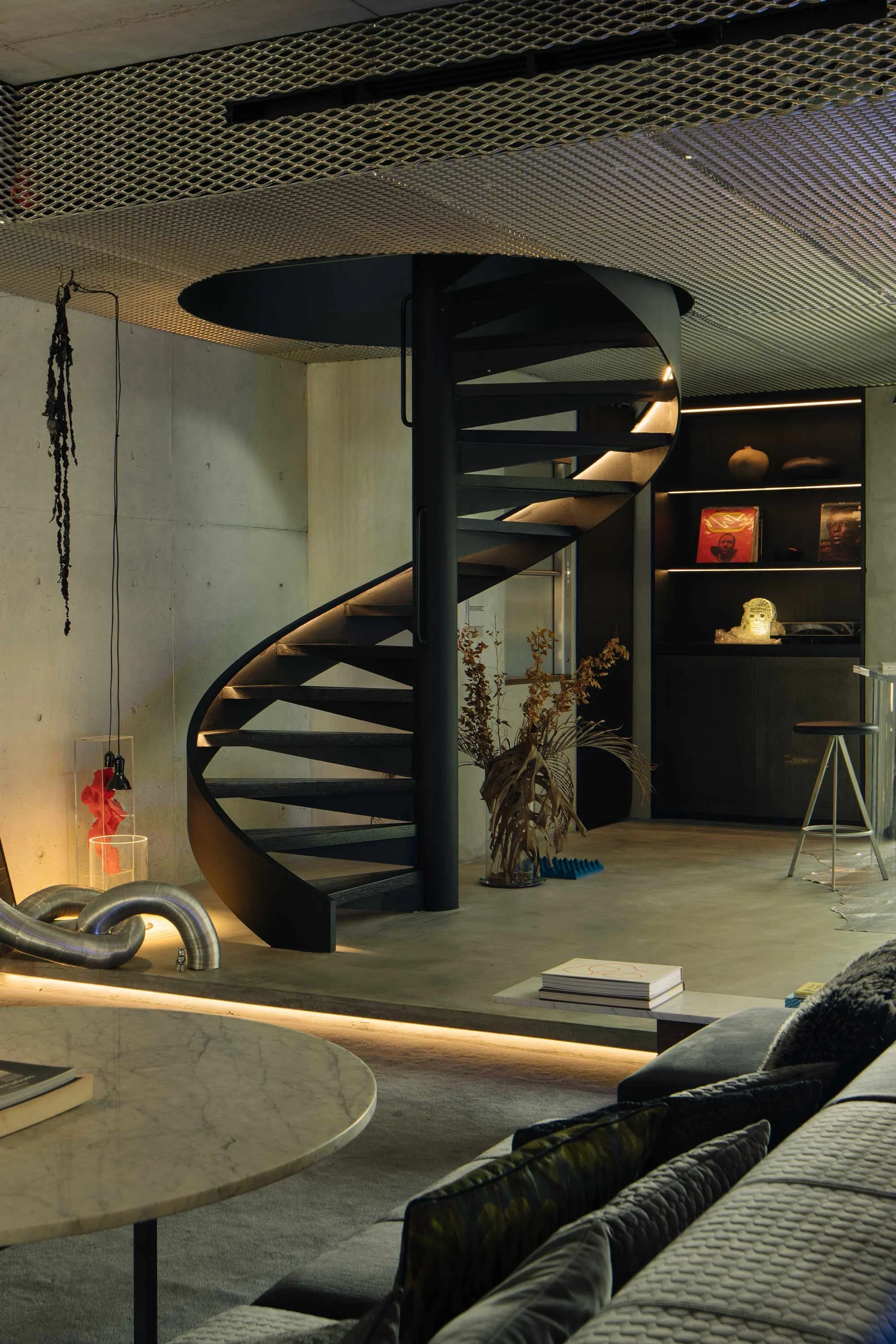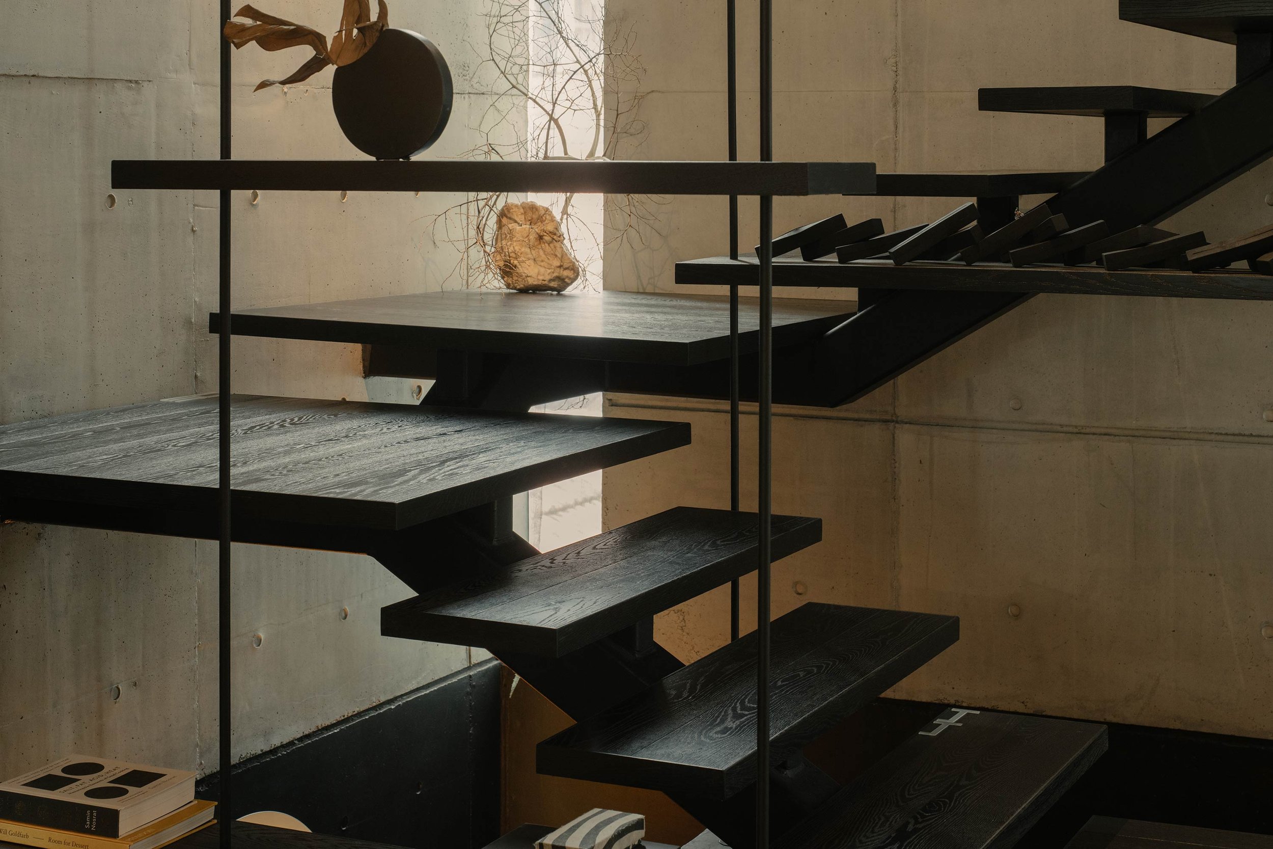 Even before entering the house proper, the scene is thick with mystery and a sense of discovery. A black panel conceals the guestroom door, placed along this entryway so that guests can have a self-sufficient silo without entering the main home. Through the door and up a darkened stairwell, one arrives at the second act: the black steps, defined like a dark cut-out in the floor, transition into screed concrete flooring and a stainless-steel kitchen.