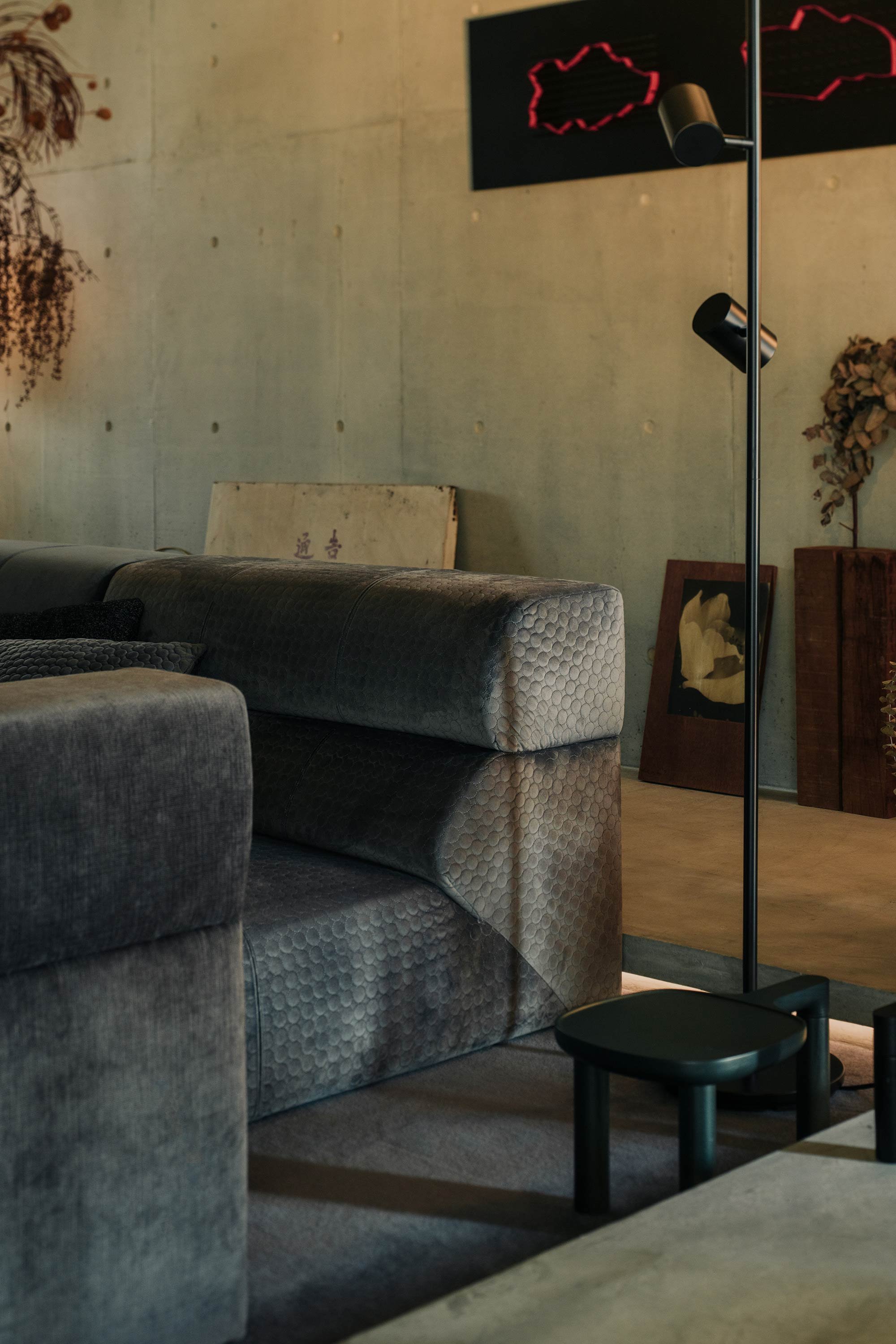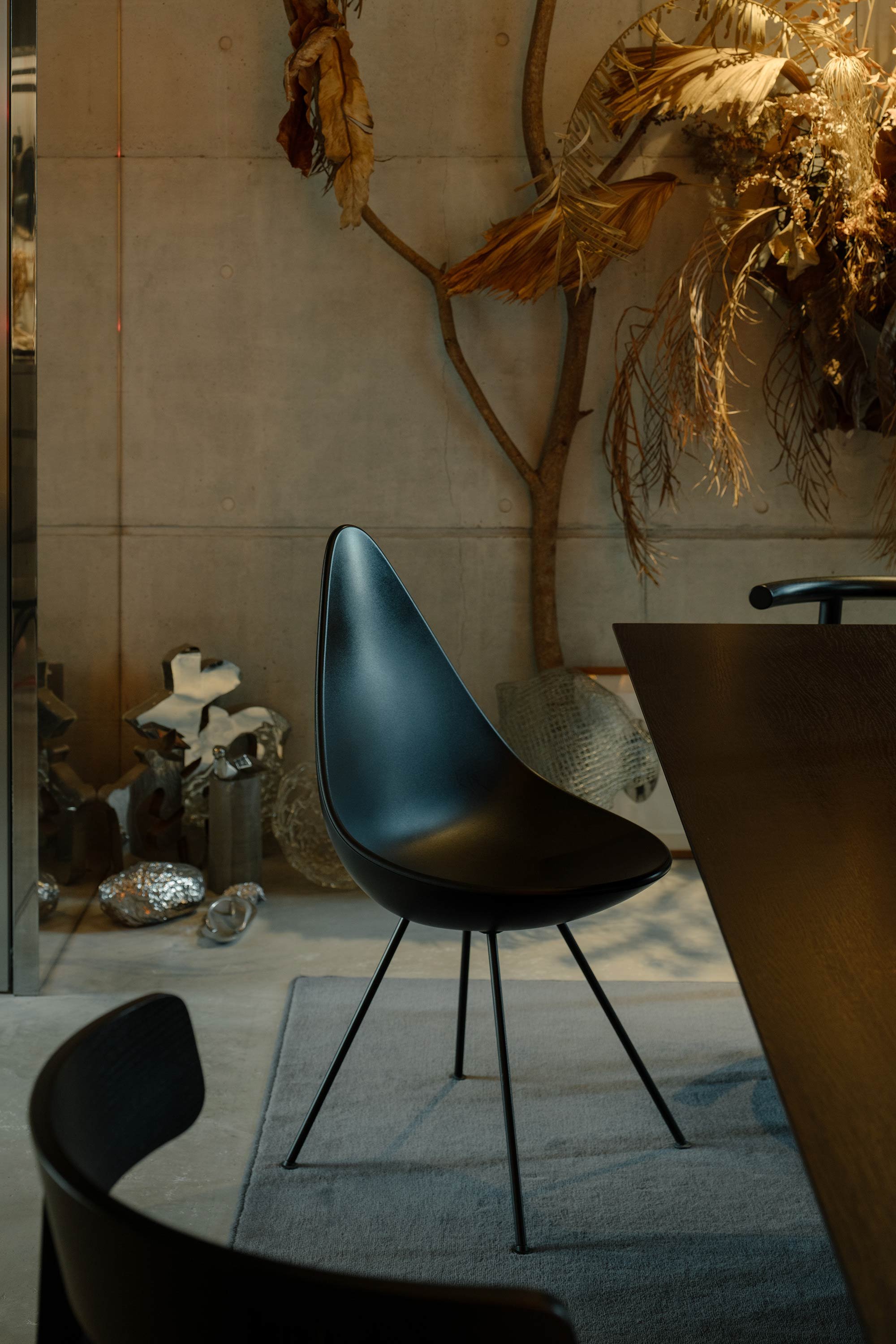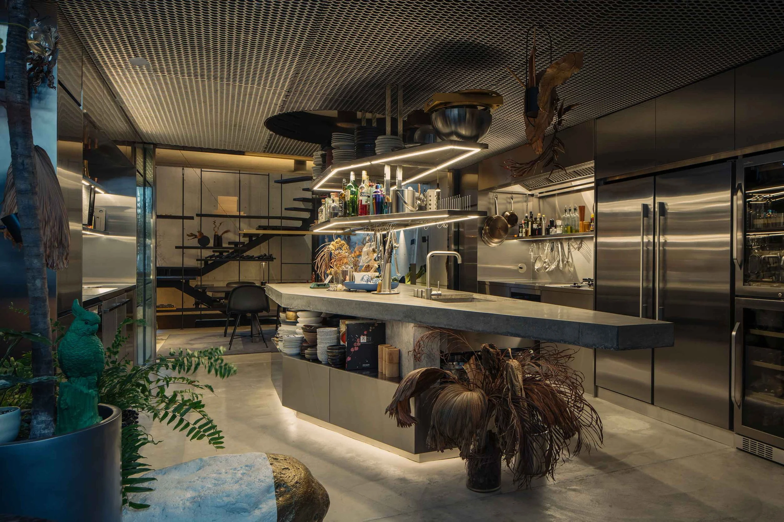 Even before entering the house proper, the scene is thick with mystery and a sense of discovery. A black panel conceals the guestroom door, placed along this entryway so that guests can have a self-sufficient silo without entering the main home. Through the door and up a darkened stairwell, one arrives at the second act: the black steps, defined like a dark cut-out in the floor, transition into screed concrete flooring and a stainless-steel kitchen.