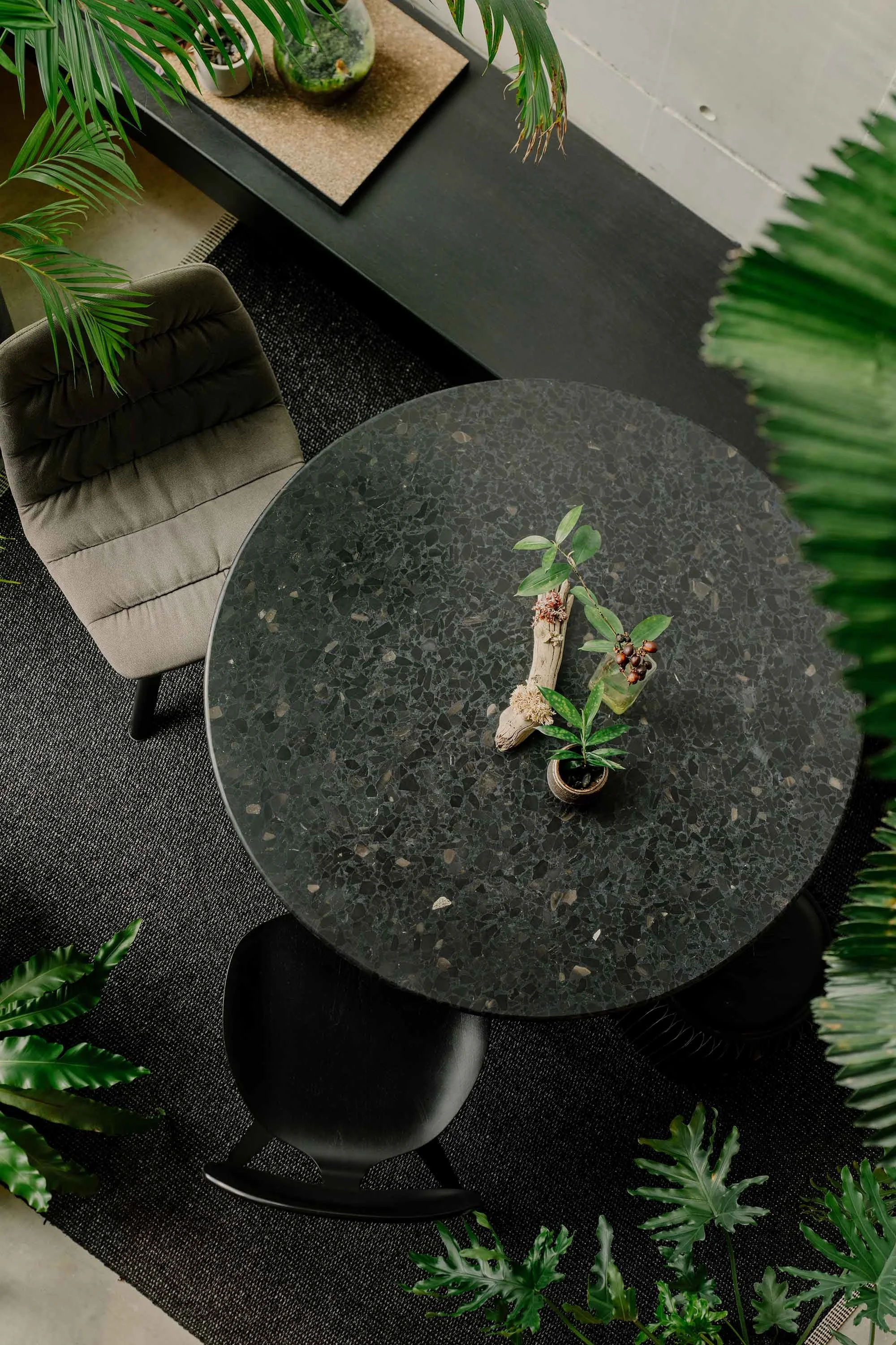 Colin explains that this idiosyncrasy gels with the streetscape, a hodgepodge of typologies that eschews the clear zoning typical of Singapore’s residential estates. The home’s unabashed strangeness is what melds it to the offbeat whole of the street; it is an enigma, augmented by an orchestrated trajectory or series of ‘acts’ like in a play. One enters the ground floor through a sort of proscenium between the garden and garage, flanked by black curtains that hide shoe storage, bicycles and other paraphernalia. Even the garden is a type of memento mori, animated as it is by sprawling Moringa, known as the ‘tree of life’ for its incredible durability, nutrient density and supposed protective properties.
