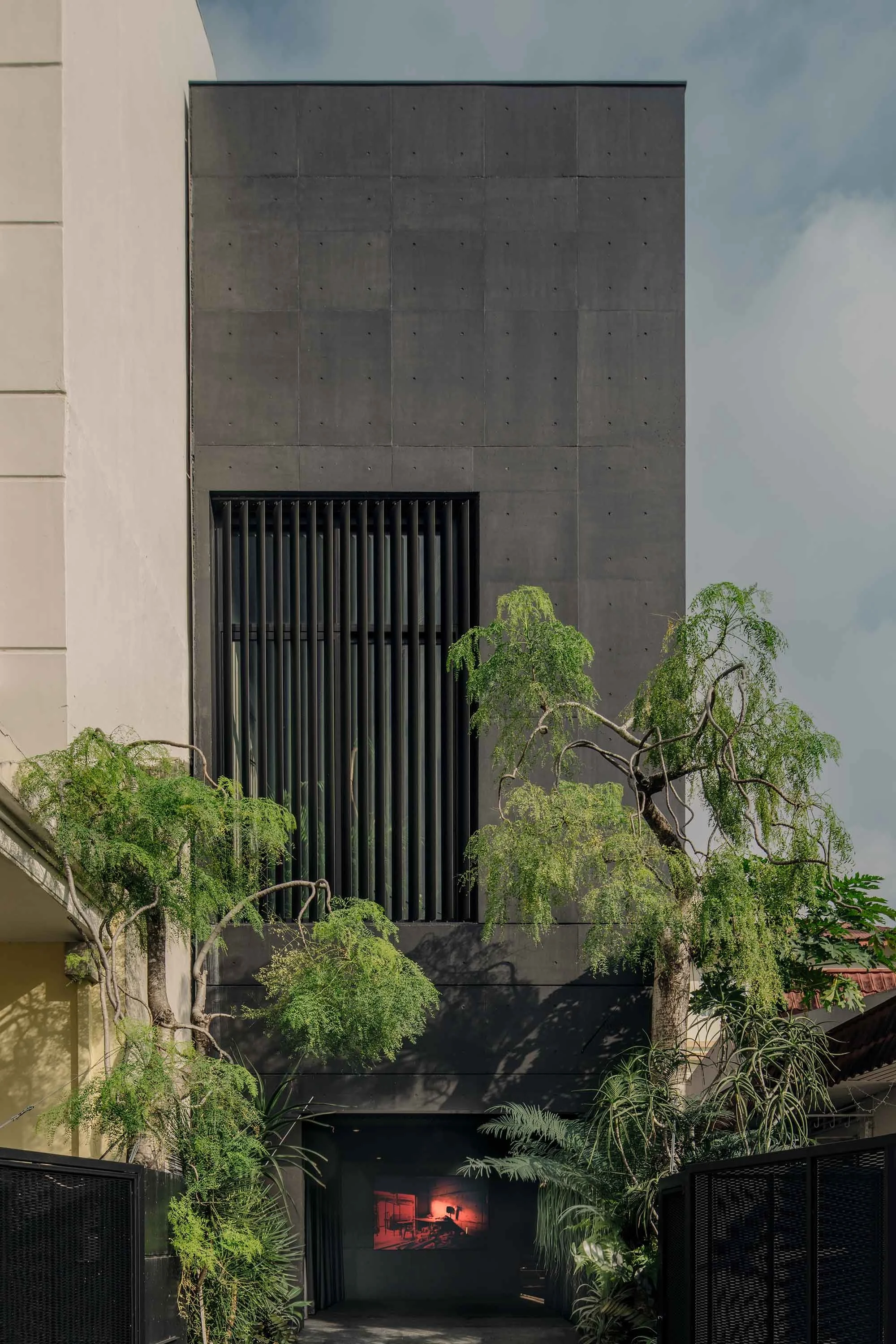 This philosophy refers to the Christian understanding of life on this earth as ephemeral and a mere ‘stepping-stone to the next life, however permanent it appears,’ explains MOD co-founder and design director Colin Seah. The architecture is designed with this idea in mind, but the multi-storey construct with only two slim windows — one in front and one behind — also considers the couple’s personalities. ‘The husband-and-wife owners are hyper-social on one level, but hyper-private on the other,’ notes MOD co-founder Joy Seah. Any demarcation of clear scale or domestic content is absent from the black-box structure. Is it even a house? Is it a theatre? A sub-station?