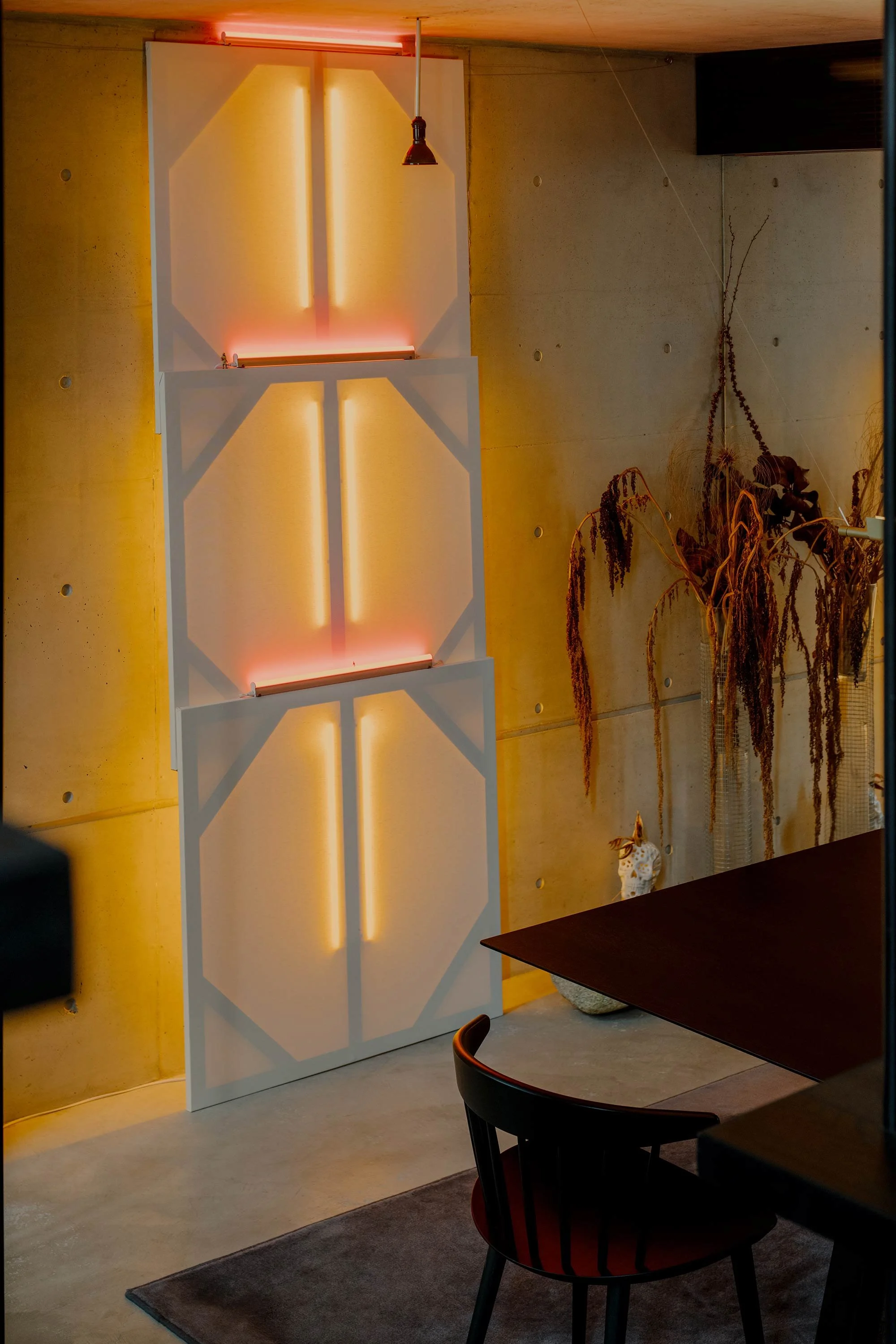 In the garage, a large photograph of the space taken during the construction stage glows cinematically on a red lightbox, a silent commentary on the dual sentiments of destruction and rebirth in the process of building the house. The notion is reiterated in a series of viewing portals on a raised metal platform before the main door, which offer a view into an installation of debris salvaged from the site’s former structure. The piece elevates the prosaic, creating art from dirt, and the result is not unlike looking into an archaeological dig at a museum.