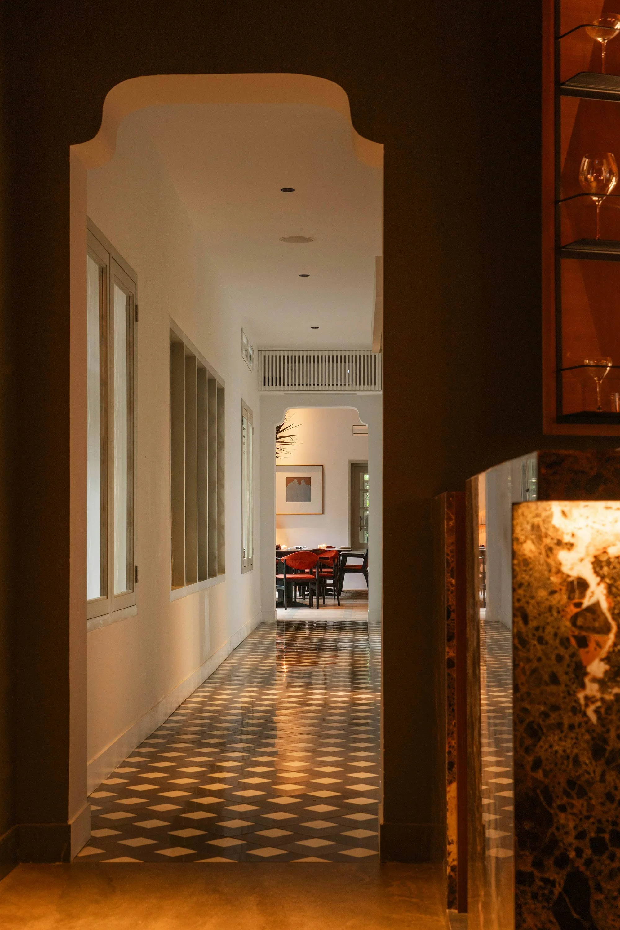 Preserving the colonial vernacular began with keeping the structure and identifying the original fixtures, such as timber casement windows and grilles. The team also sought to reclaim the home’s original intent, from restoring the outdoor corridor to bringing back elements that speak to that time, including the terracotta tiles along the walkway and reverse ogee arches in the corridor.