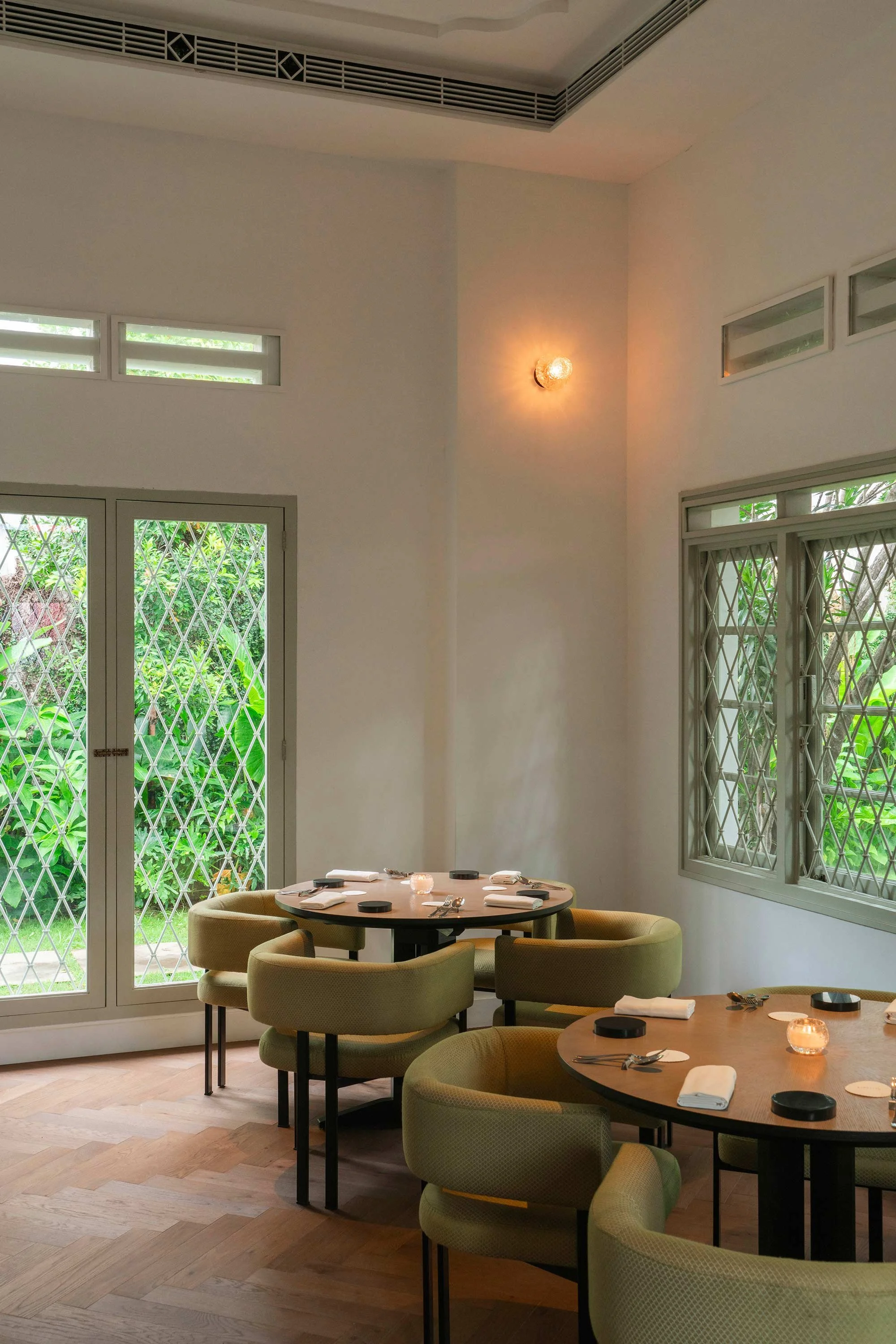 Even though most of the action takes place in the dining room, the duo exercised restraint with the interiors, setting the stage for the food to shine. Two dining zones have been crafted, each with its own palette: burnt orange upholstery and brown banquettes harmonise with the open kitchen’s verve, while chartreuse chairs and wooden flooring cleave to the garden view, in what was the former porch space.