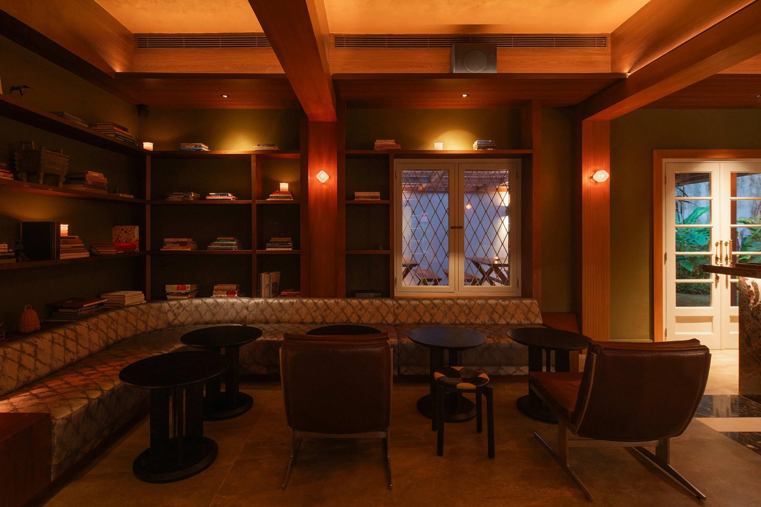 The library, where guests can linger for drinks, lets loose a little with a glistening taffeta fabric, golden stucco ceiling and striking dark Emperador marble. Despite the different vibes, the entire restaurant is subtly hemmed together by lattice patterns, vintage fixtures and teak veneer.