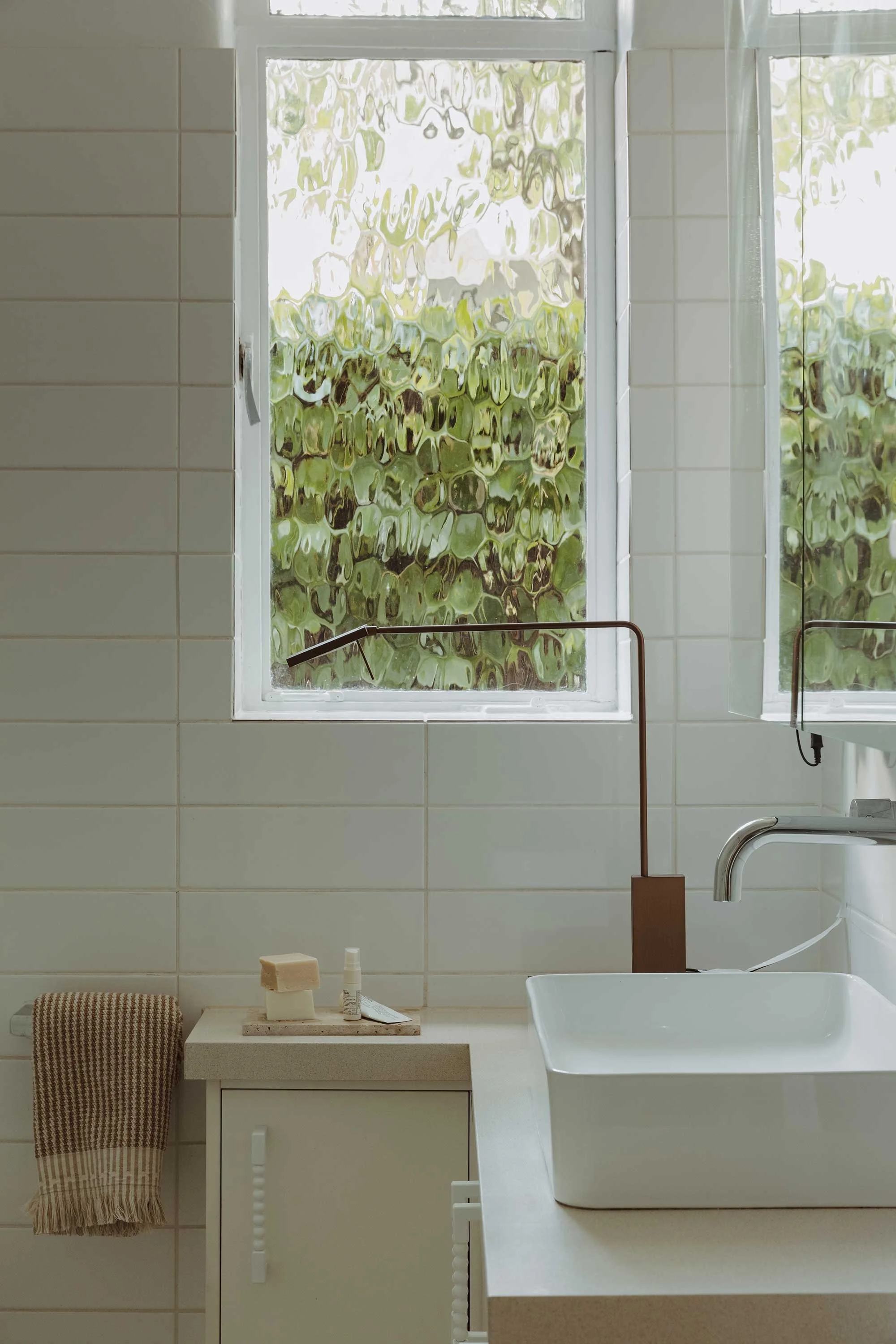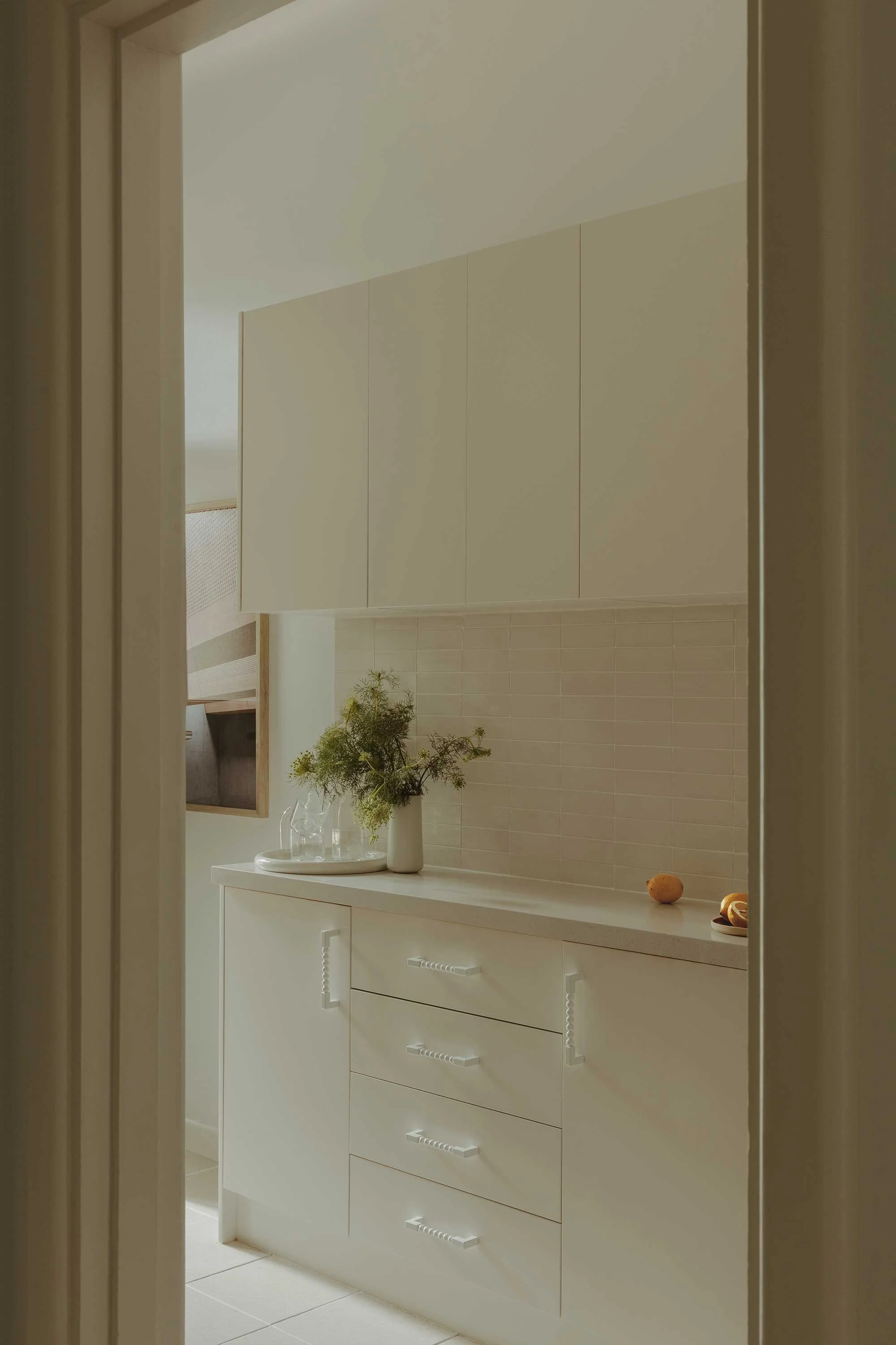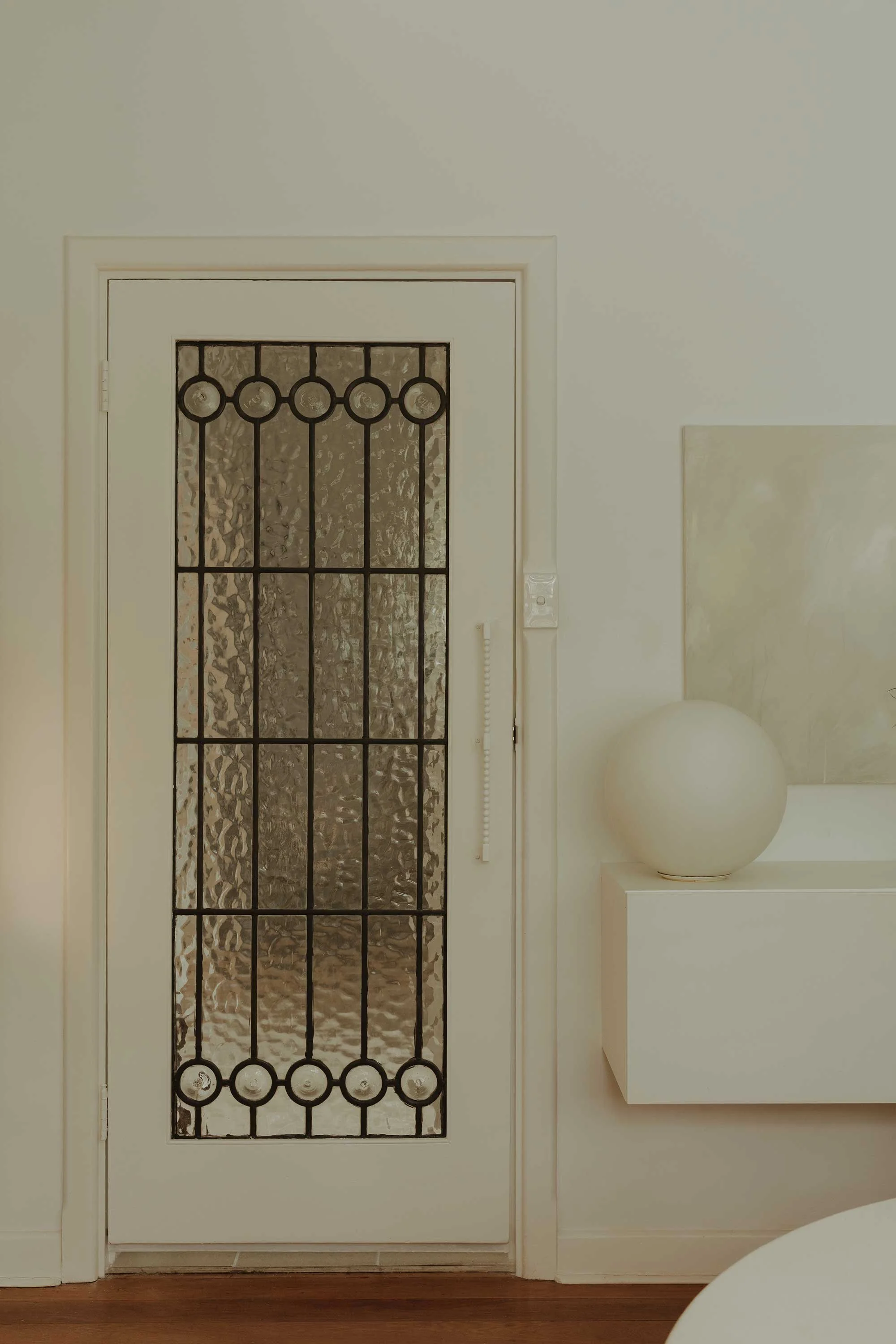To honour the building’s specific proportions, Marshall established strict rules for the interiors. ‘In terms of geometries the style was all about long bands and spheres,’ she says. ‘So, when making any selection I was thinking, “How do we bring that back?” All the hardware, all the fixtures had to adhere to that language. Is it long and does it either have a rounded edge or is there some kind of rounded geometry to it?’ She reintroduced chrome fittings throughout the apartment, adhering faithfully to archival research, despite it not being her typical preference in contemporary practice. In the kitchen, playful white spherical handles provide a stark, functional contrast. Another pivotal addition was a salvaged 1930s stained-glass door, sourced from a neighbouring property.