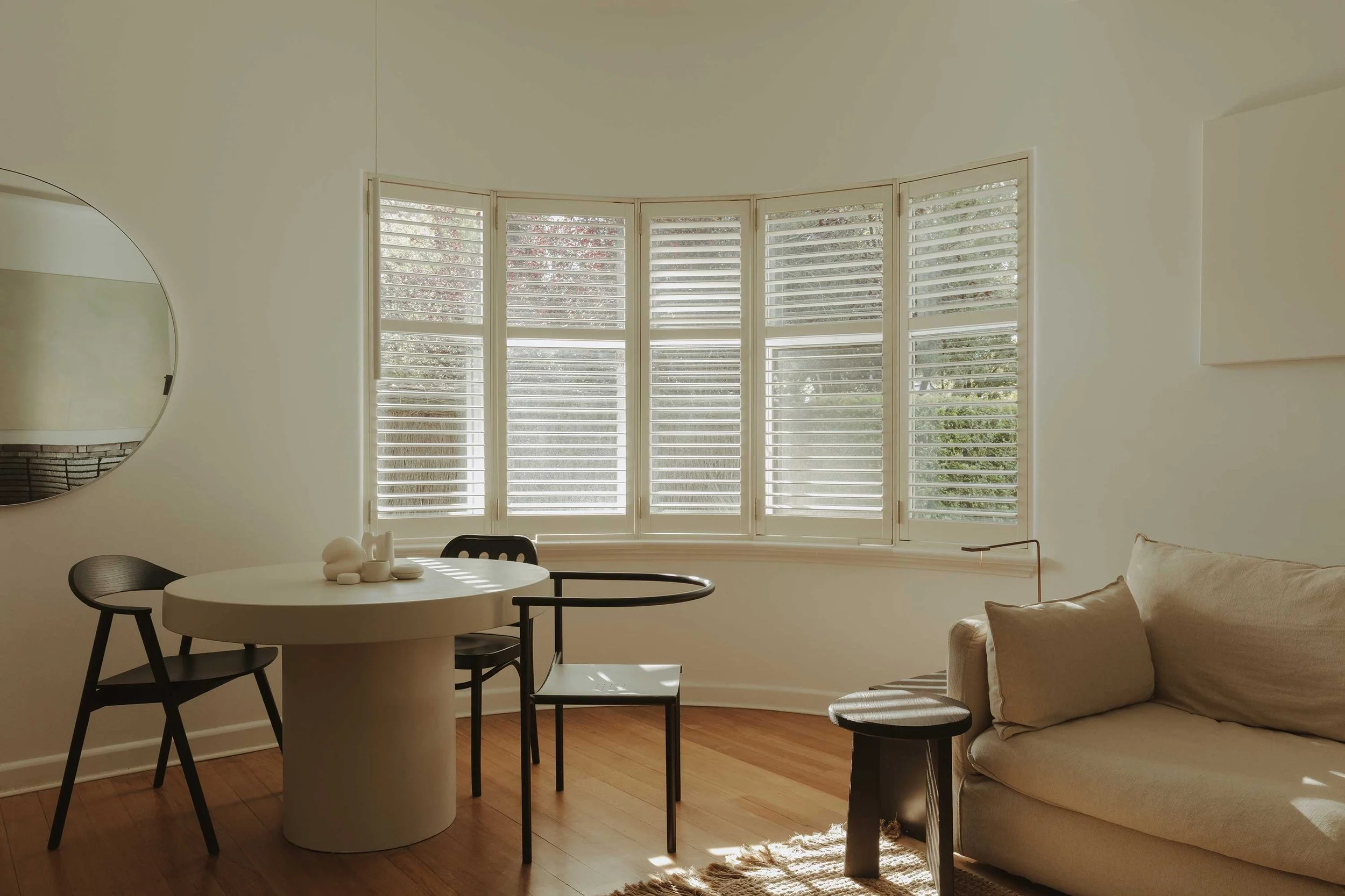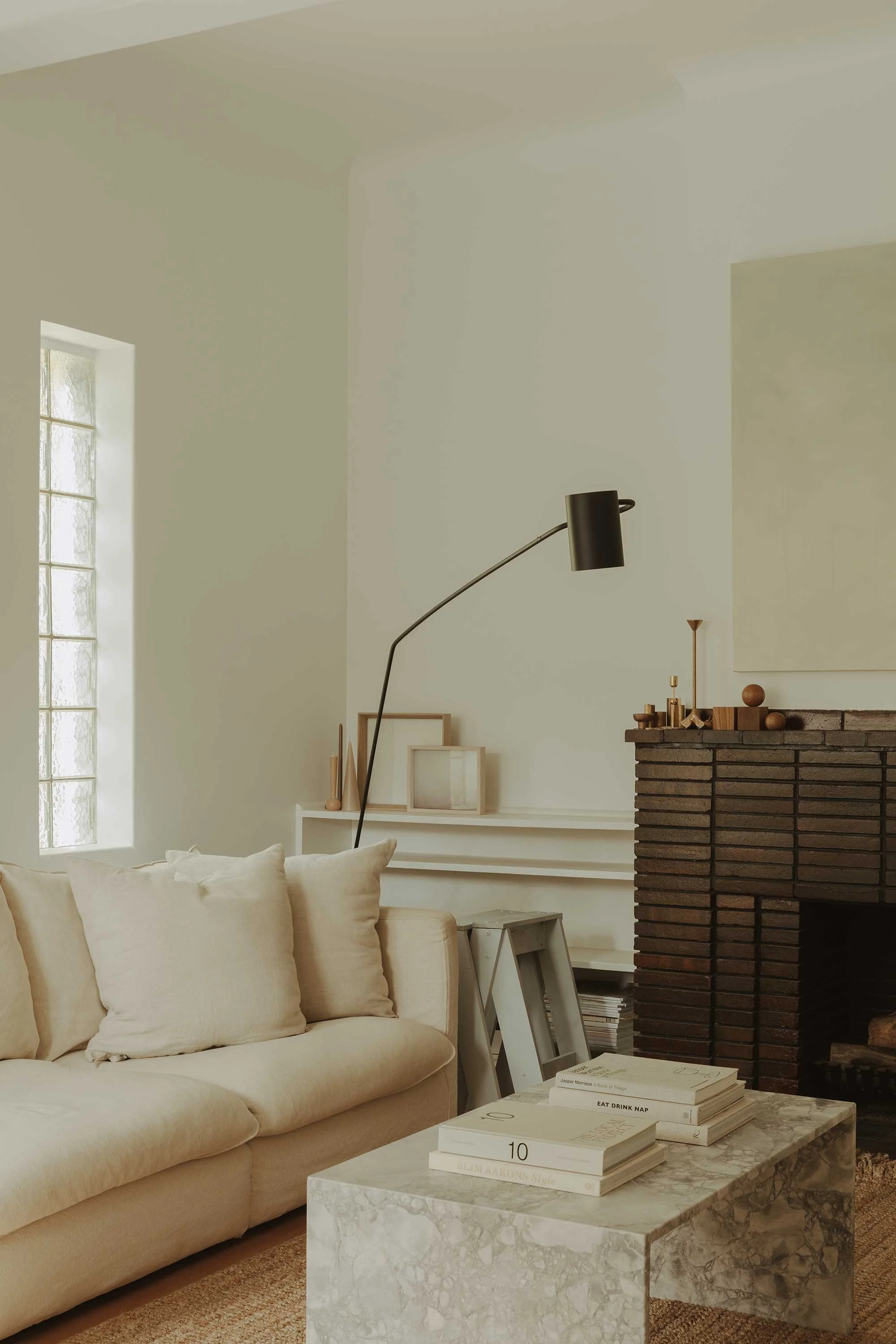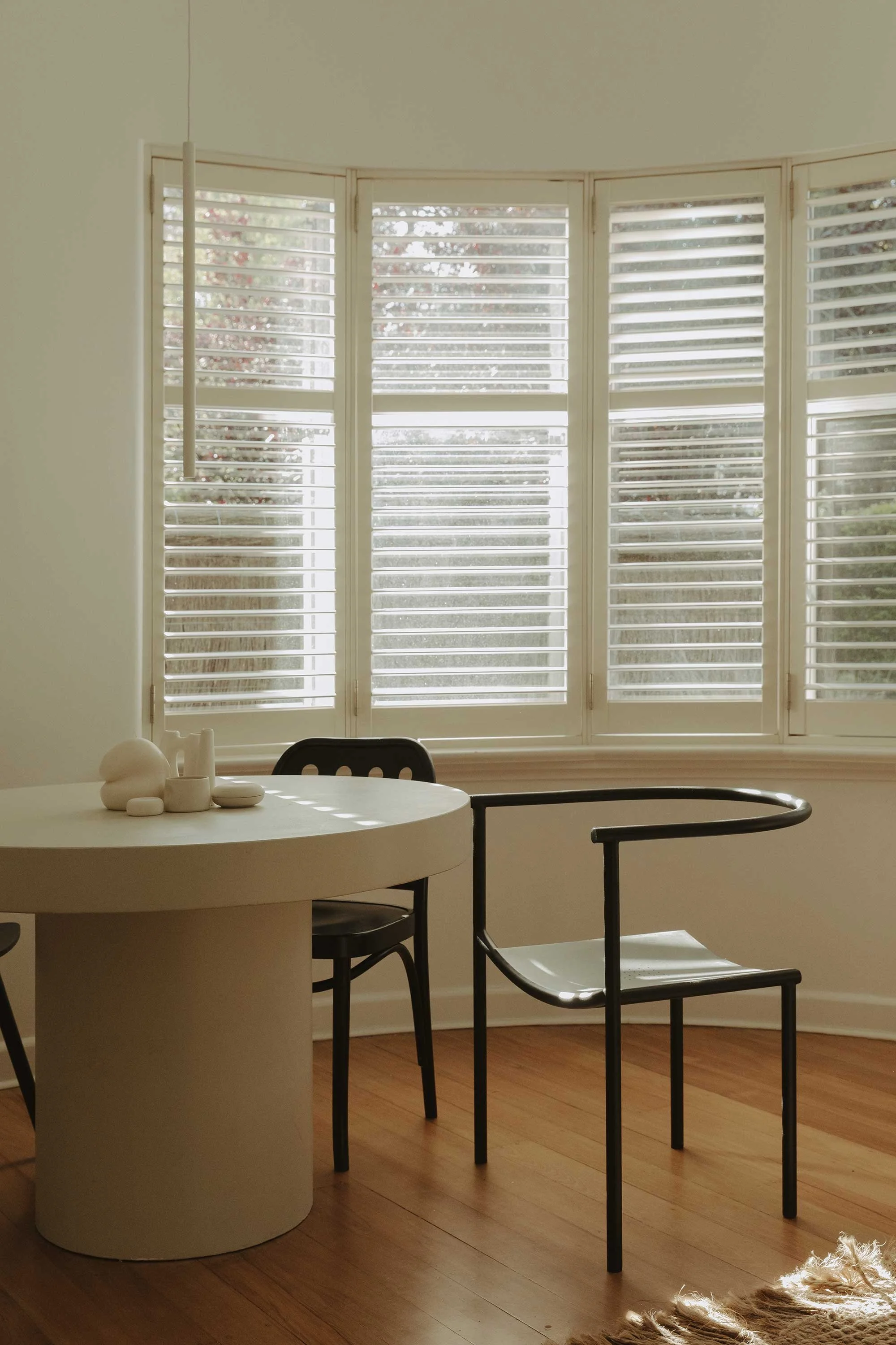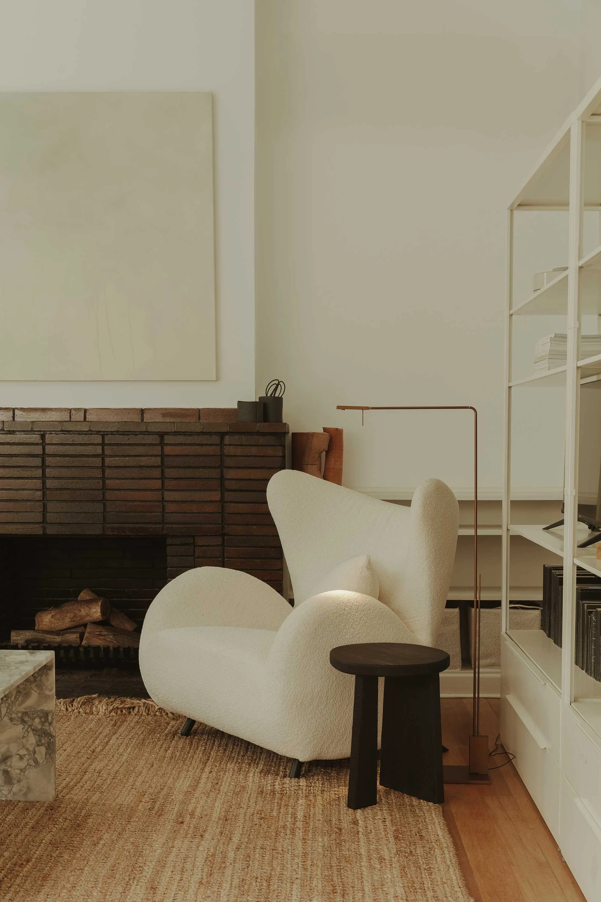 Inside, the architecture's inherent sweeping curves dictated the design language. Marshall was particularly drawn to the seamless transitions between surfaces. ‘There are no cornices,’ she explains. ‘It's just continuous plaster that wraps around beams, around the fireplace, around walls.’ Decades of incremental, stylistically confused renovations — including anachronistic diamond-patterned lighting — were stripped away to reveal a calmer foundation. The original concrete beams, an innovation of the era, allowed for a surprisingly generous six-and-a-half-metre living room and higher ceilings devoid of modern downlights.