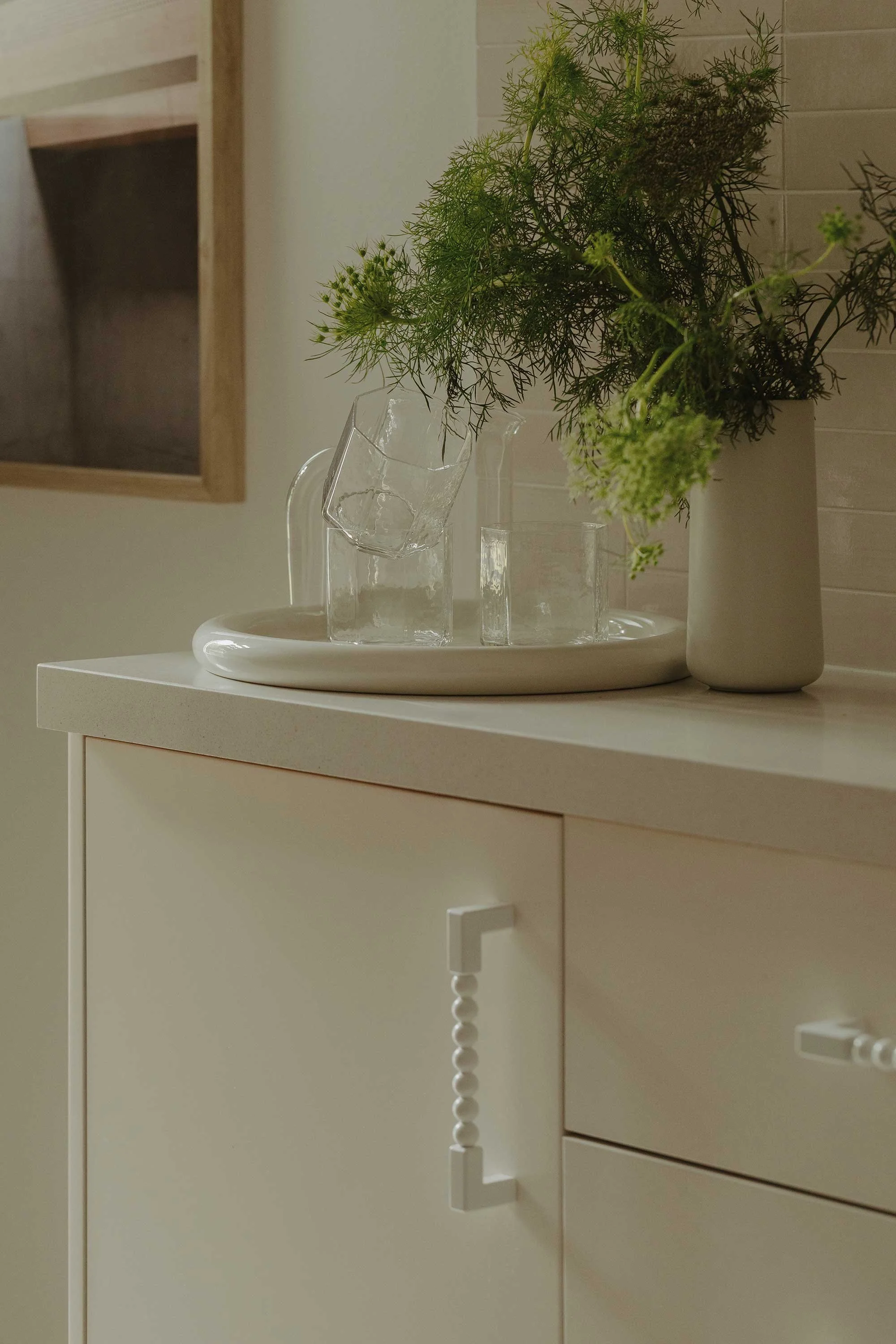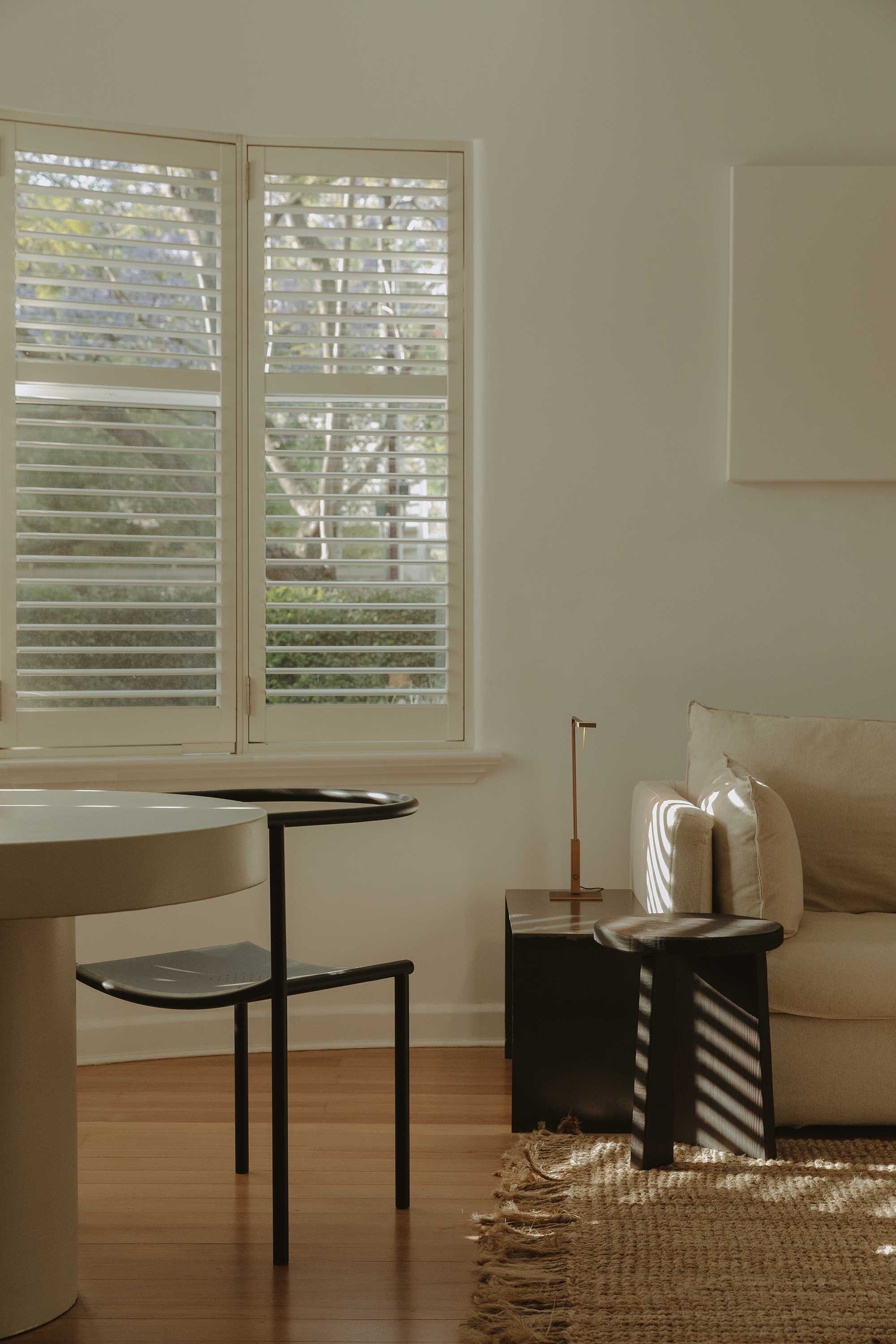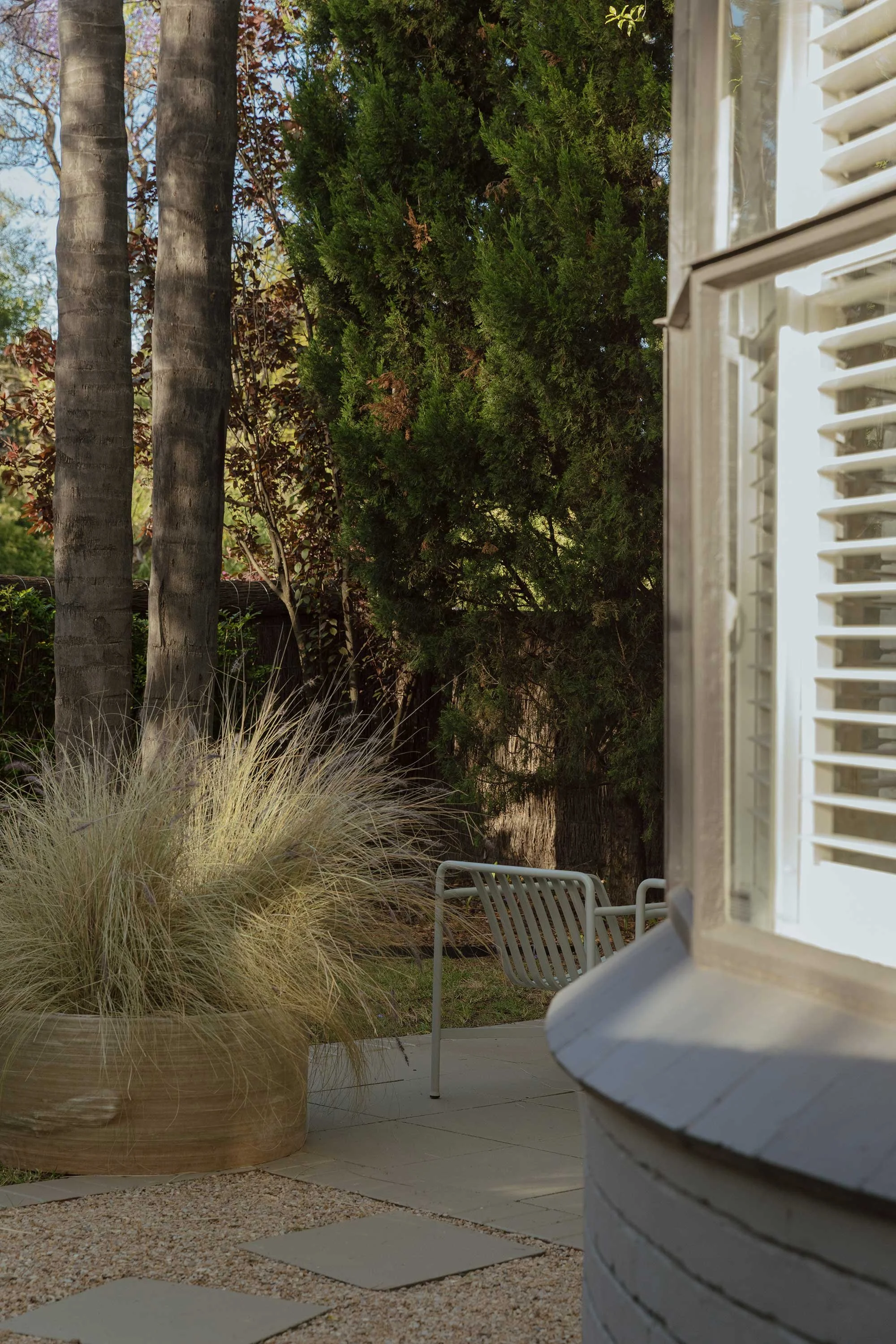 The completed project is an exercise in restraint, where small interventions allow the original structural volumes to breathe. Rather than rely on heavy overhead lighting, Marshall utilised intimate pendants and lamps to complement the natural light and maintain a soft atmosphere. Even the private garden, complete with heritage-listed palm trees, reflects this careful editing. For Marshall, the success of Millswood Moderne lies in its quietness. ‘There is a boldness in it, but the boldness is in its simplicity,’ she reflects. ‘It’s in the lack of details that there’s detail.’