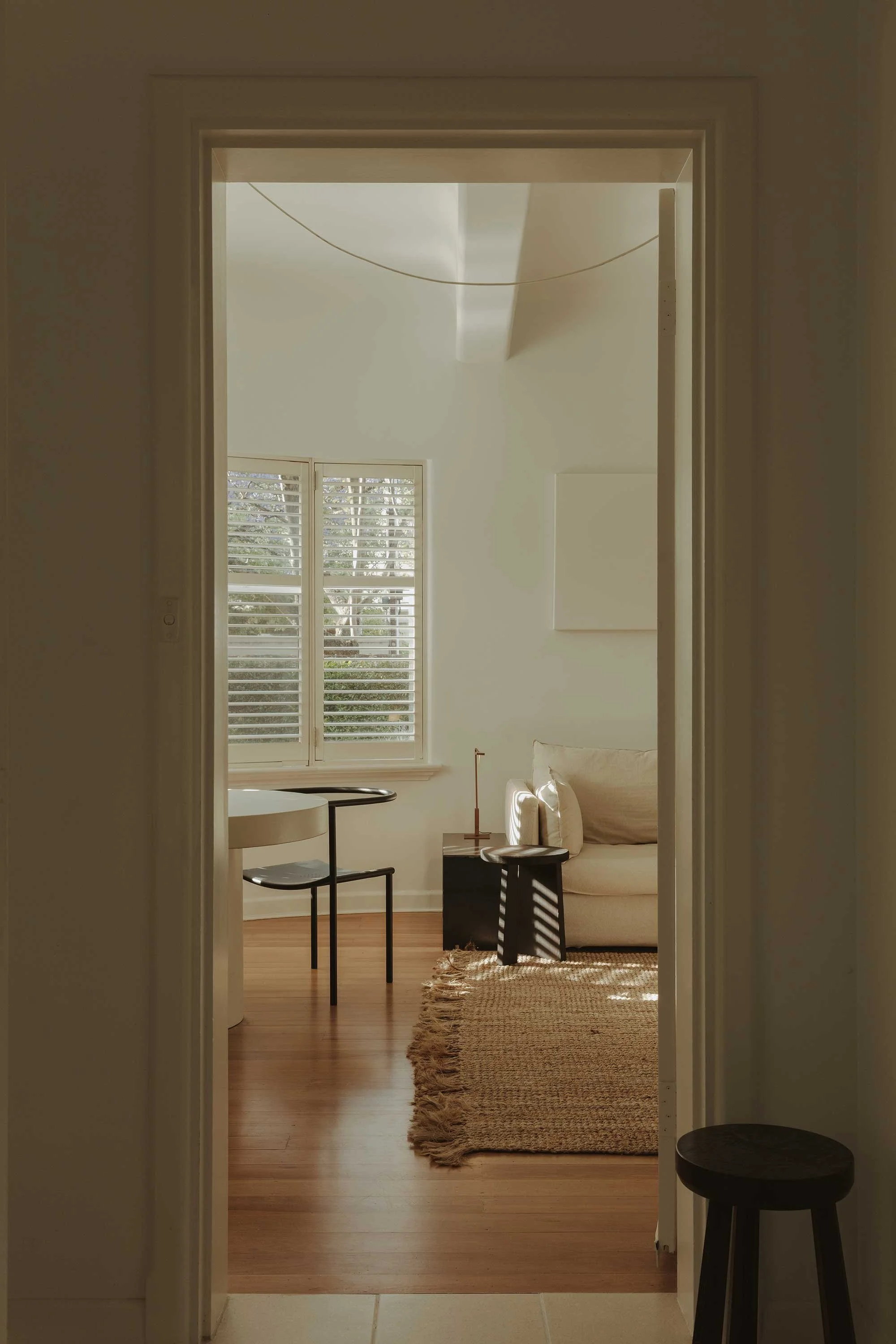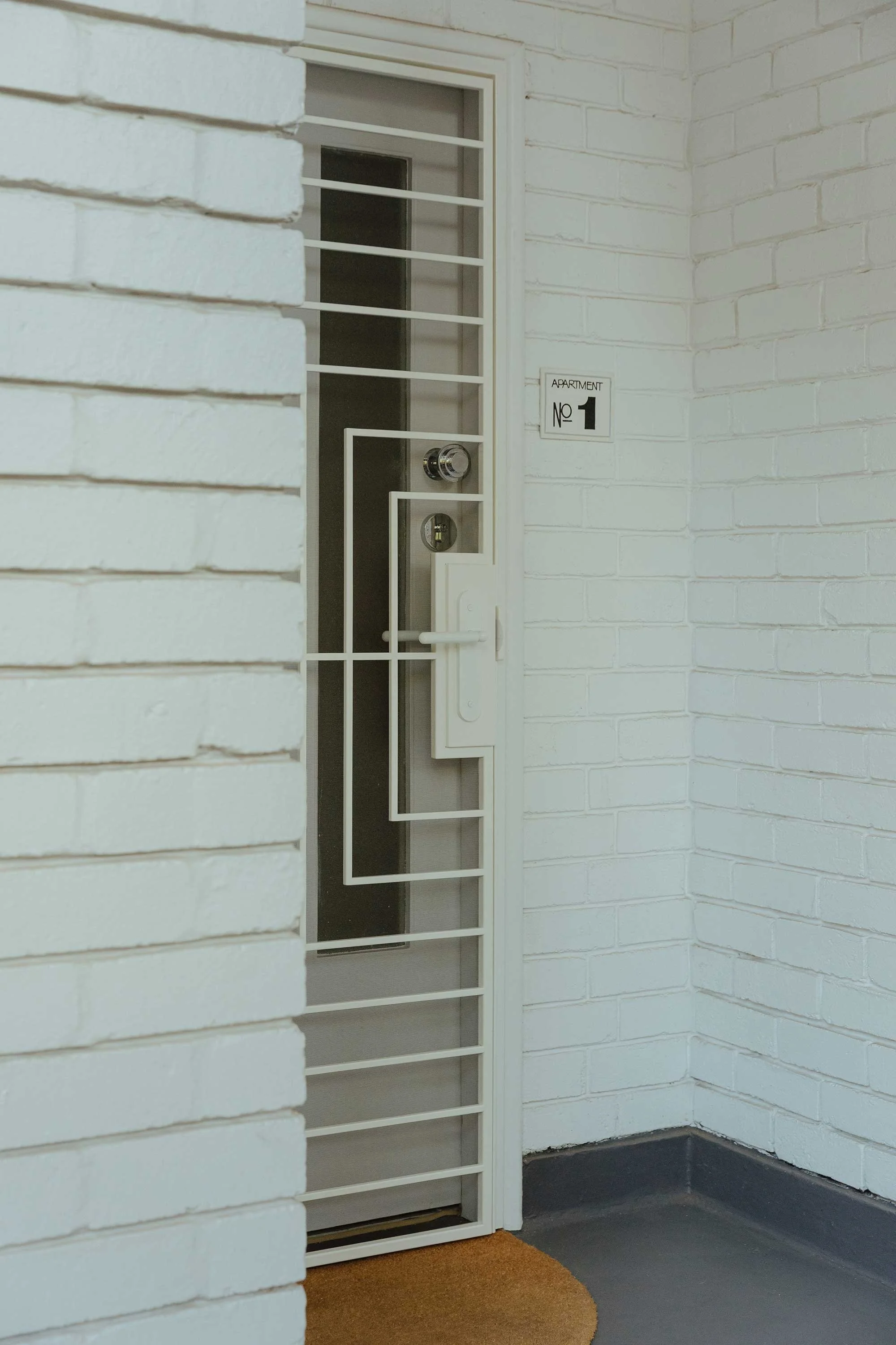 The restoration process began with patience. Marshall lived in the space for a year to observe its natural light and flow before initiating changes. Central to the exterior reinstatement was a collaboration with Adelaide metal artist Nat Penney. Together, they iteratively prototyped a custom geometric screen door and a sculptural building sign. Marshall refers to the screen door as ‘the handshake with the house’ — the crucial first physical interaction that sets the tone for the interior.
