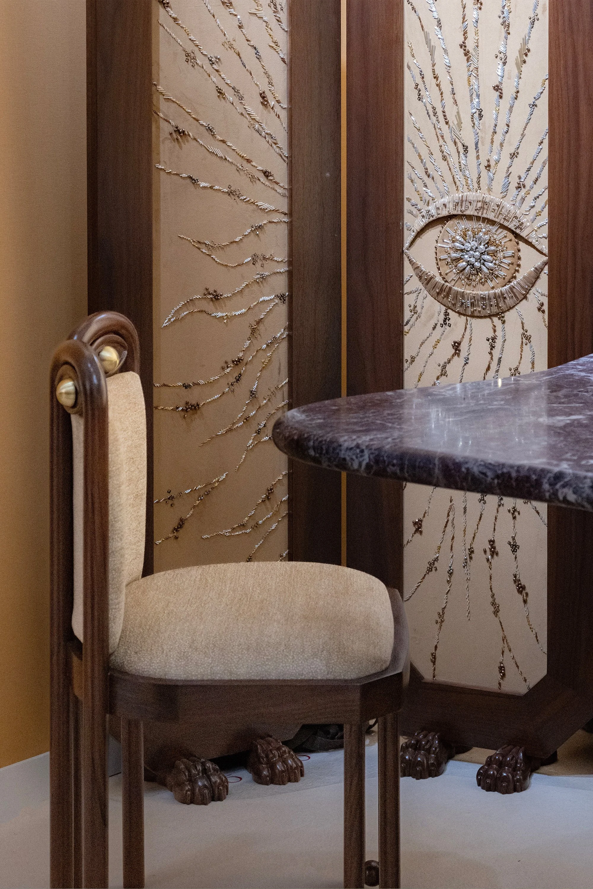 The fair moved easily between centuries-old craft traditions and contemporary experimentation. At the stand of StudioSoSlow, co-founder Shenjun Ge presented a lighting structure derived from traditional Chinese kite making techniques. In the works, thin strips of bamboo, cut using ancient methods, create a lattice that can expand dramatically in scale, from small lighting pieces to towering installations. Previous iterations have reached architectural proportions, including a six-metre version created in collaboration with Valentino for Lunar New Year at Shanghai’s Tianhou Palace. ‘I wanted to share this elegant, traditional Chinese craft, without the “oriental gaze”, translating it into a modern language that’s accessible to younger generations,’ Ge explained.