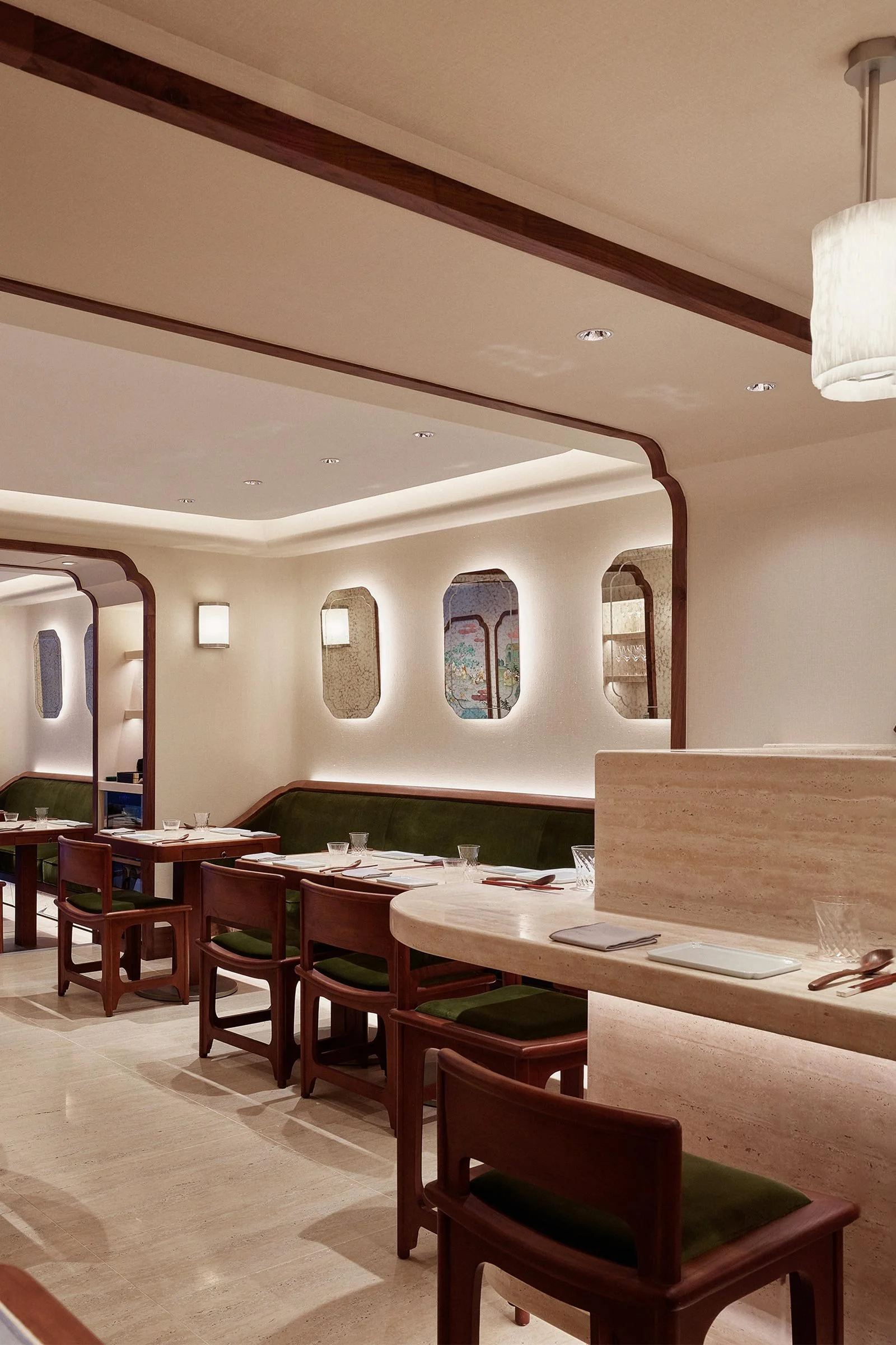 Combining Chinese and Western elements, Mora’s contemporary design subtly reflects the context of the neighbourhood and Lau’s Chinese and French culinary background. On beige travertine floors stand travertine-topped walnut dining tables and modern interpretations of a typical Ming dynasty chair. Wooden wall arches divide the restaurant into three sections and elegantly frame the space, evoking a traditional Chinese garden. At the entrance, a wooden reception counter inspired by a Shanghai Art Deco wardrobe welcomes guests, while behind, a bespoke triptych by LALA CURIO depicts the history of tofu in a traditional Chinese painting style. Quiet details like the sofa’s curled feet add a European touch to the space.