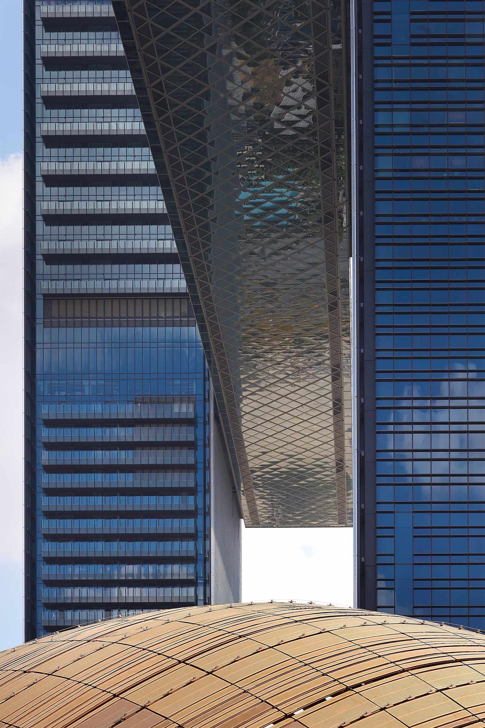 The building was to become an anchor in a developing district between downtown and the airport. And similarly but at a micro level, the connectivity with the surrounding noodle soup of roads and the need for multiple functions with separate entrances made for a puzzle the architects had to solve. Still, the main engineering feat was the horizontal piece, which is cantilevered a full 66 metres beyond the tower’s edge, and took 12 days to lift into place. It’s no small feat, and does indeed induce wonder and not a little apprehension (in my case, at least) in person.